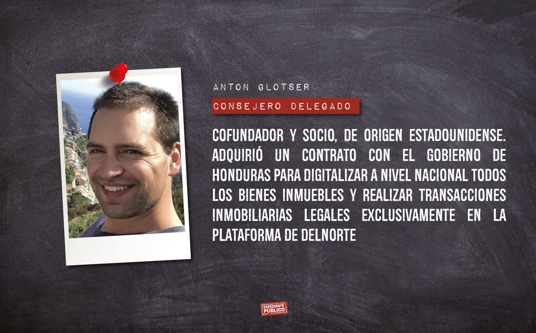 En la página web de la empresa DelNorte, Anton Glotser aparece como cofundador y socio. En su perfil se indica que ha pasado más de cuatro años construyendo la empresa y desarrollando conexiones políticas en América Latina y el Caribe. Además, se destaca que adquirió un contrato en Honduras a escala nacional para digitalizar todos los bienes inmuebles y realizar transacciones inmobiliarias legales exclusivamente en la plataforma que dirige.