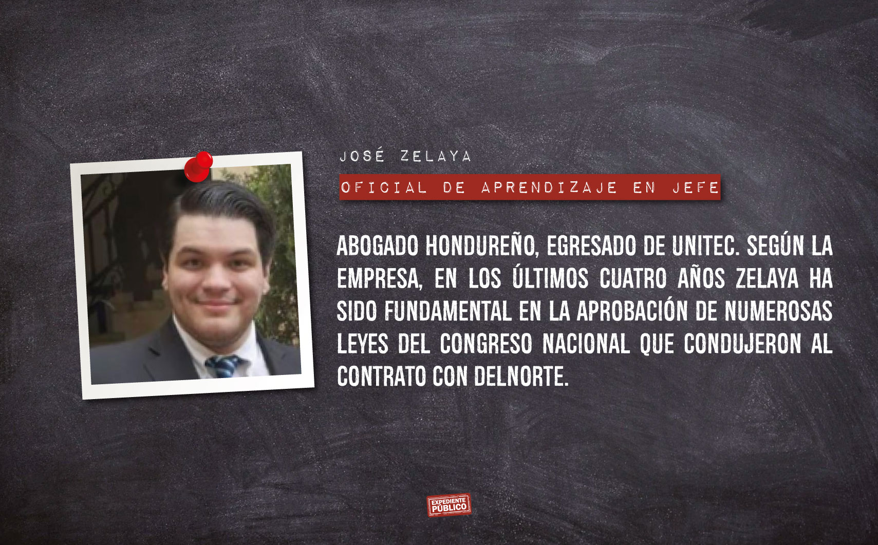 Como parte del equipo de ejecutivos aparece José Zelaya, quien es presentado como un abogado con licencia en Honduras que se graduó de la Escuela Americana en Tegucigalpa y de la facultad de derecho en Unitec.
