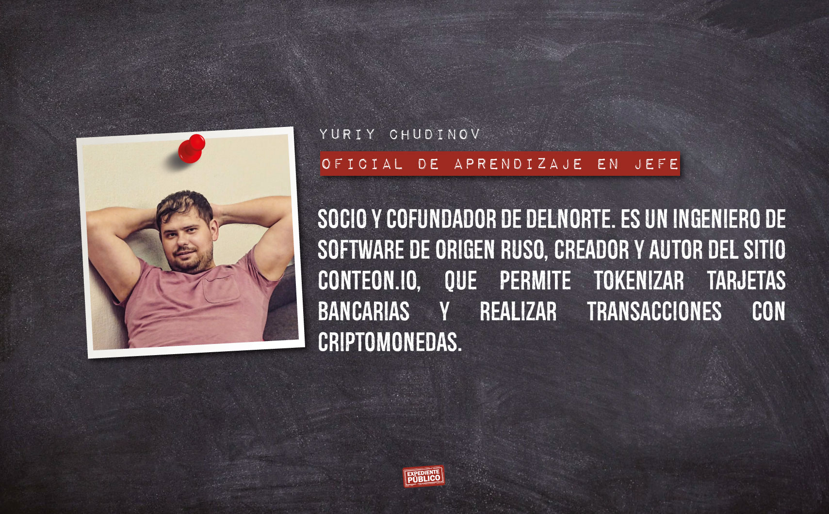 Yuriy Chudinov es también socio y cofundador de DelNorte, que lo promociona como ingeniero de software. Además, aparece como coautor y creador de una nueva clase de dispositivo operativo que permite realizar transacciones seguras con criptomonedas. Es licenciado en Matemáticas e Informática y durante un tiempo trabajó en el banco PUMB (Primer Banco Internacional de Ucrania) como especialista en automatización y mantenimiento de negocios.