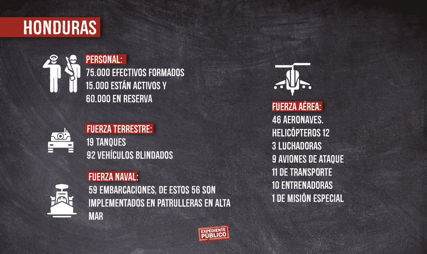 Expediente Público no encontró información sobre el equipo y armamento en las Memorias Anuales y las revistas “Ejército Defensa Nacional” del 2007 al 2020, elaboradas por la institución. Los datos que proporcionan son de las incautaciones de drogas, patrullaje u operativos de salvamento, así como los discursos de “agradecimiento” del general Julio César Avilés, jefe del Ejército, a Ortega por “el respaldo incondicional” con recursos presupuestarios para fortalecer las capacidades militares a nivel de mar, tierra y aire.