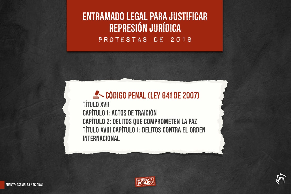 En contra de 20 de los recientes opositores detenidos, el régimen a través de los fiscales les acusan de «traición a la patria», con la llamada Ley de los Pueblos, por supuestamente gestionar sanciones con la comunidad internacional contra funcionarios y el gobierno de Ortega y Murillo.