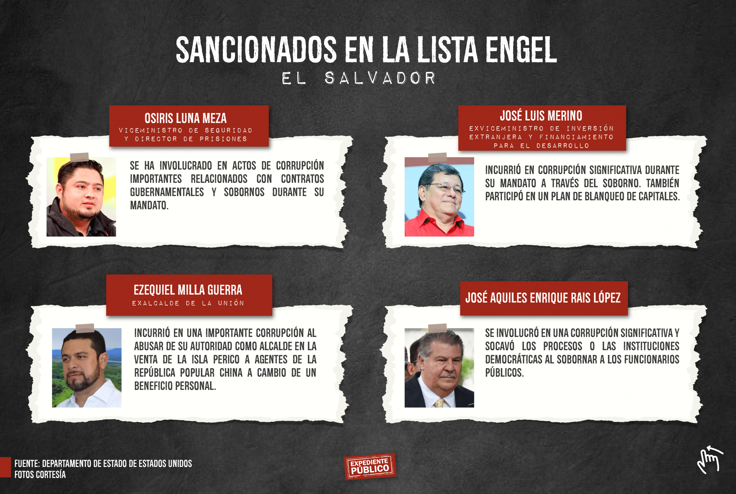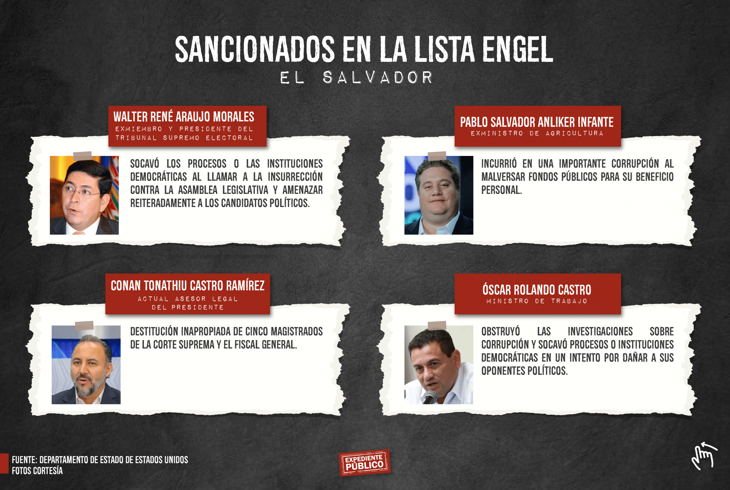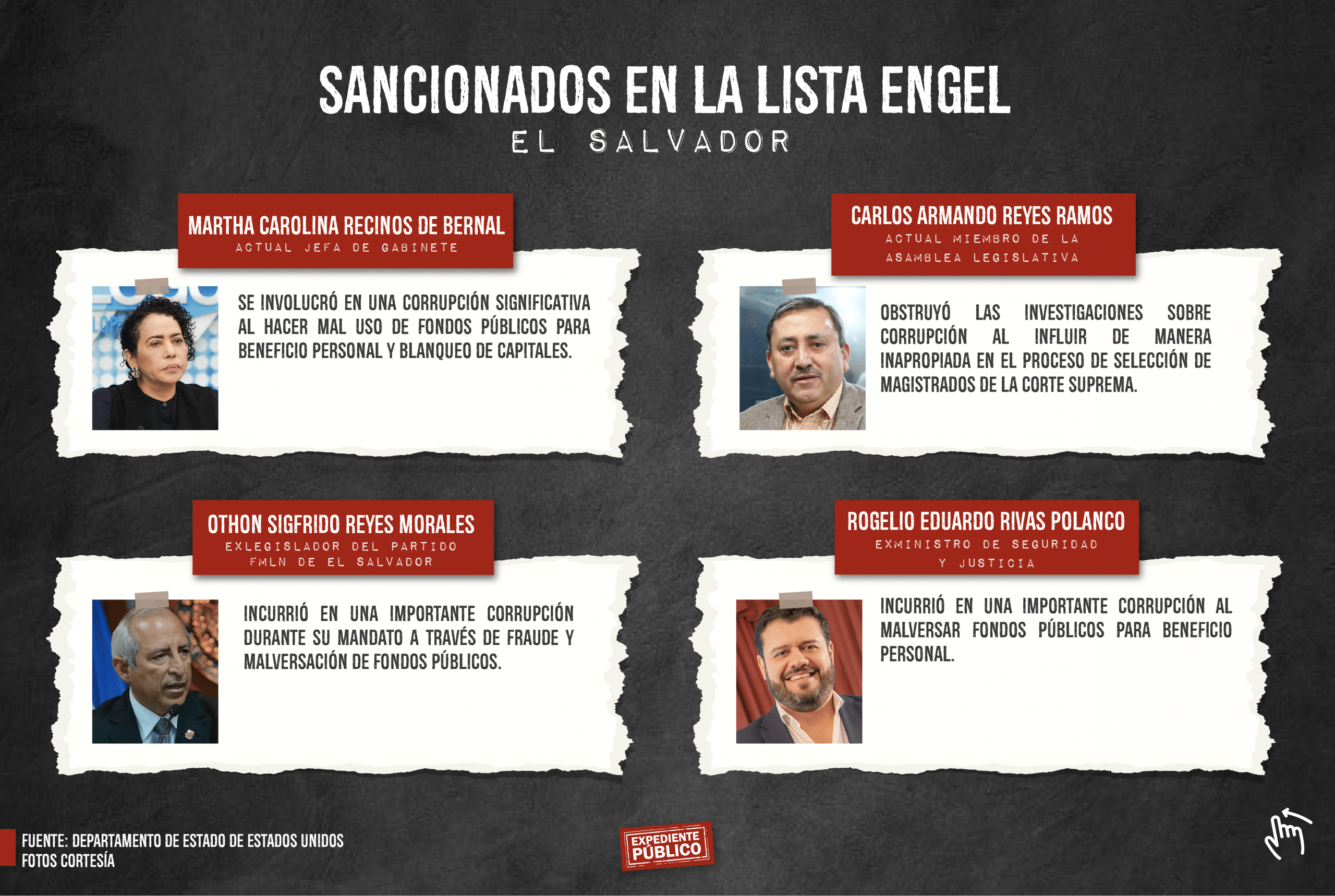 Estados Unidos divulgó este jueves la llamada “Lista Engel”, destinada a castigar a actores políticos corruptos y que socavan la institucionalidad democrática en el Triángulo Norte de Centroamérica: 34 funcionarios, empresarios y políticos de El Salvador y Guatemala han sido incluidos en la Lista de Actores Corruptos y Antidemocráticos, parte de la Ley de Mejora del Compromiso del Triángulo Norte.