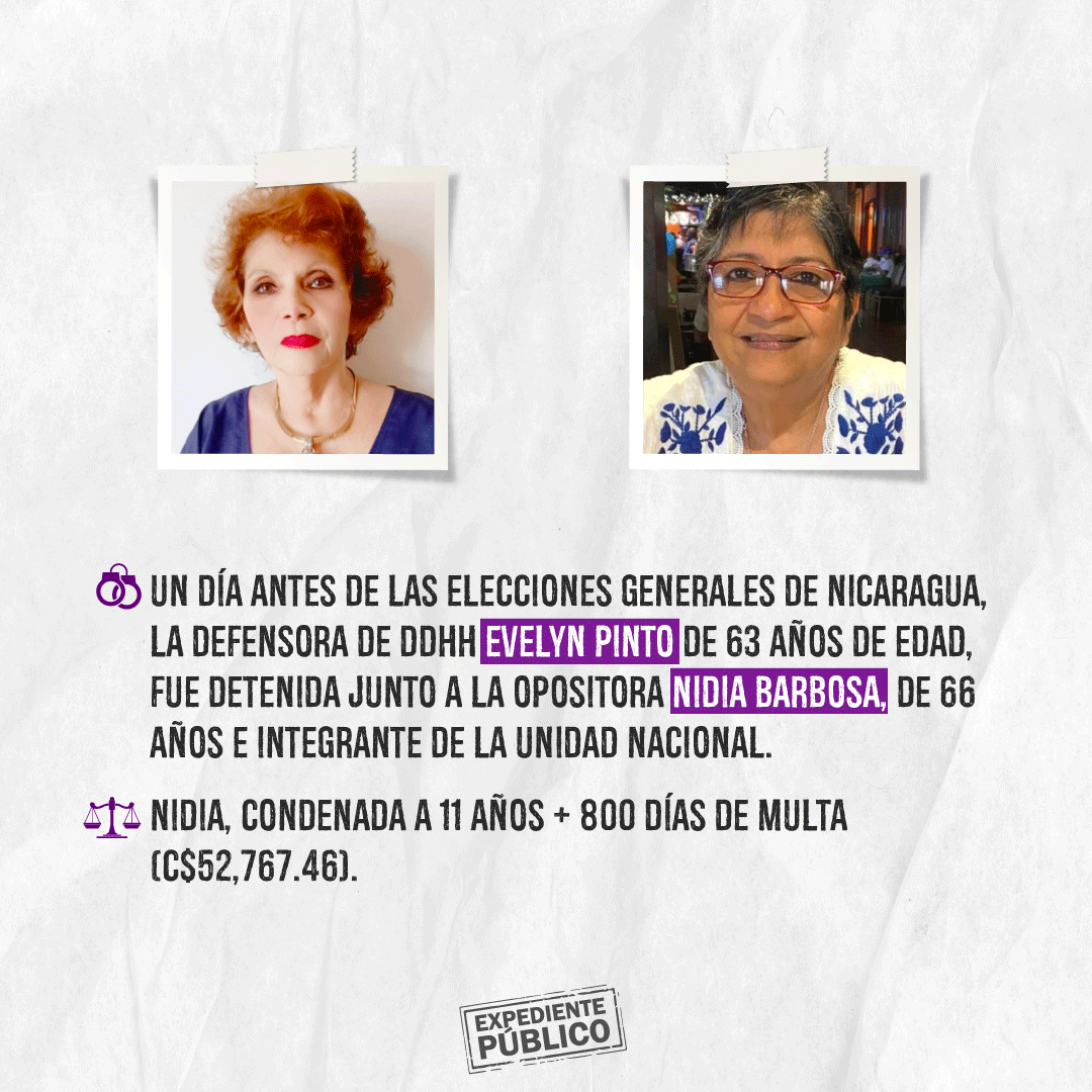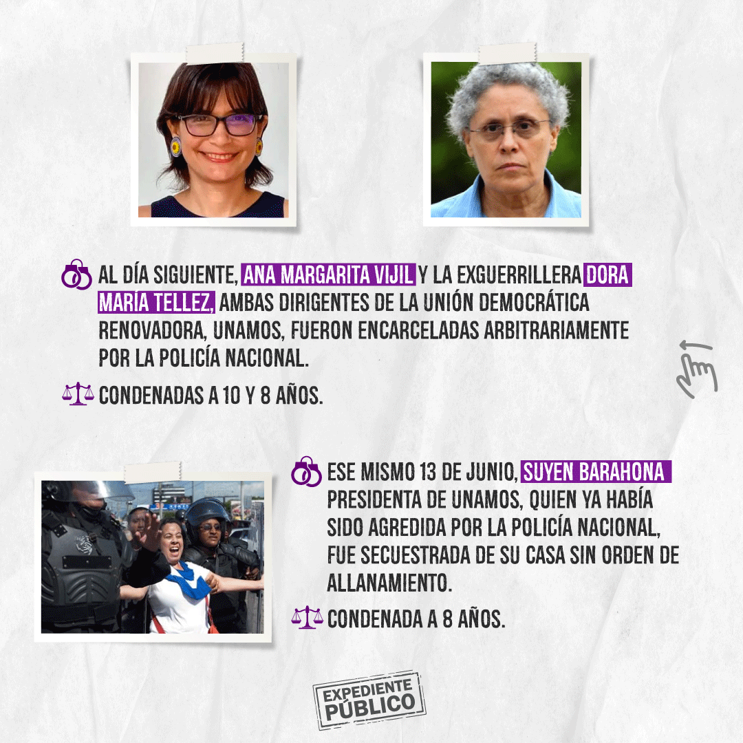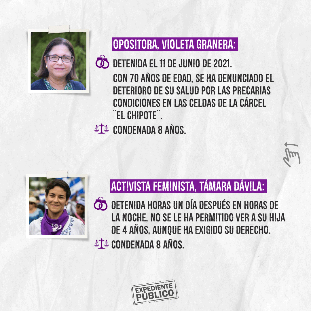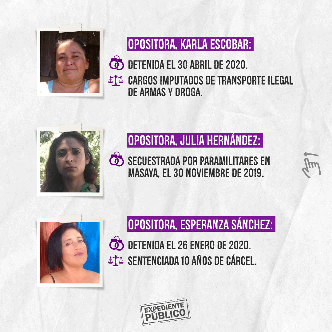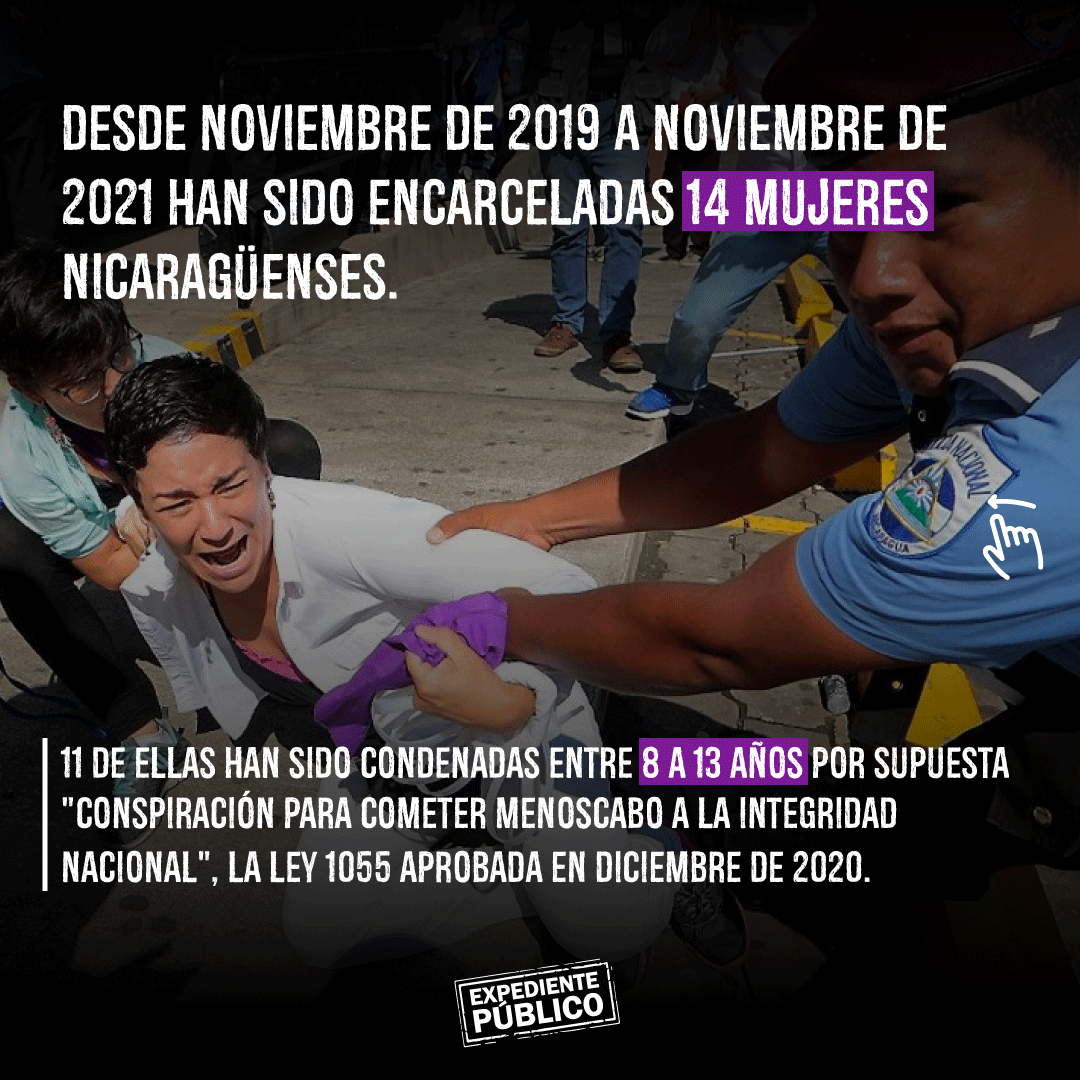 En la actualidad, las voces de mujeres disidentes y dirigentes de organizaciones feministas son perseguidas y criminalizadas. En total 14 lideresas opositoras permanecen en prisión desde noviembre de 2019. 11 de ellas han sido condenadas entre 8 a 13 años, acusadas de “traidoras de la patria” bajo la Ley 1055, “Ley Defensa de los Derechos del Pueblo a la Independencia, soberanía y autodeterminación para la paz”.