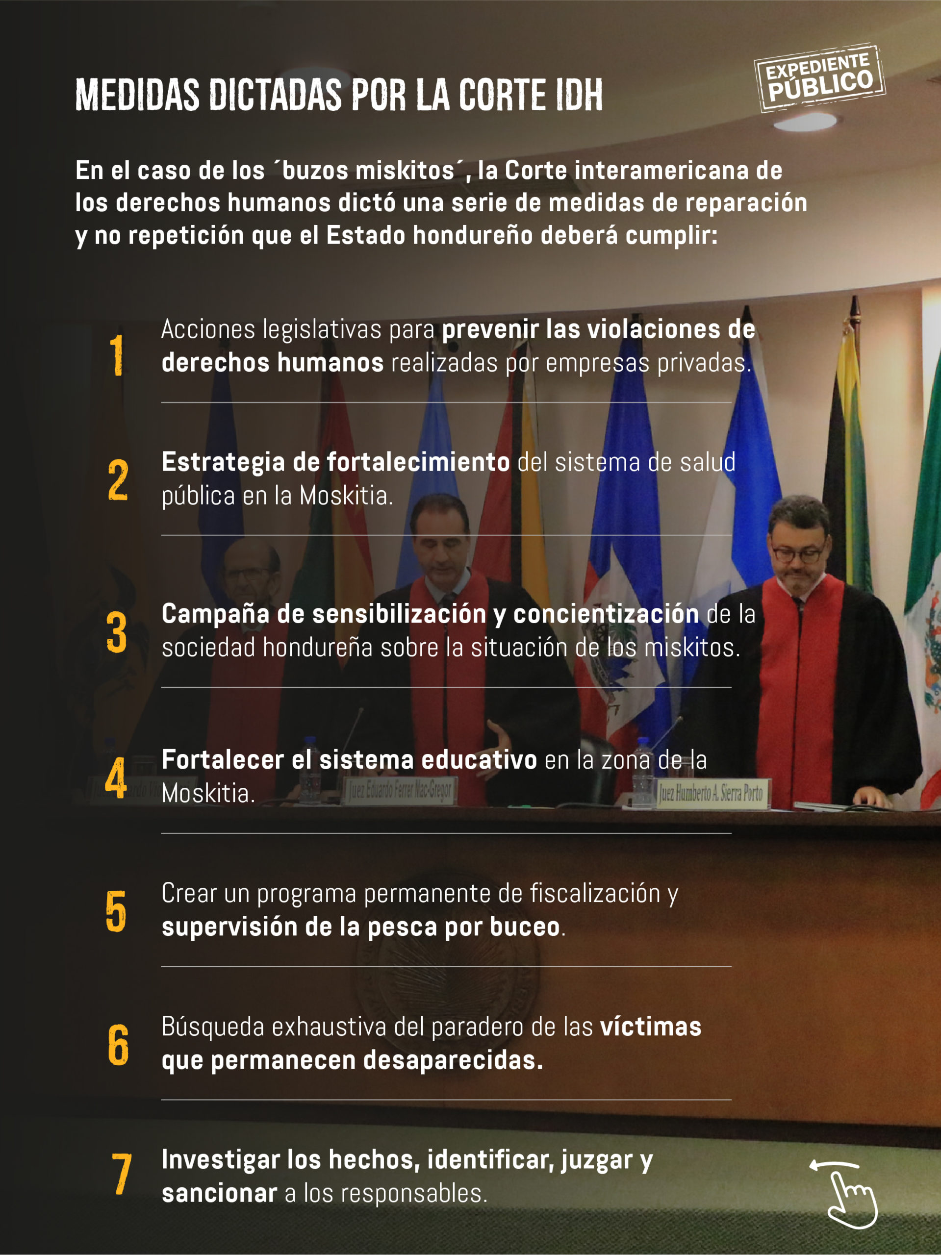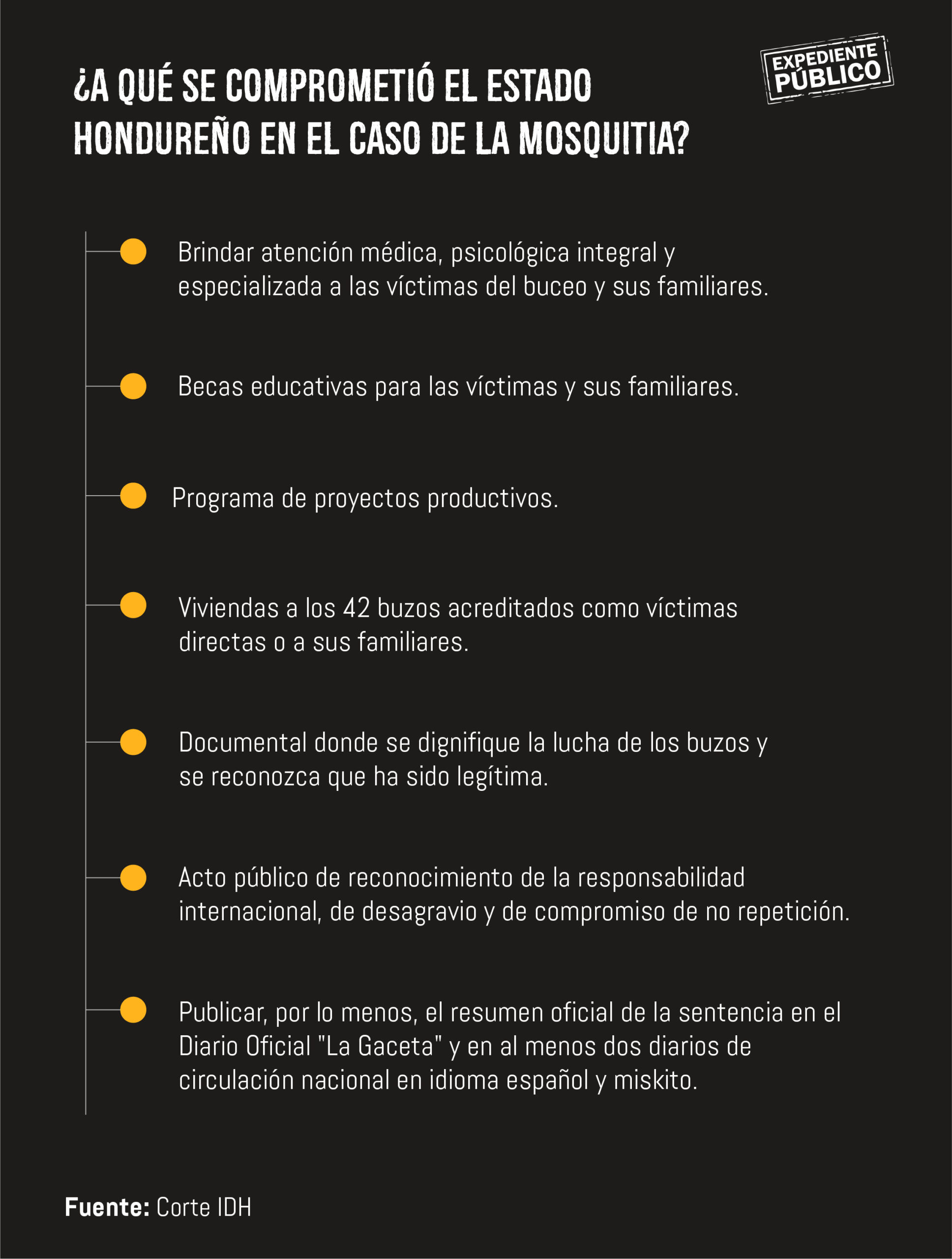 Honduras reconocerá su responsabilidad por las violaciones a los derechos humanos de los buzos miskitos, a sus familias y también, manifestará su compromiso con el cumplimiento de las medidas de reparación y no repeticiones dictadas en la sentencia, así como el de proteger y garantizar los derechos de los buzos afectados por las prácticas de buceo.