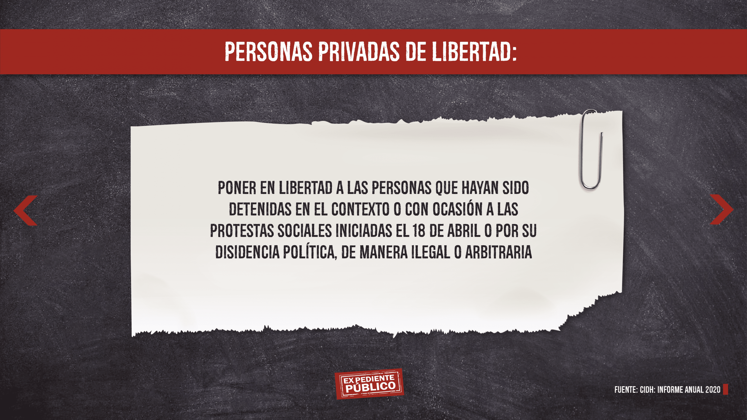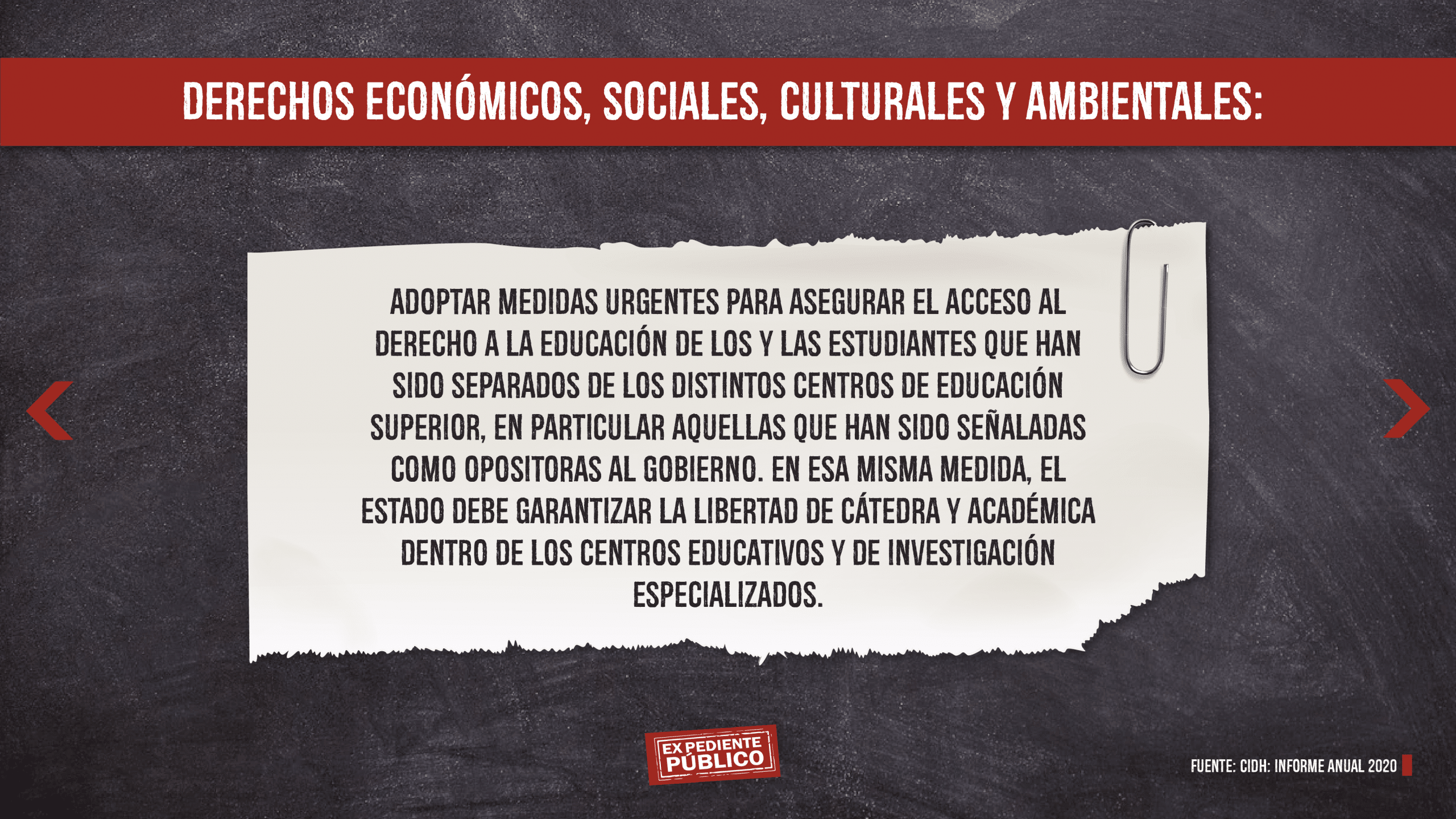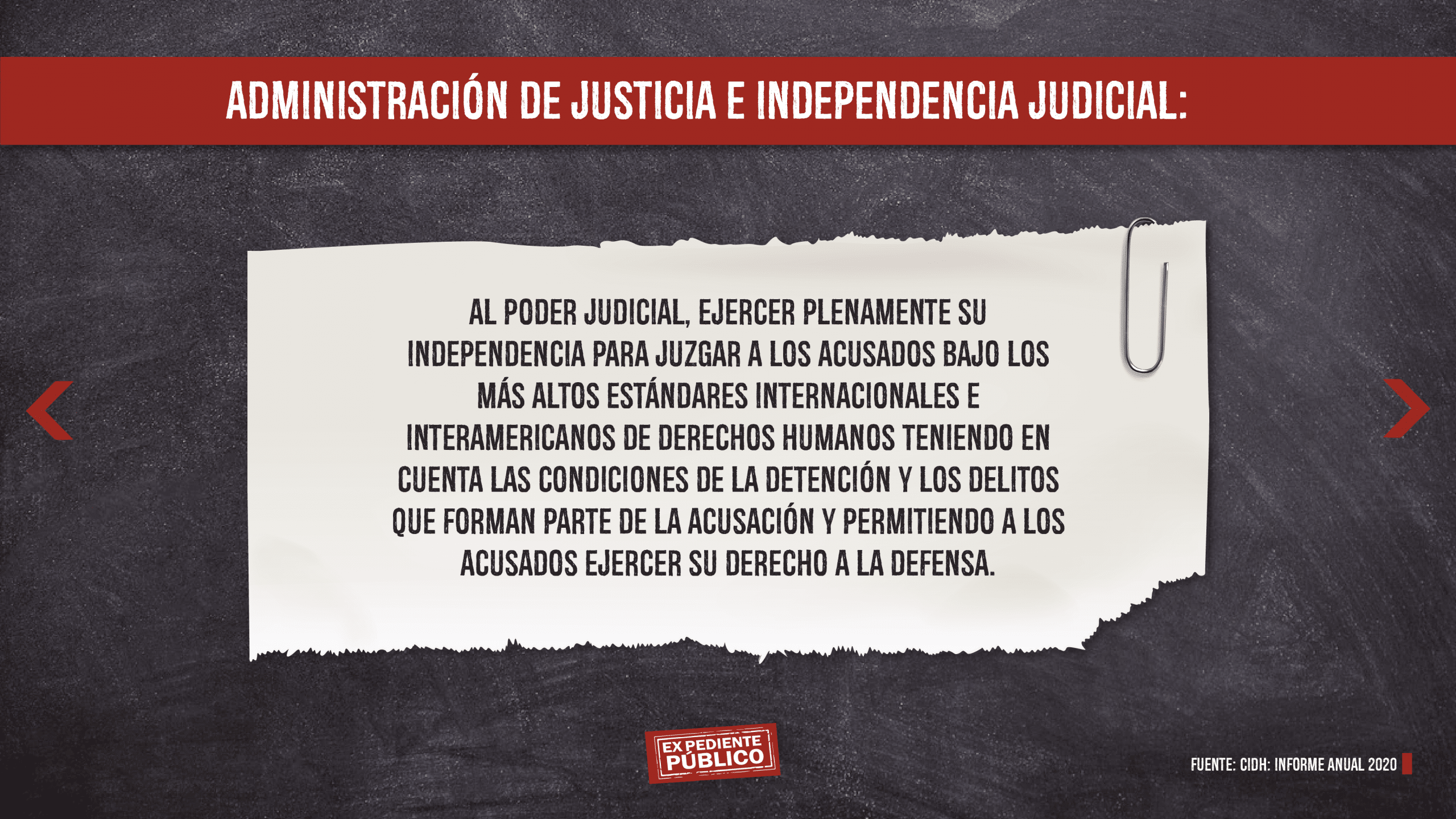 En otro de sus puntos, la CIDH señala que la falta del principio de separación de poderes, la agudización de la represión contra las voces críticas al gobierno y la inexistencia de reformas institucionales tendientes al restablecimiento del Estado de Derecho, profundizan la crisis y persiste un contexto de impunidad generalizada.