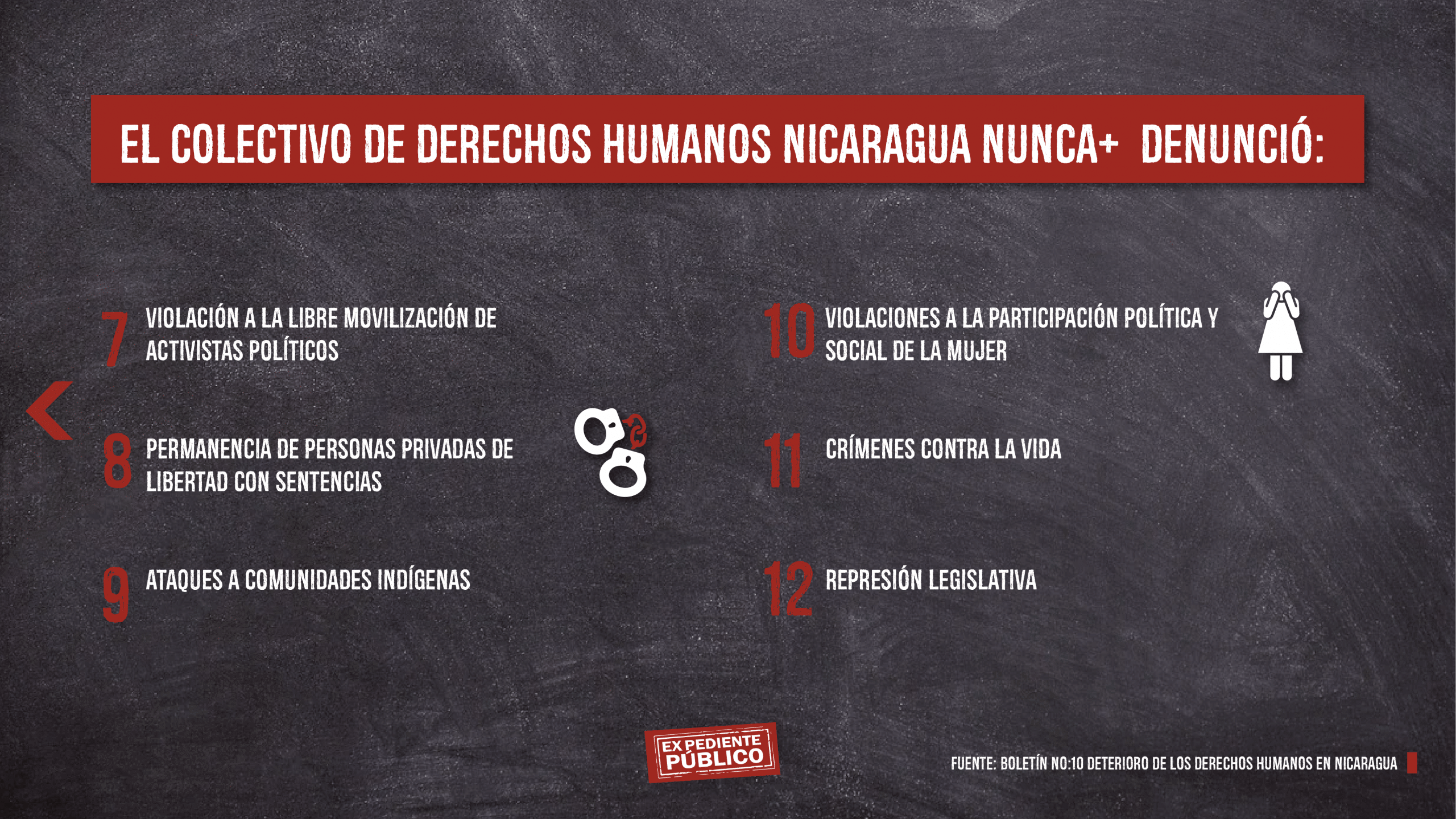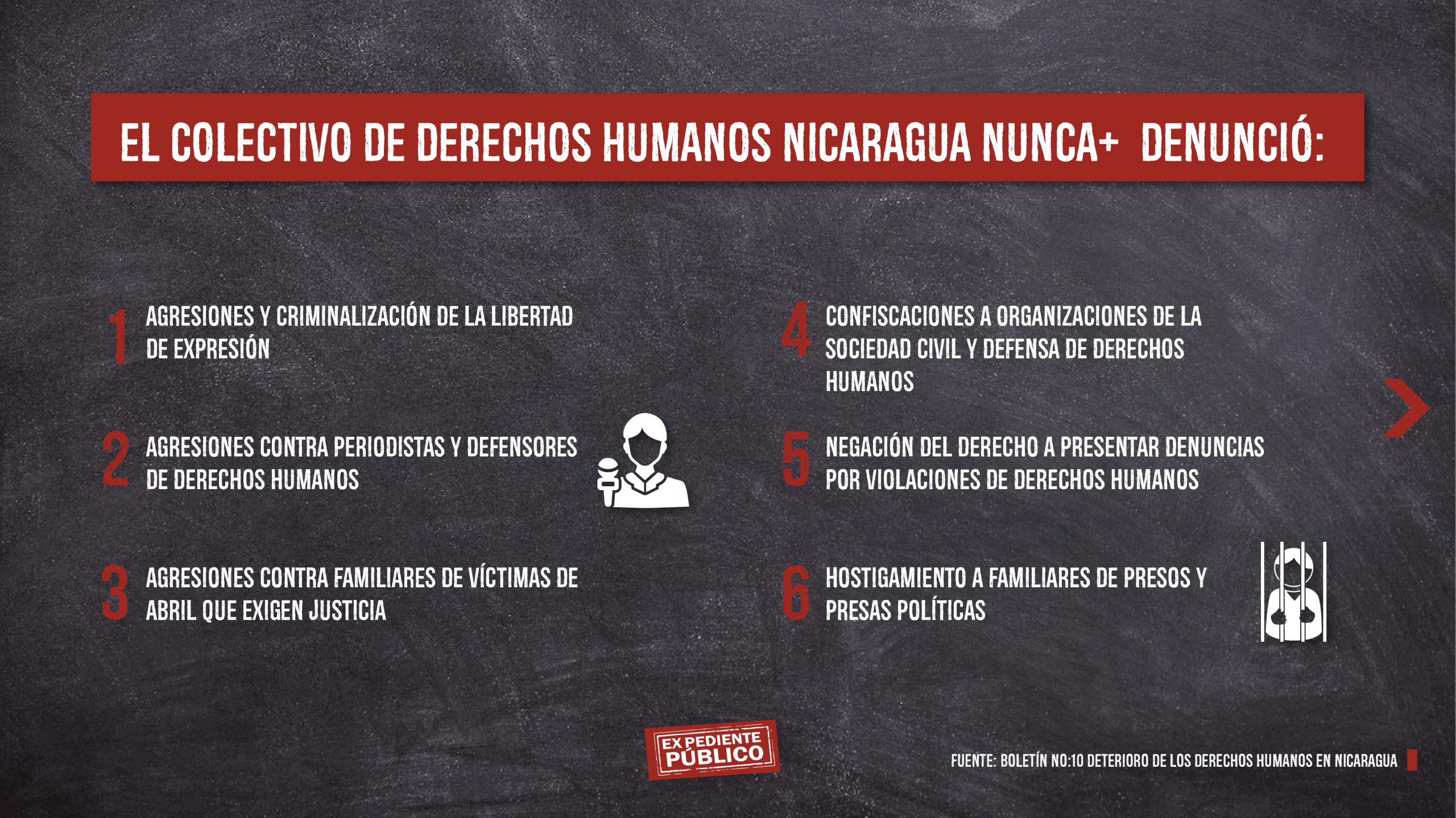Además, el Colectivo de Derechos Humanos Nicaragua Nunca+, desde el exilio presentó y publicó su Boletín No:10 informativo sobre las continuas violaciones a los derechos fundamentales de los nicaragüenses durante el último año y un informe sobre las violaciones a la libertad de expresión y prensa en Nicaragua, en conmemoración al aniversario del asesinato del Periodista nicaragüense Ángel Gahona. El informe denuncia +943 agresiones contra periodistas que han sido documentadas en el último año.