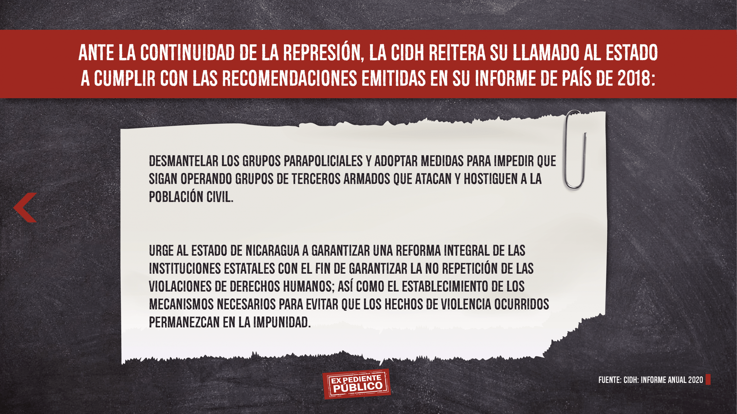 La CIDH a través de un informe especial sobre la situación en Nicaragua, condenó la persistencia de la impunidad generalizada y el quebrantamiento prolongado del Estado de Derecho, además, de resaltar que el gobierno dijo desconocer el reporte y lo denunció como “una agresión más en la cadena de agresiones imperiales que han promovido crímenes de odio, terrorismo y destrucción” dos días después de haberles enviado una copia preliminar.
