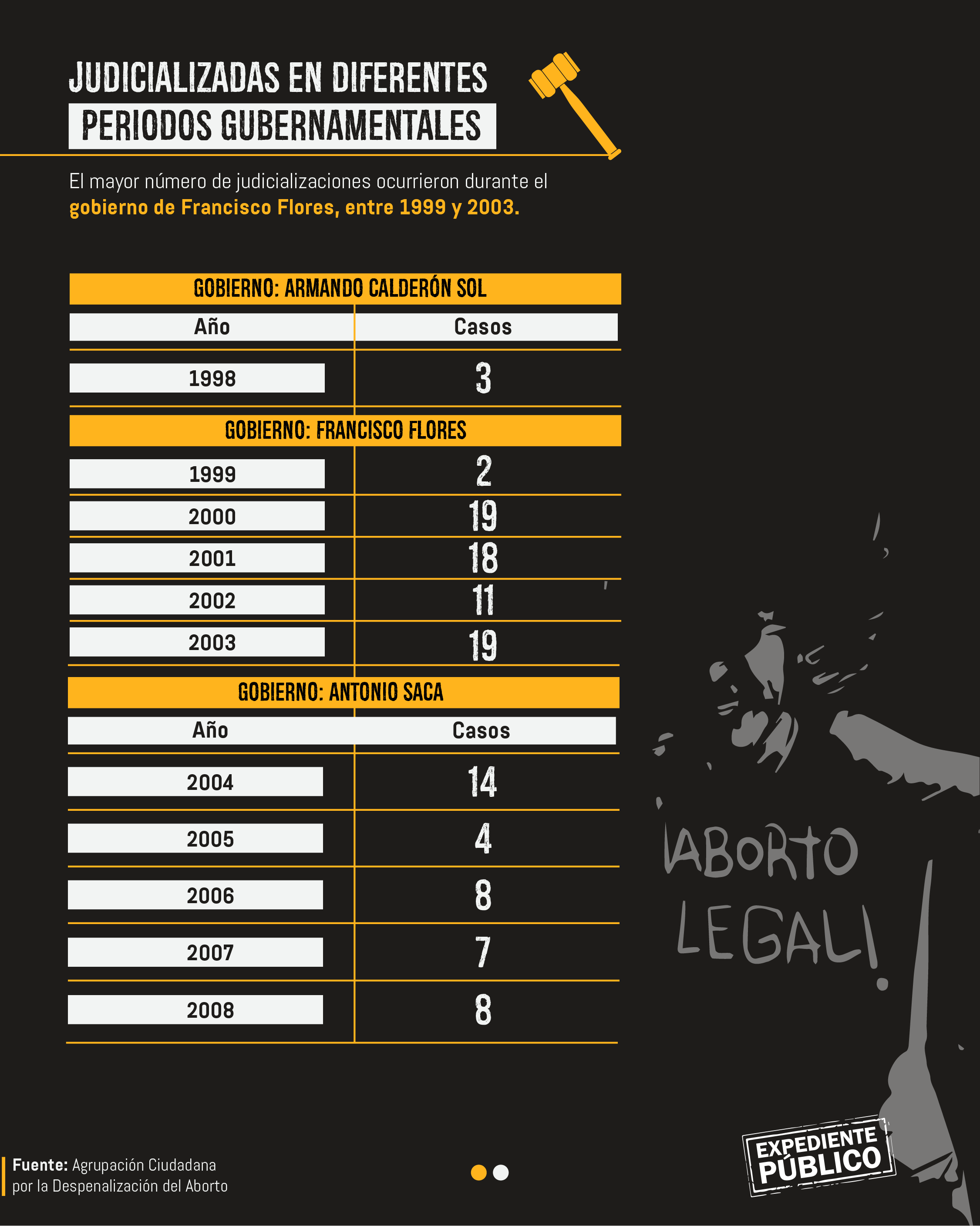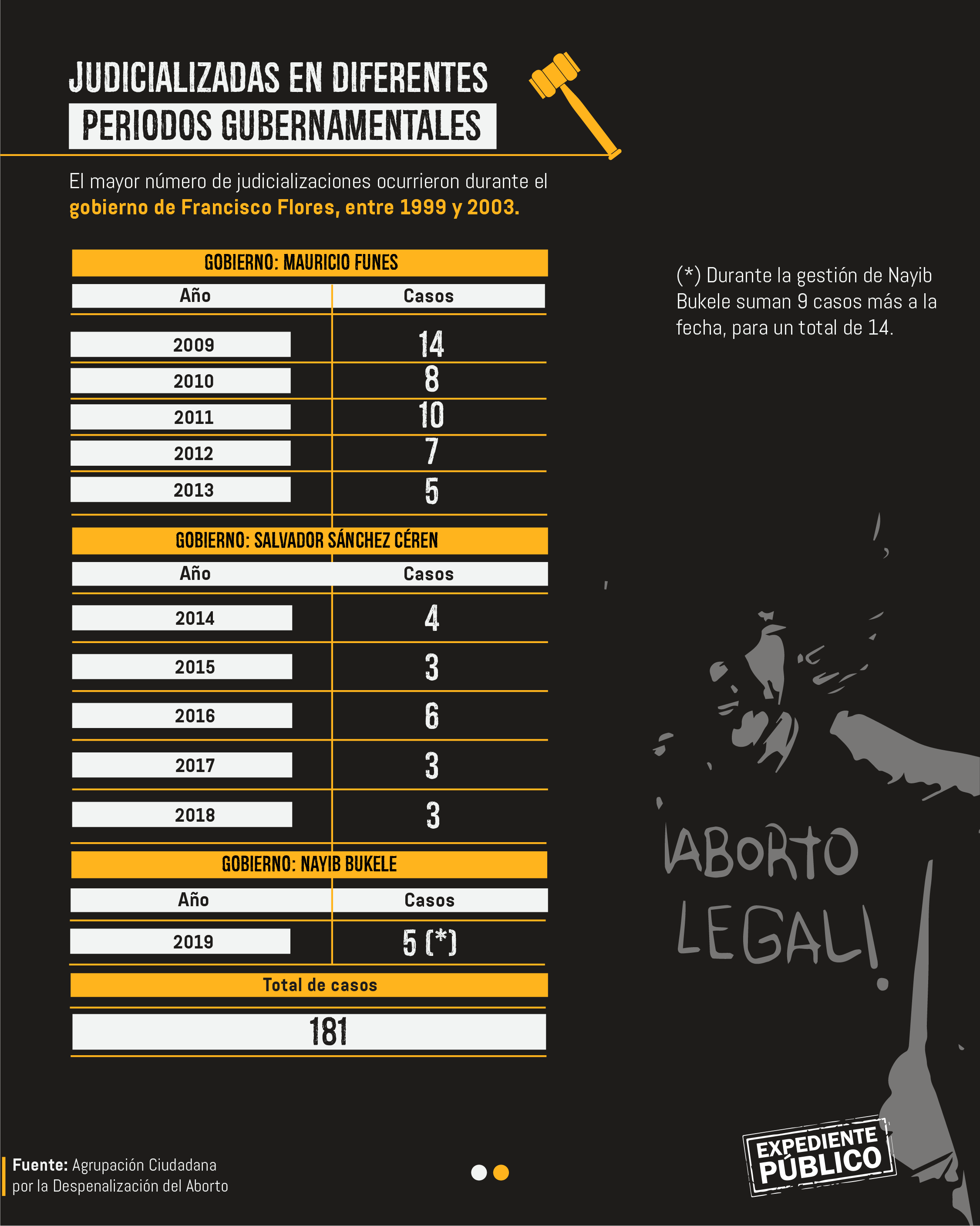 La Agrupación Ciudadana por la Despenalización del Aborto, fundada en el 2009, estima que desde 1998 hasta 2019 al menos 181 mujeres fueron judicializadas inicialmente por aborto. En algunos casos la Fiscalía General de la República (FGR) cambió la tipificación del delito a homicidio, pues no disponían de pruebas que demostraran que se practicaron ese procedimiento, que es ilegal en el país centroamericano.