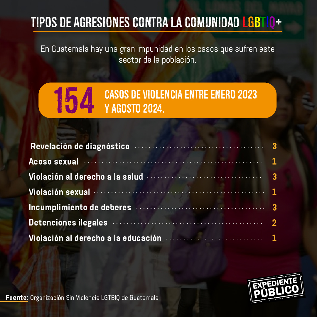 Según datos de la organización Red Nacional de Diversidad Sexual y VIH en Guatemala (REDNADS), en 2023 se reportaron alrededor de 90 casos de agresiones físicas y verbales contra personas LGTBIQ, que sí lograron un inicio de investigación por parte del Organismo Judicial de Guatemala.