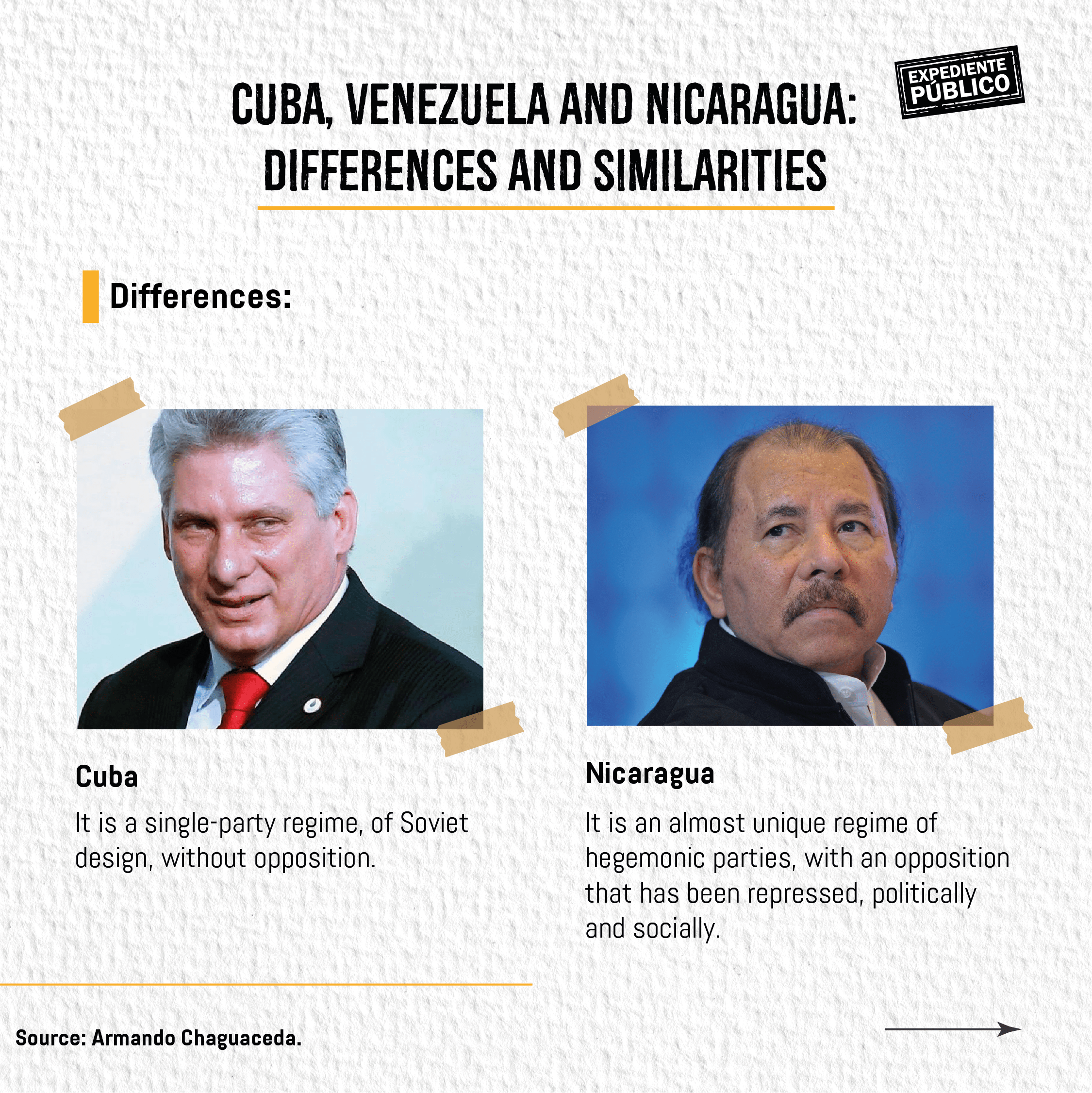 Chaguaceda explains that these countries have three different structures and evolution processes. Cuba has a hegemonic party system of soviet design, where the political opposition is not recognized by the government. Nicaragua also has a hegemonic party system, with essentially one political party for all practical purposes but where repression of the political opposition has existed. Lastly, the Venezuelan government is an authoritarian regime with a large yet divided opposition, where significant social movement continues to occur.