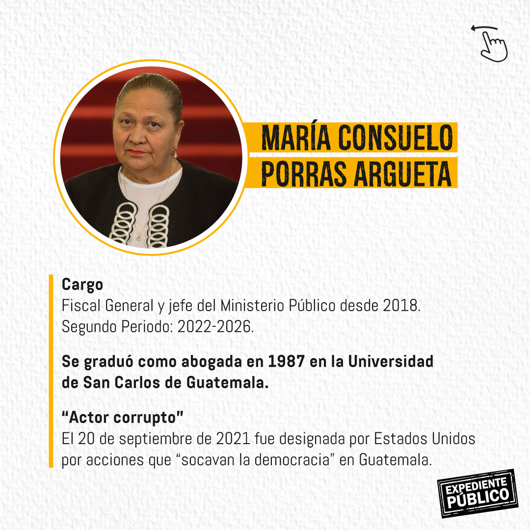 En Guatemala el Ministerio Público está dirigido por la fiscal general, María Consuelo Porras Argueta. Fue nombrada inicialmente para el cargo en mayo de 2018 por el entonces presidente Jimmy Morales en sustitución de Thelma Aldana, la fiscal general que estuvo al frente de importantes investigaciones contra la corrupción en Guatemala.