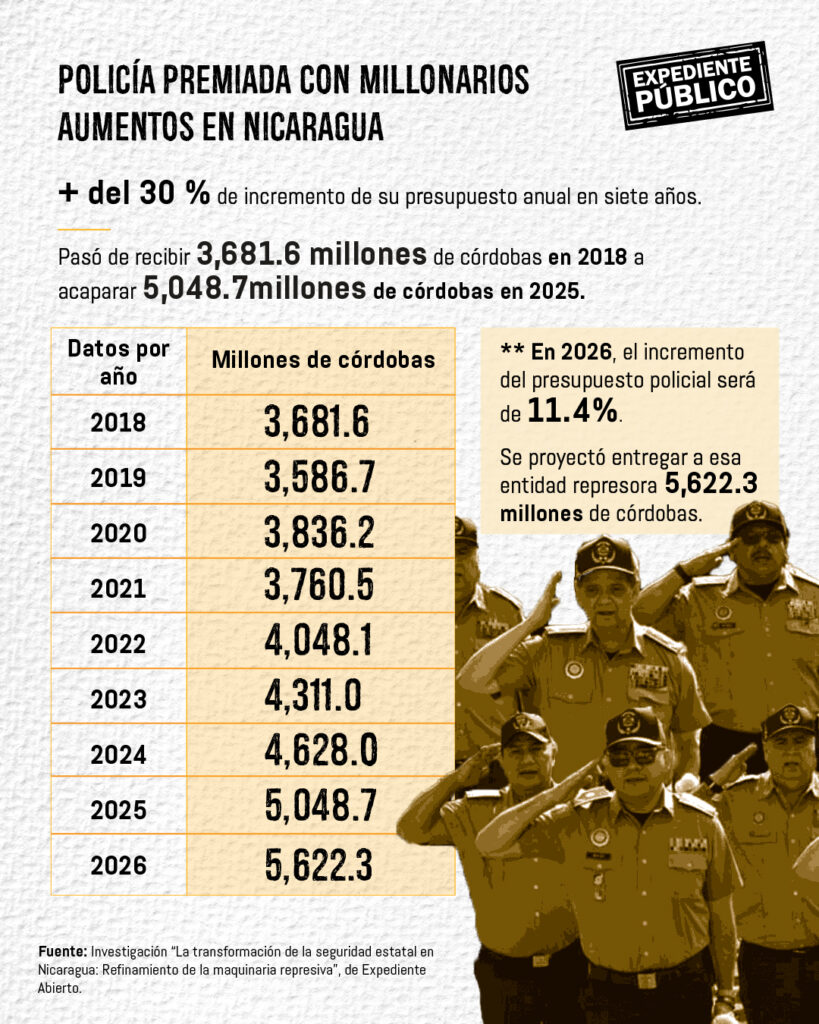 La investigación revela que la Policía Nacional incluso pasó de recibir un presupuesto de 3,681.6 millones de córdobas (más de US$ 100 millones) en 2018 a uno de 5,048.7 millones de córdobas (más de US$ 137 millones) en 2025.