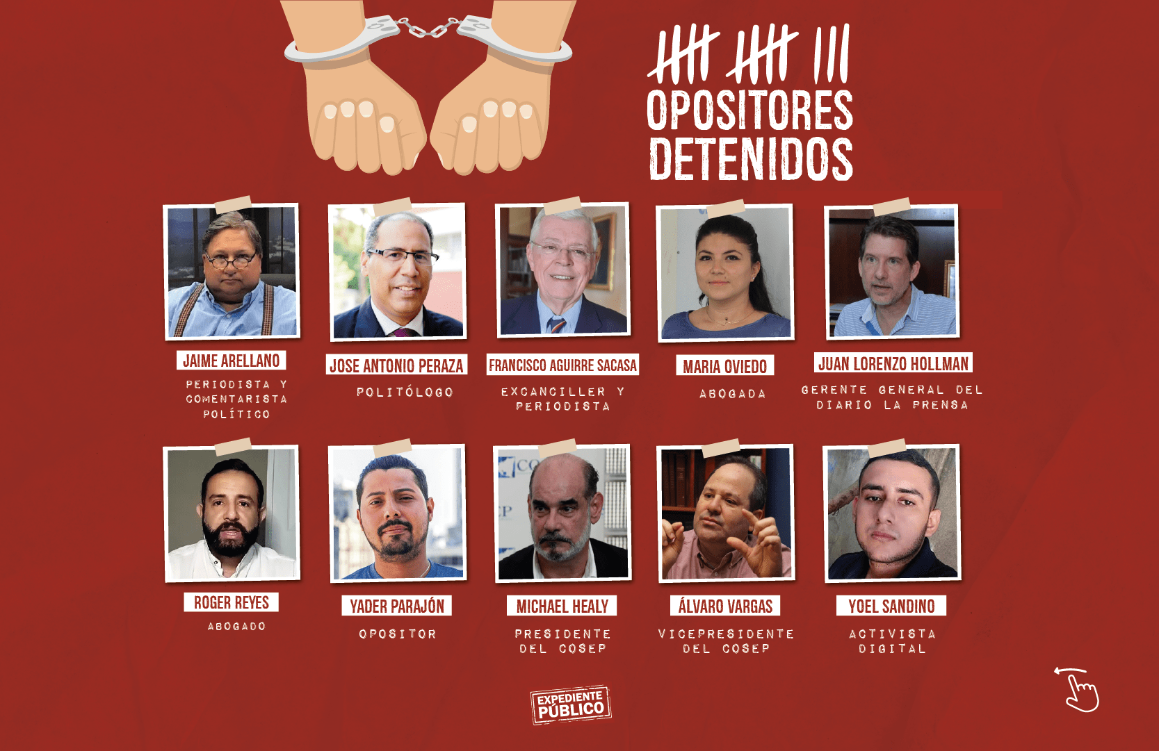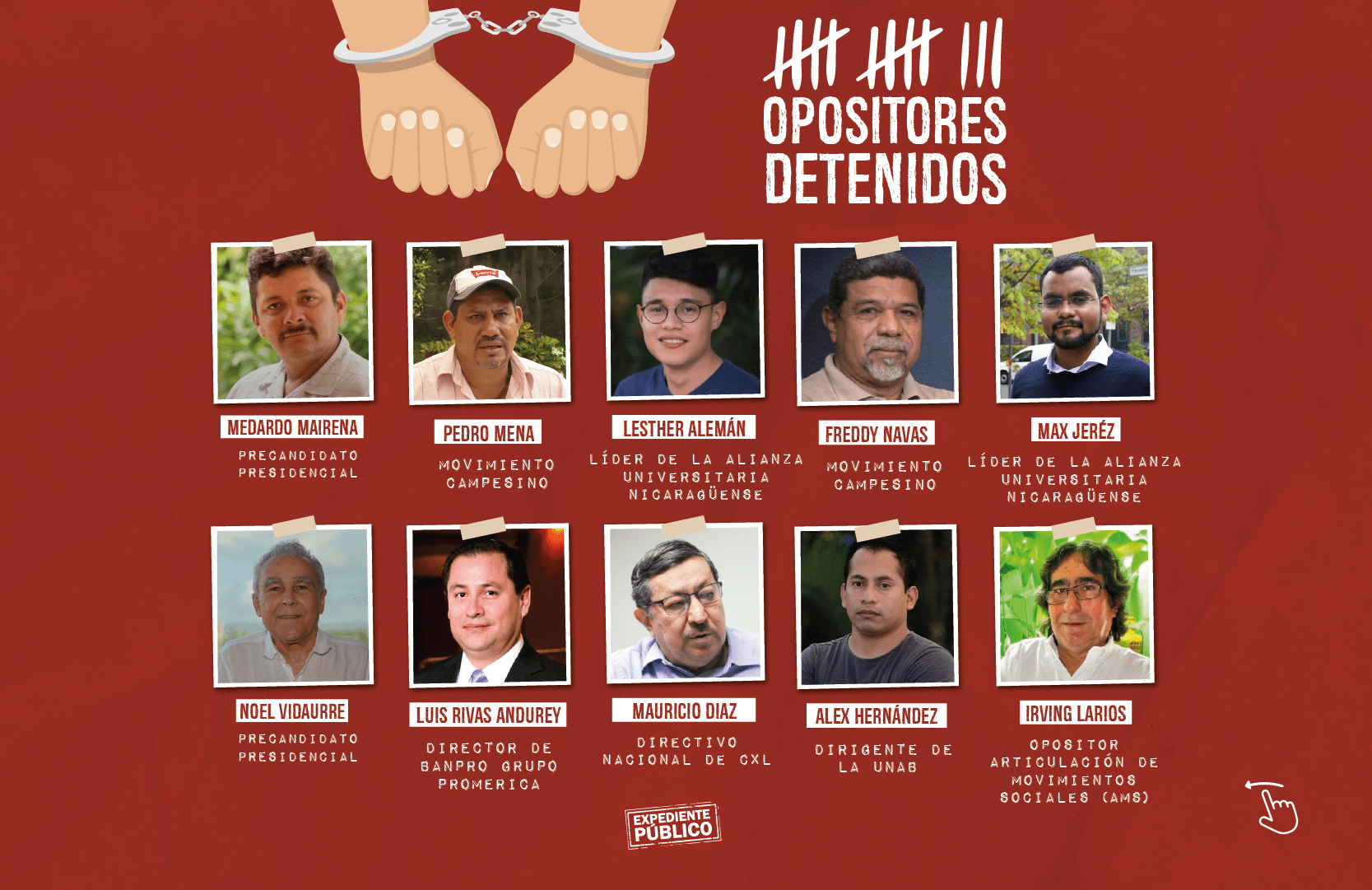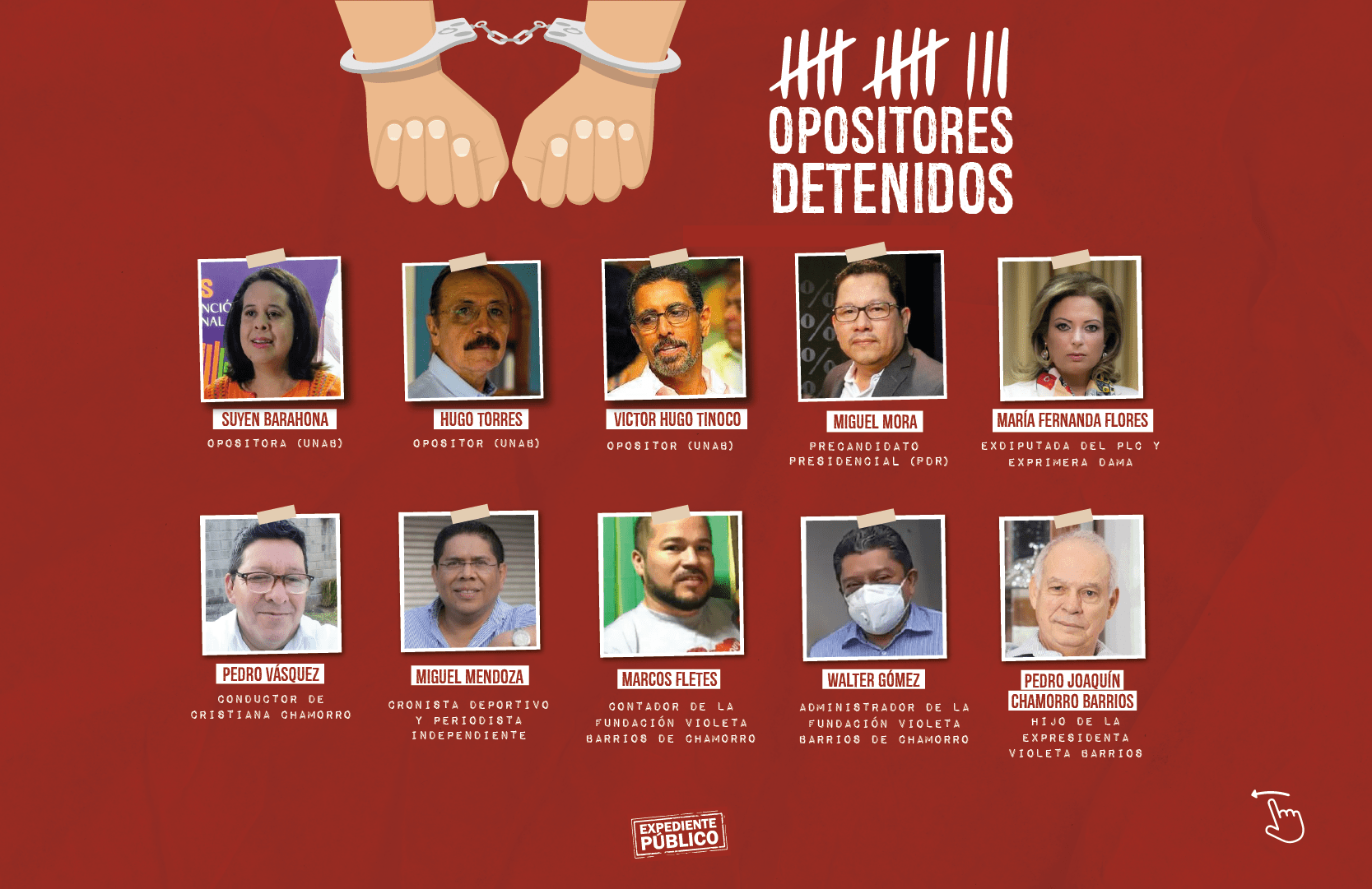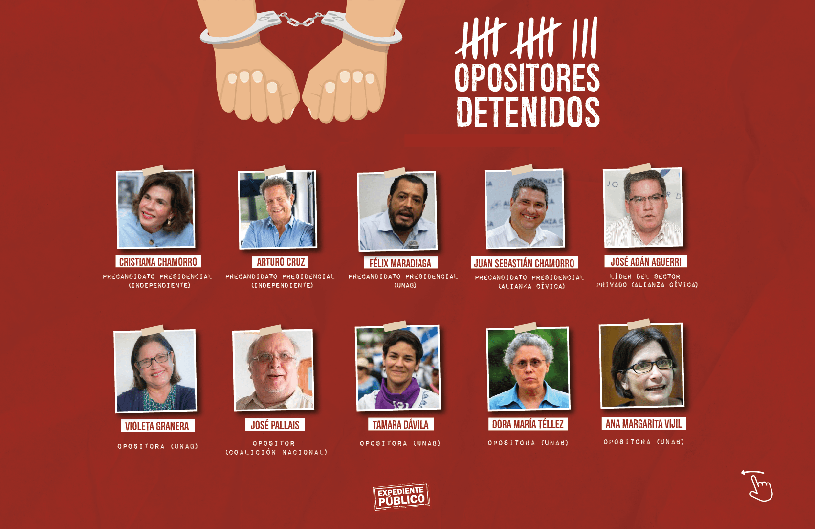 Desde fines de mayo, el gobierno de Nicaragua ha detenido a 39 personas identificadas como opositoras al gobierno, incluidos siete precandidatos presidenciales: Cristiana Chamorro, Arturo Cruz, Félix Maradiaga, Juan Sebastián Chamorro, Miguel Mora, Medardo Mairena y Noel Vidaurre.