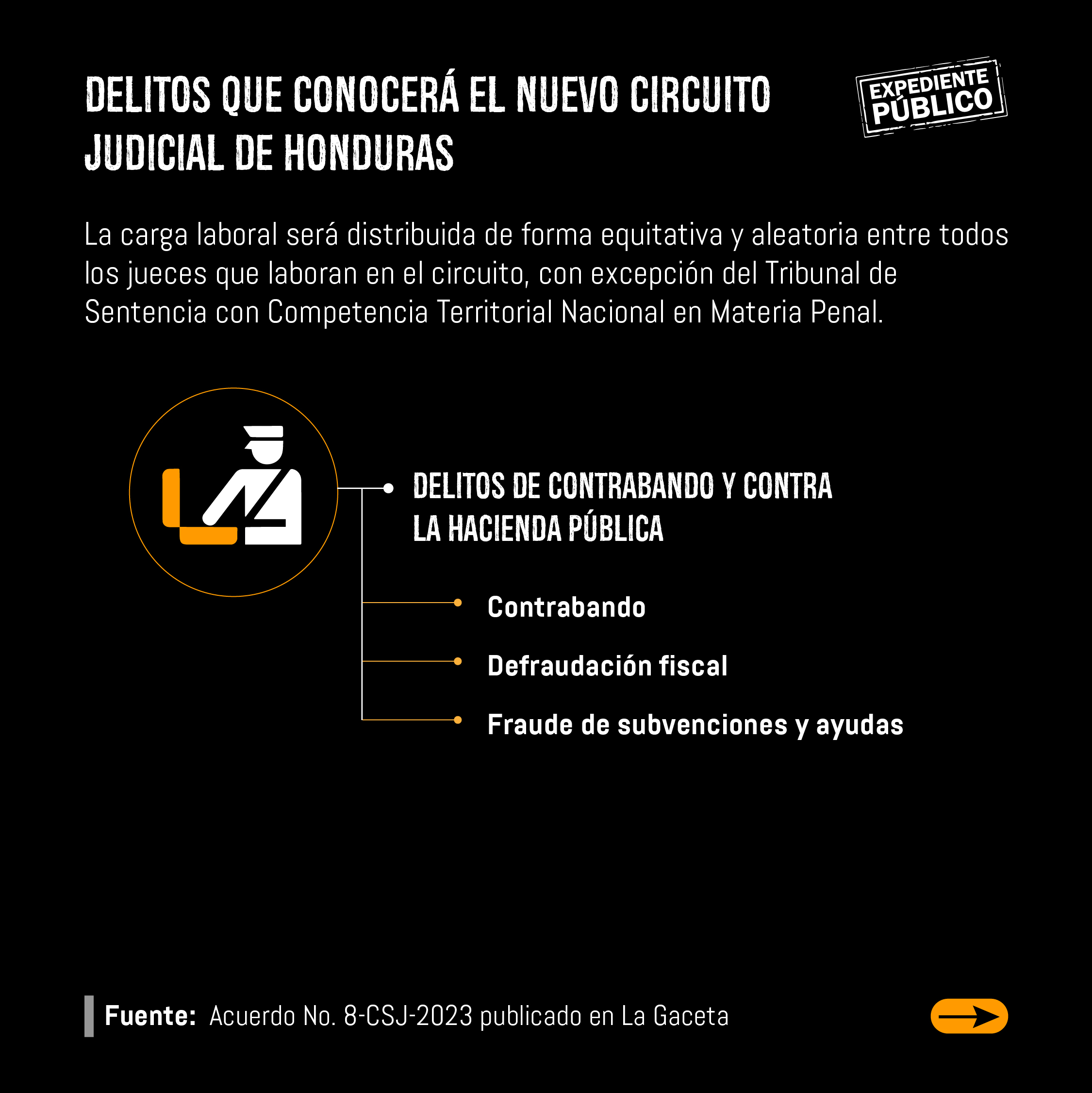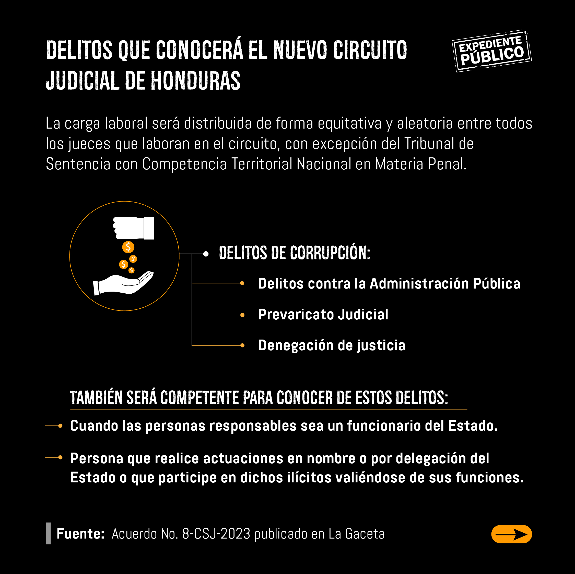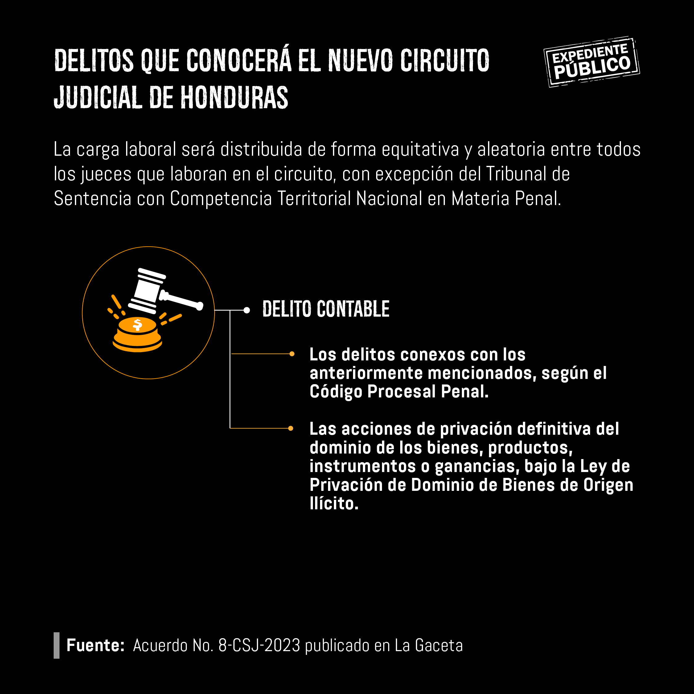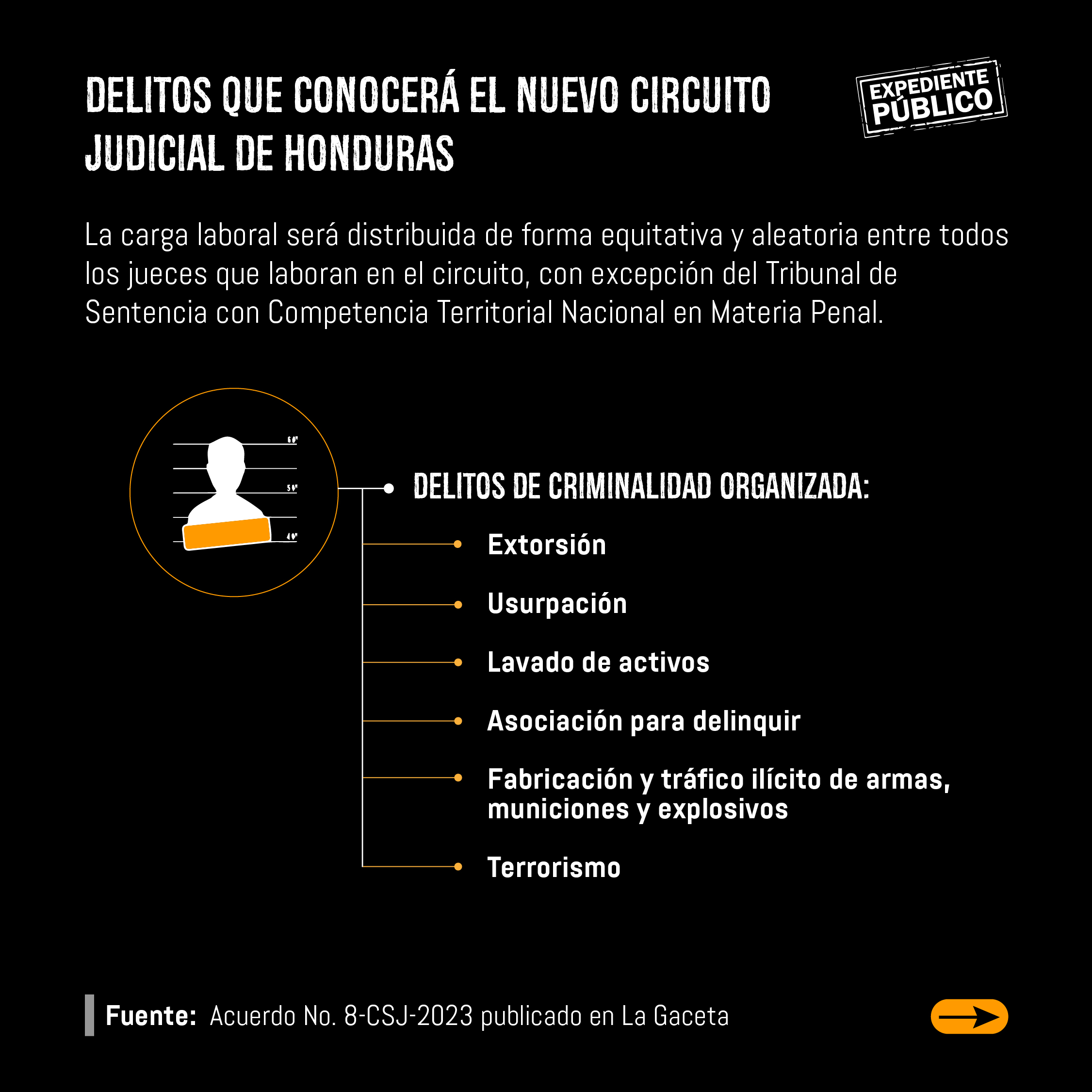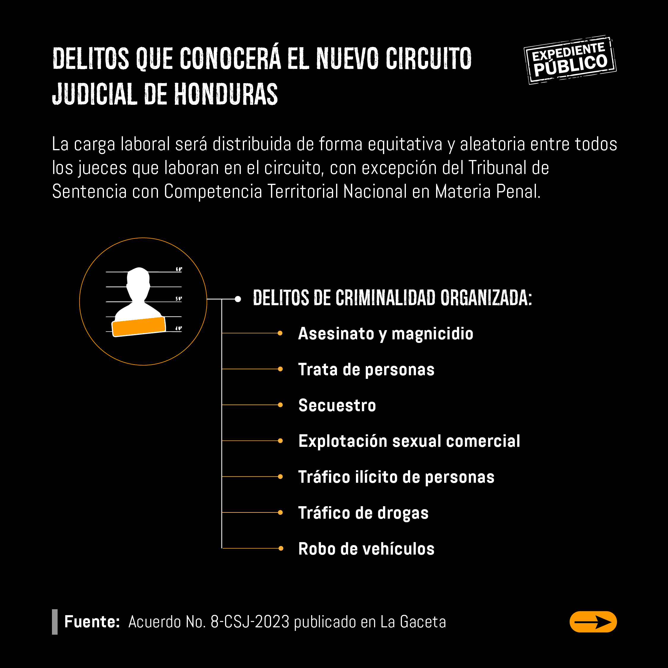 El acuerdo que crea el nuevo circuito establece que la carga laboral de los órganos que lo integran será distribuida “equitativa y aleatoriamente” entre todos los jueces que laboran en el mismo, con excepción del Tribunal de Sentencia con Competencia Territorial Nacional en Materia Penal que continuará conociendo delitos de criminalidad organizada.