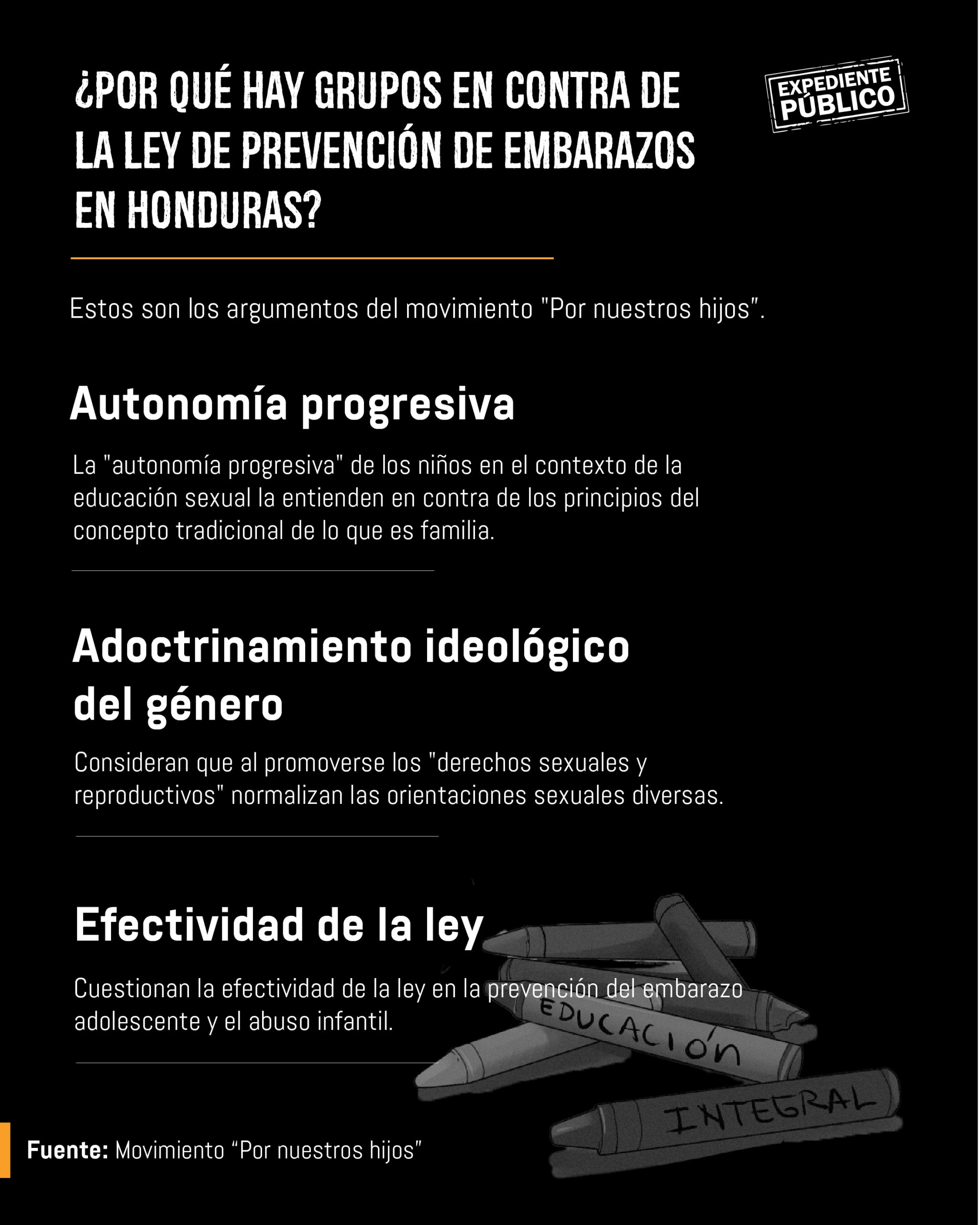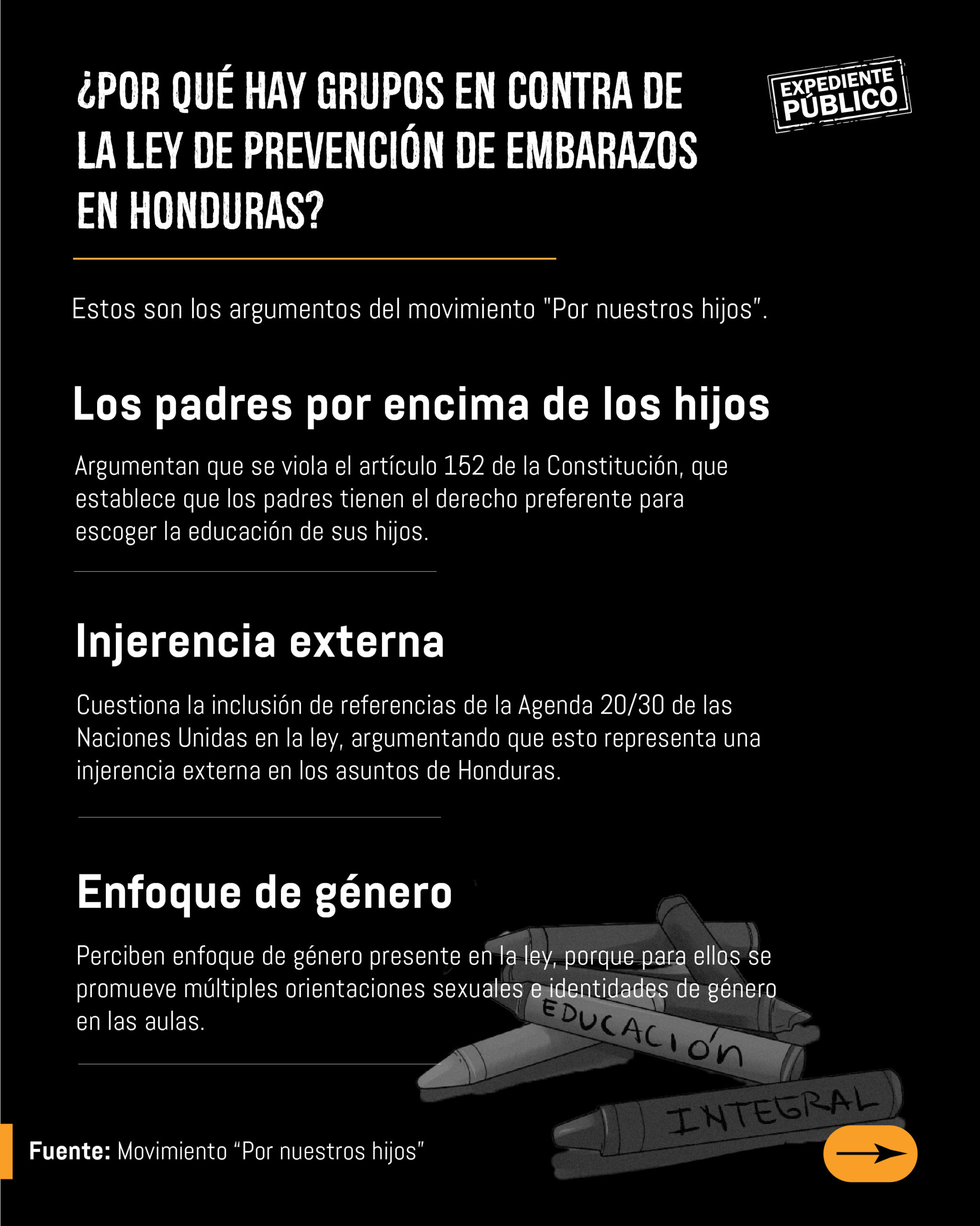 Asimismo, la plataforma “Por nuestros hijos” presentó una serie de argumentos contra la Ley de Educación Integral en Honduras, principalmente cuestionando su enfoque de género, la supuesta injerencia internacional y la efectividad de la ley en la prevención del embarazo adolescente y el abuso infantil.