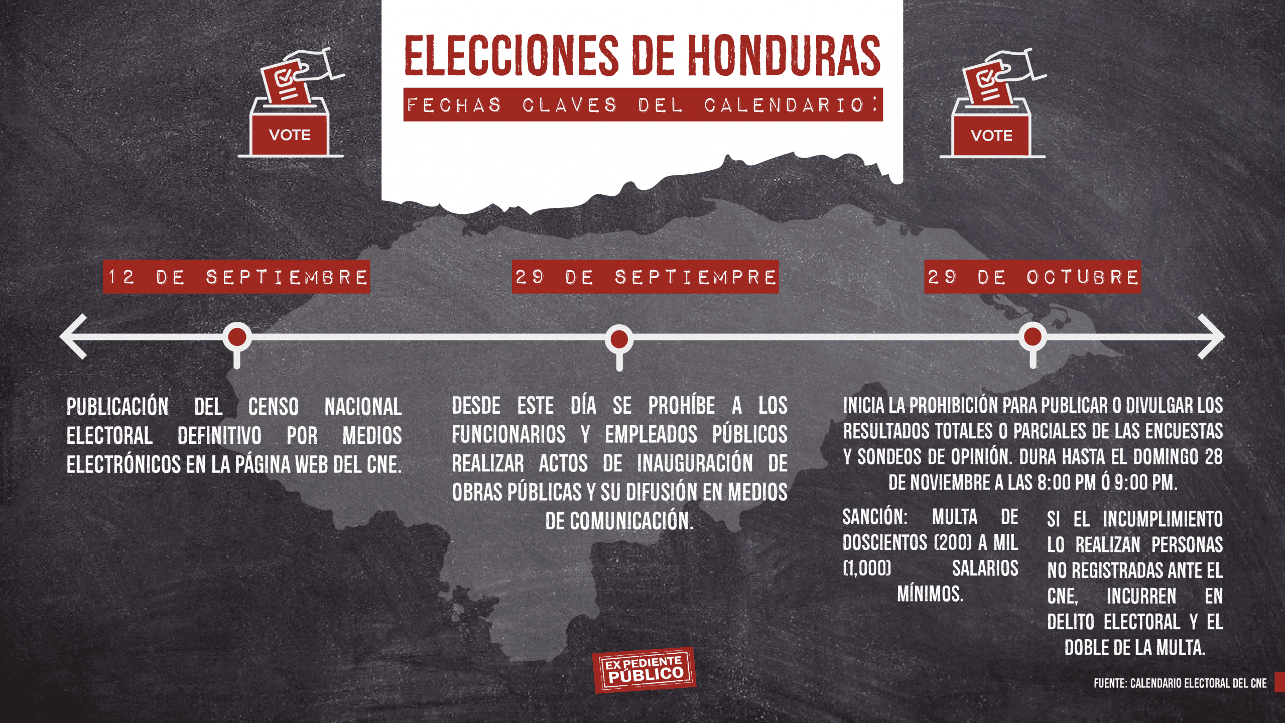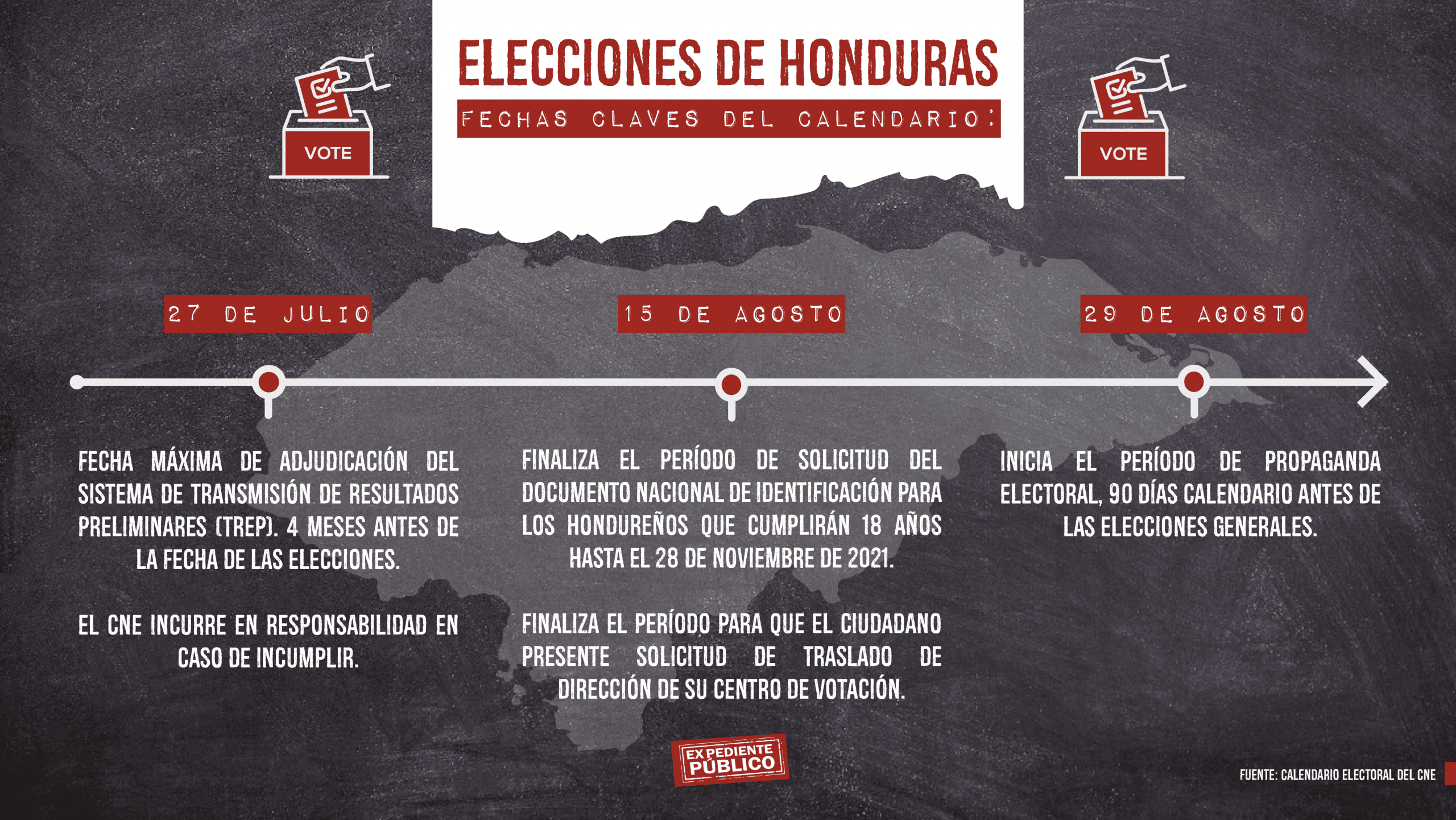 Las elecciones para presidente, alcaldes y diputados en Honduras se realizarán el 28 de noviembre de 2021 y el Consejo Nacional Electoral (CNE), organismo encargado de llevar adelante el proceso, necesita una ampliación presupuestaria superior a los 800 millones de lempiras (unos 33.7 millones de dólares) para adquirir tecnología que permita una mayor transparencia a las votaciones y al escrutinio. La aprobación de esos recursos está estancada en el parlamento hondureño.