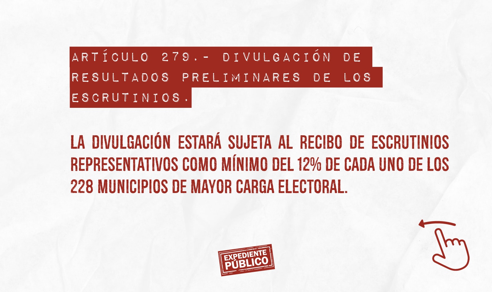 La pretendida reforma también estipula que la divulgación de los resultados de las votaciones no se podrá hacer hasta contar con un escrutinio representativo mínimo del 12% de cada uno de los 228 municipios (de los 298 en total) de mayor carga electoral. Con esta medida, denunció el Pinu, lo que se quiere es extender el silencio electoral ya que es imposible que en cuatro horas se tenga ese porcentaje de la totalidad de los municipios indicados.