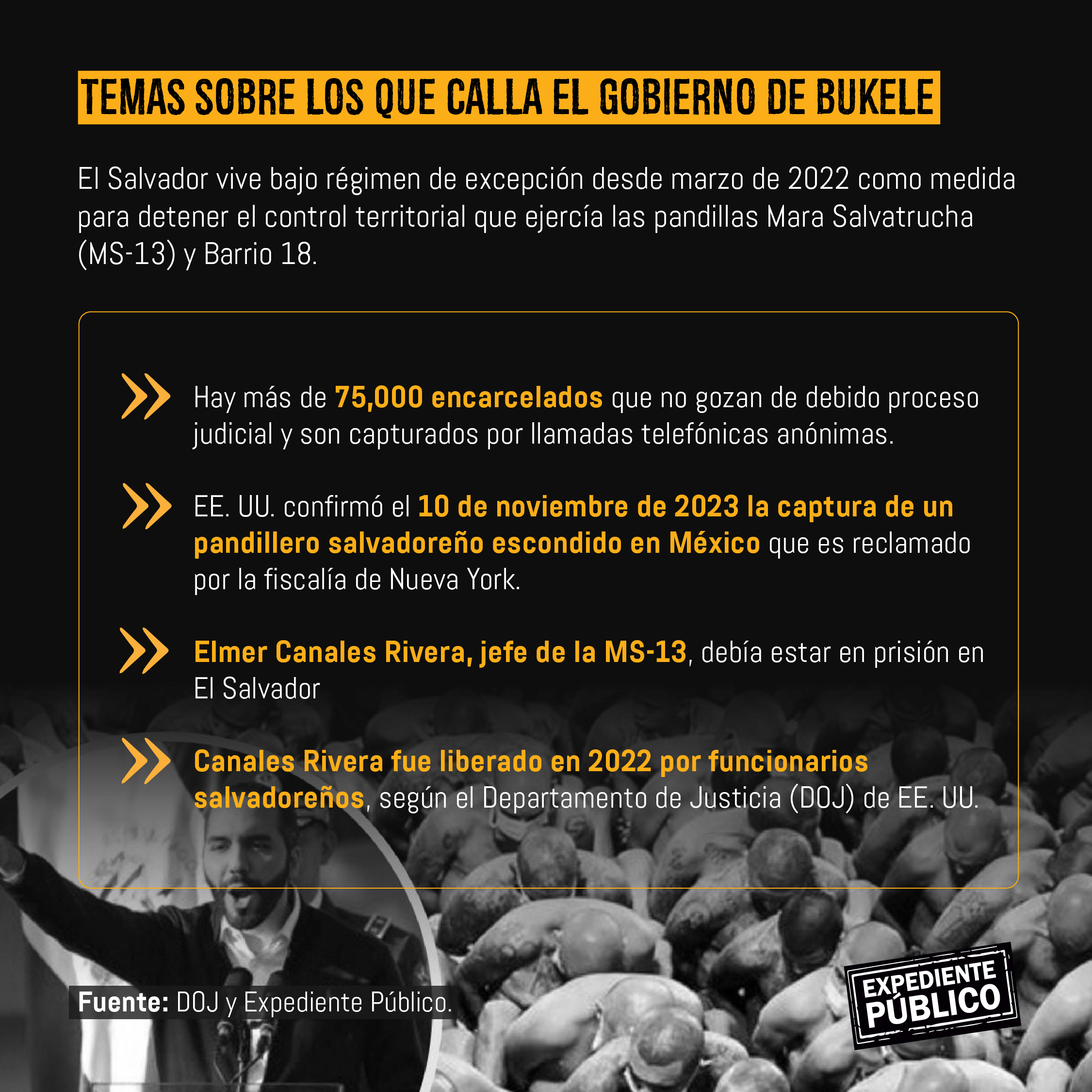 El Gobierno de EE. UU. confirmó este 10 de noviembre la captura del pandillero salvadoreño Elmer Canales Rivera, quien es reclamado por la fiscalía de Nueva York y estaba escondido en México. Bukele, por su parte, solamente publicó un guiño en su cuenta en la red social X (antes Twitter).