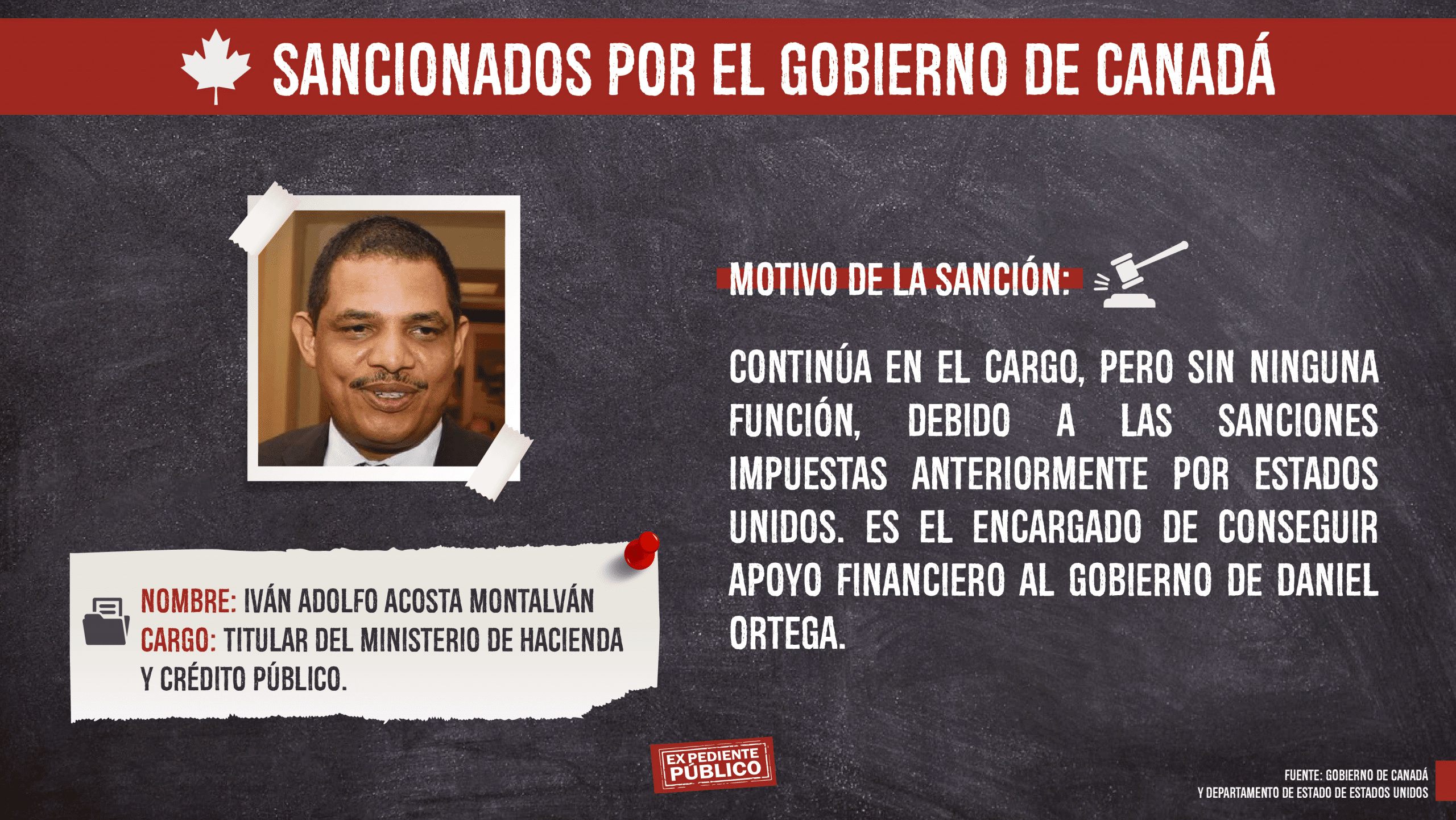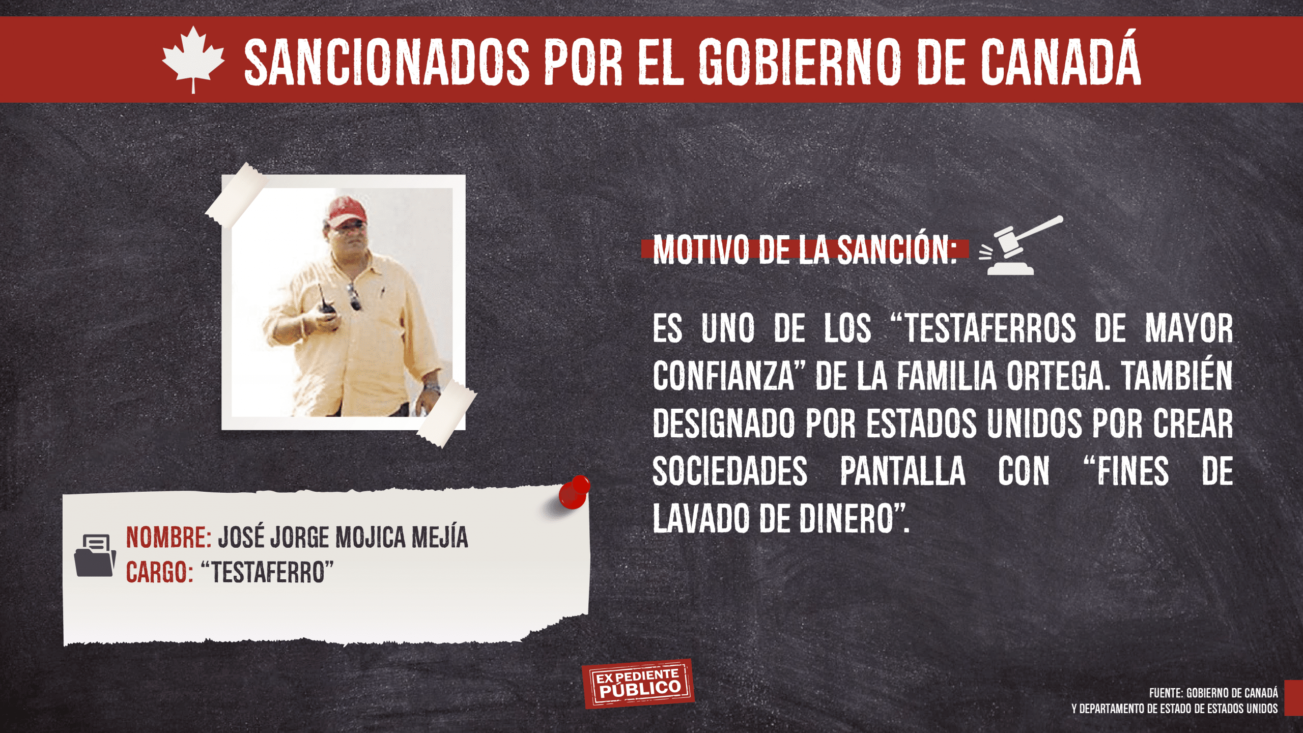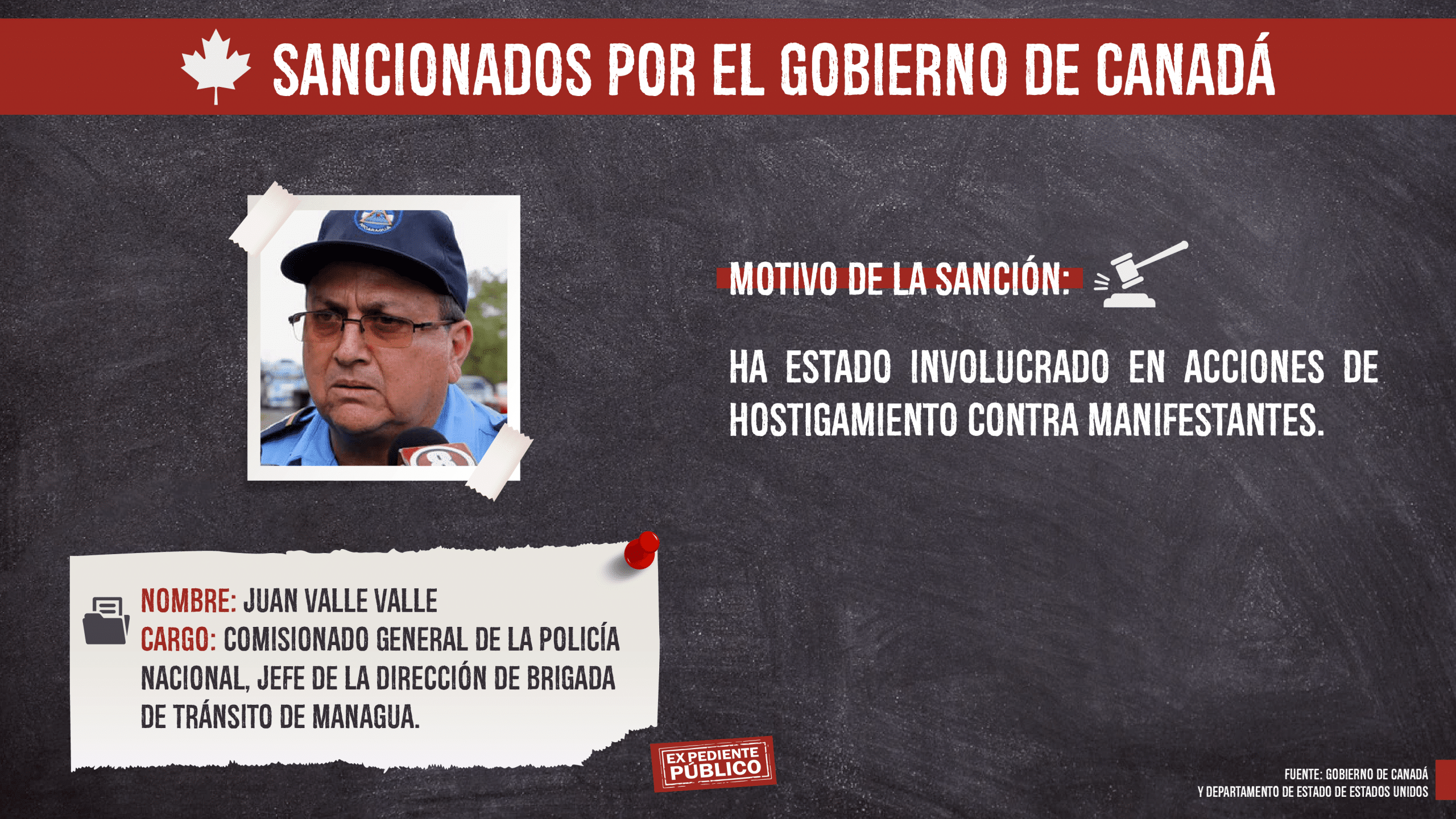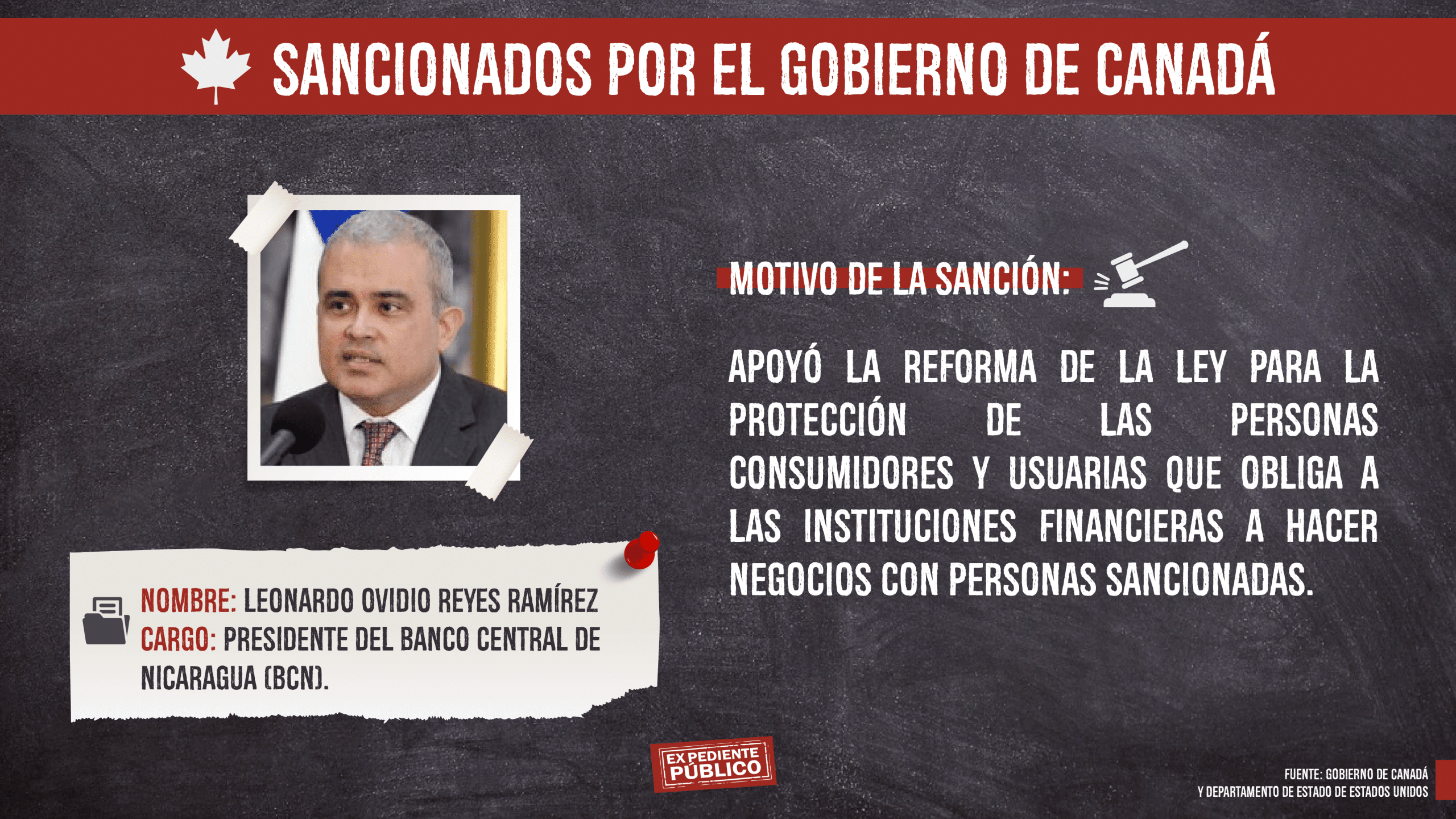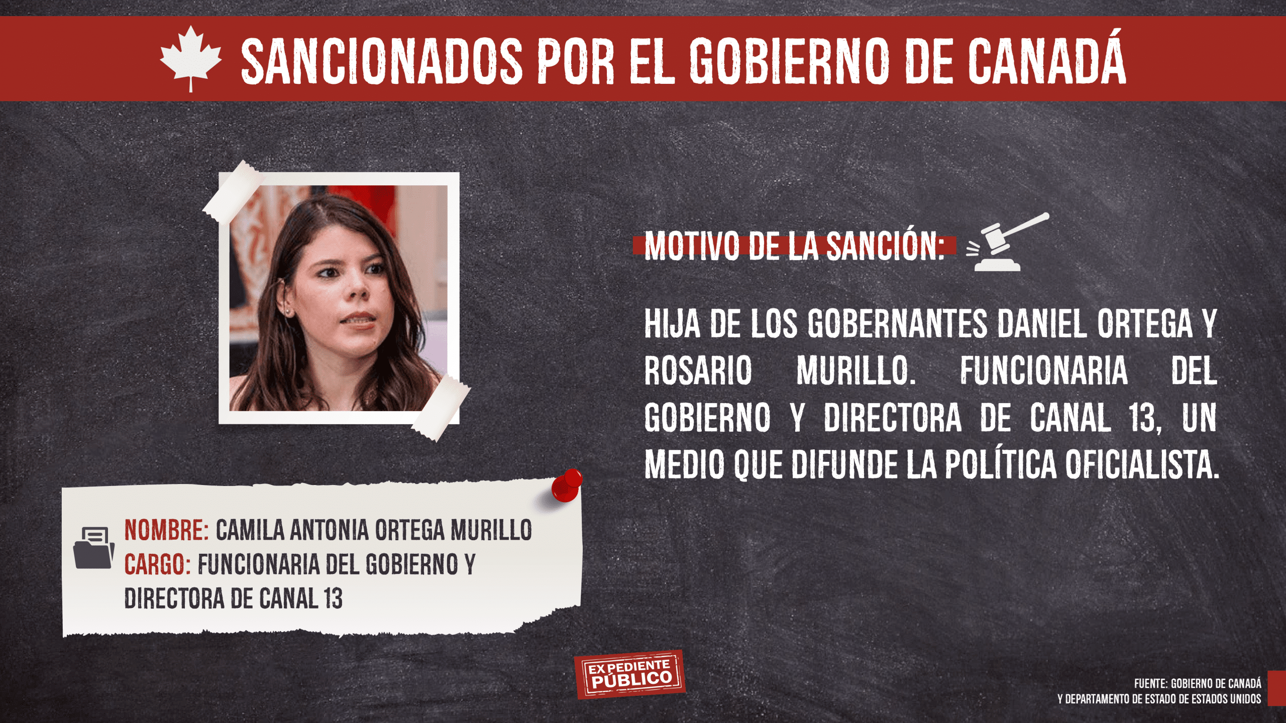 Canadá también sancionó hace dos años a la vicepresidenta Rosario Murillo y su hijo Laureano Ortega, principal funcionario para la adquisición de inversiones, además, se incluyó en la lista el presidente del Parlamento, Gustavo Porras; la ministra de Salud, Sonia Castro; el director de Telecomunicaciones, Orlando Castillo, el ministro de Transporte, Óscar Mojica, el jefe de la Policía, Francisco Díaz, el secretario de la Alcaldía de Managua, Fidel Moreno, y el asesor de seguridad, Néstor Moncada.