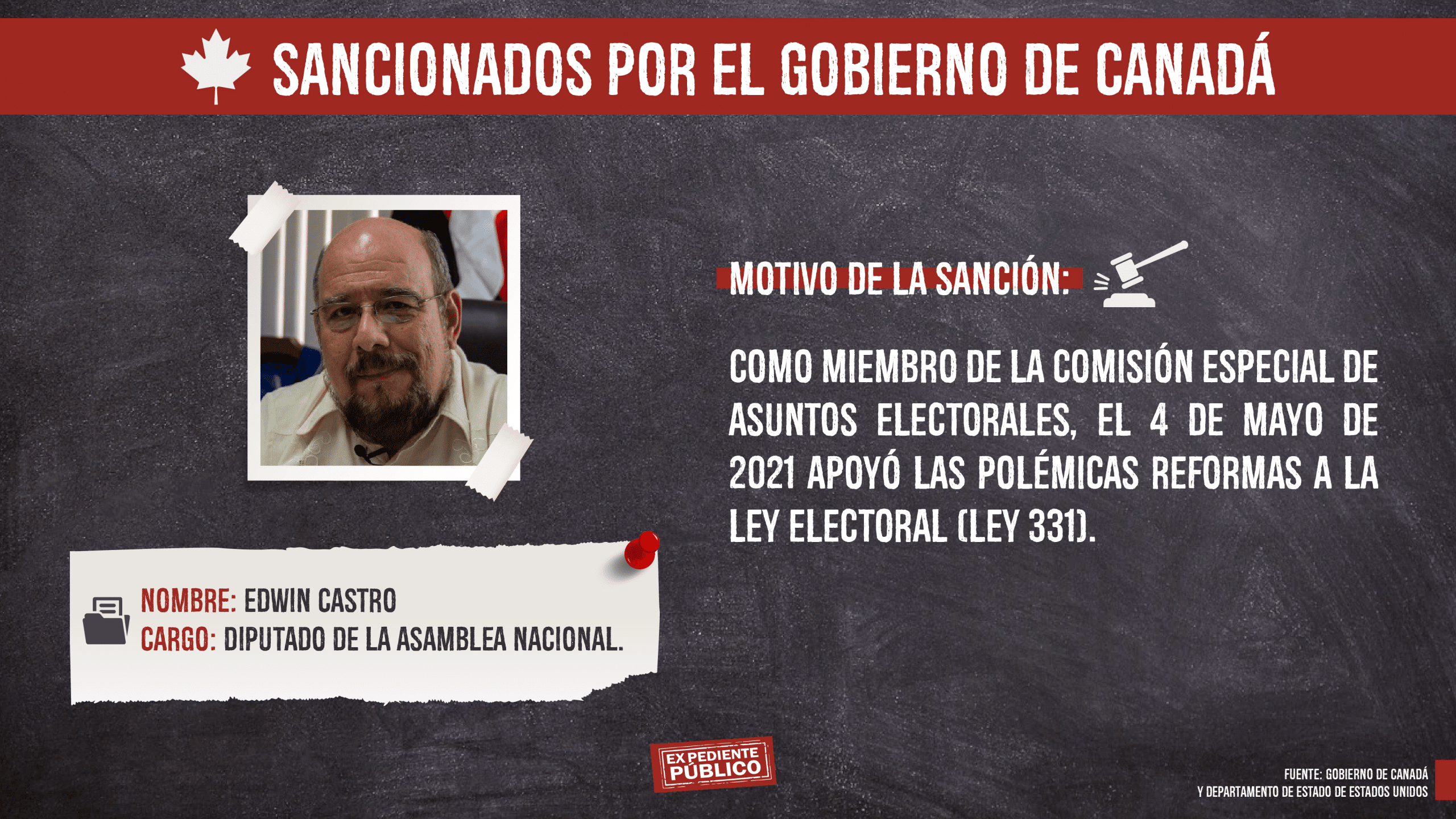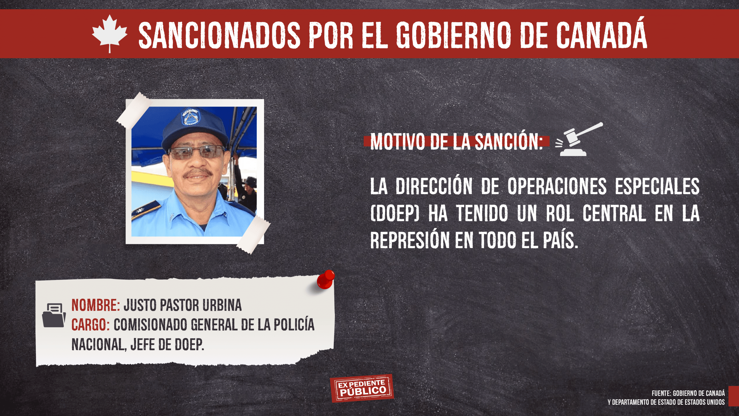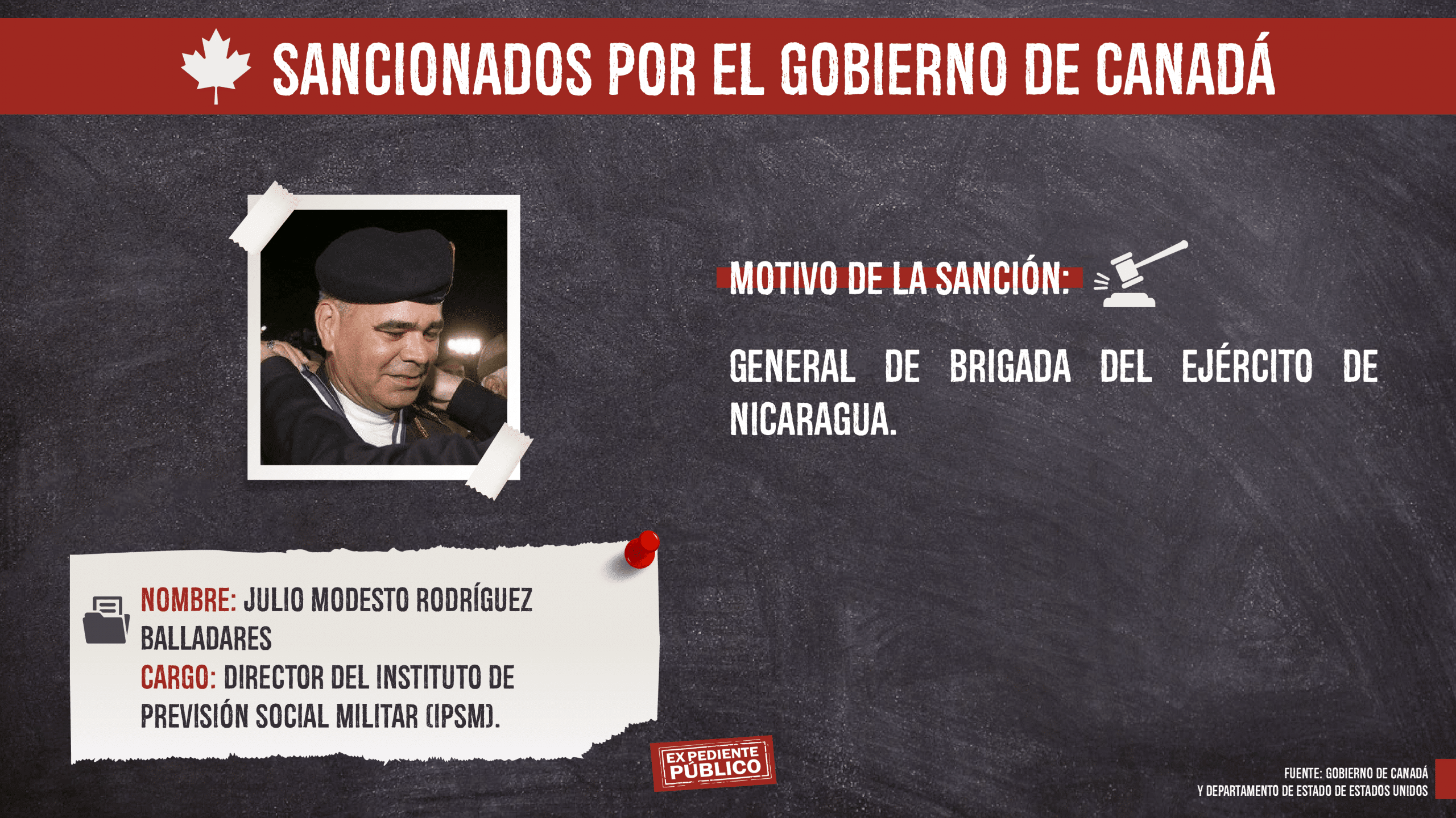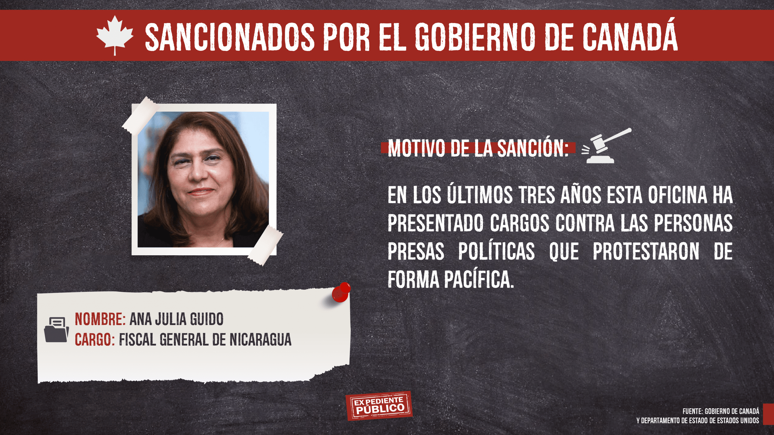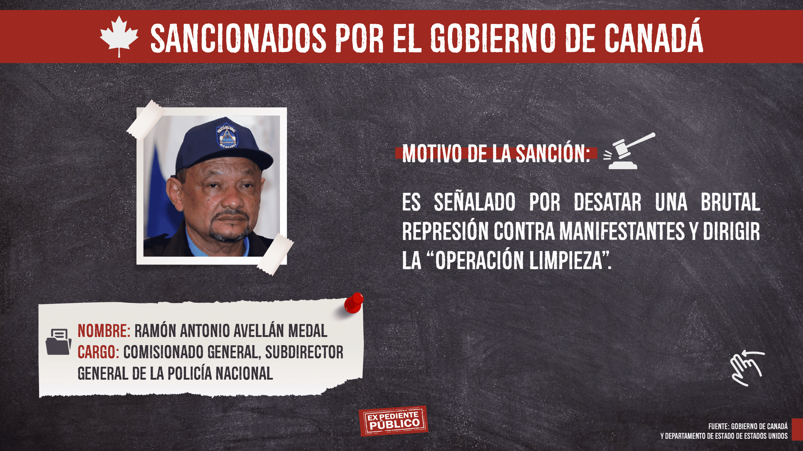 Canadá también sancionó hace dos años a la vicepresidenta Rosario Murillo y su hijo Laureano Ortega, principal funcionario para la adquisición de inversiones, además, se incluyó en la lista el presidente del Parlamento, Gustavo Porras; la ministra de Salud, Sonia Castro; el director de Telecomunicaciones, Orlando Castillo, el ministro de Transporte, Óscar Mojica, el jefe de la Policía, Francisco Díaz, el secretario de la Alcaldía de Managua, Fidel Moreno, y el asesor de seguridad, Néstor Moncada.