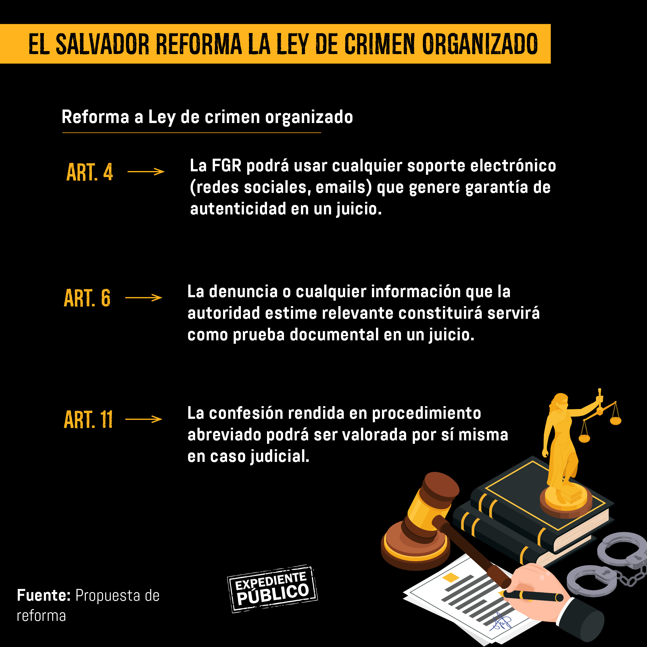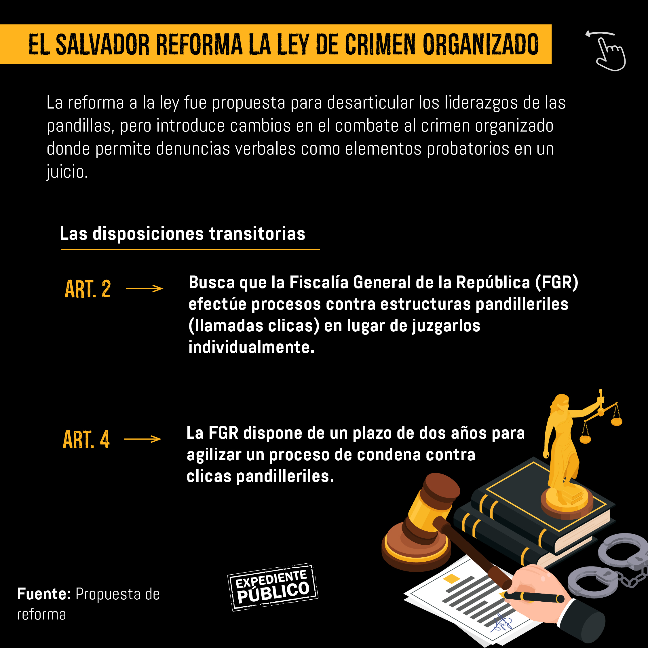 “Adicionalmente a la solicitud de prórroga estamos adjuntando dos anteproyectos de ley. Una son reformas a la Ley de crimen organizado que nos va a permitir agilizar los trámites ante los tribunales de crimen organizado”, anunció el pasado 12 de julio el ministro de Justicia y Seguridad Pública, Gustavo Villatoro al solicitar en la Asamblea Legislativa la décima sexta extensión del régimen de excepción.