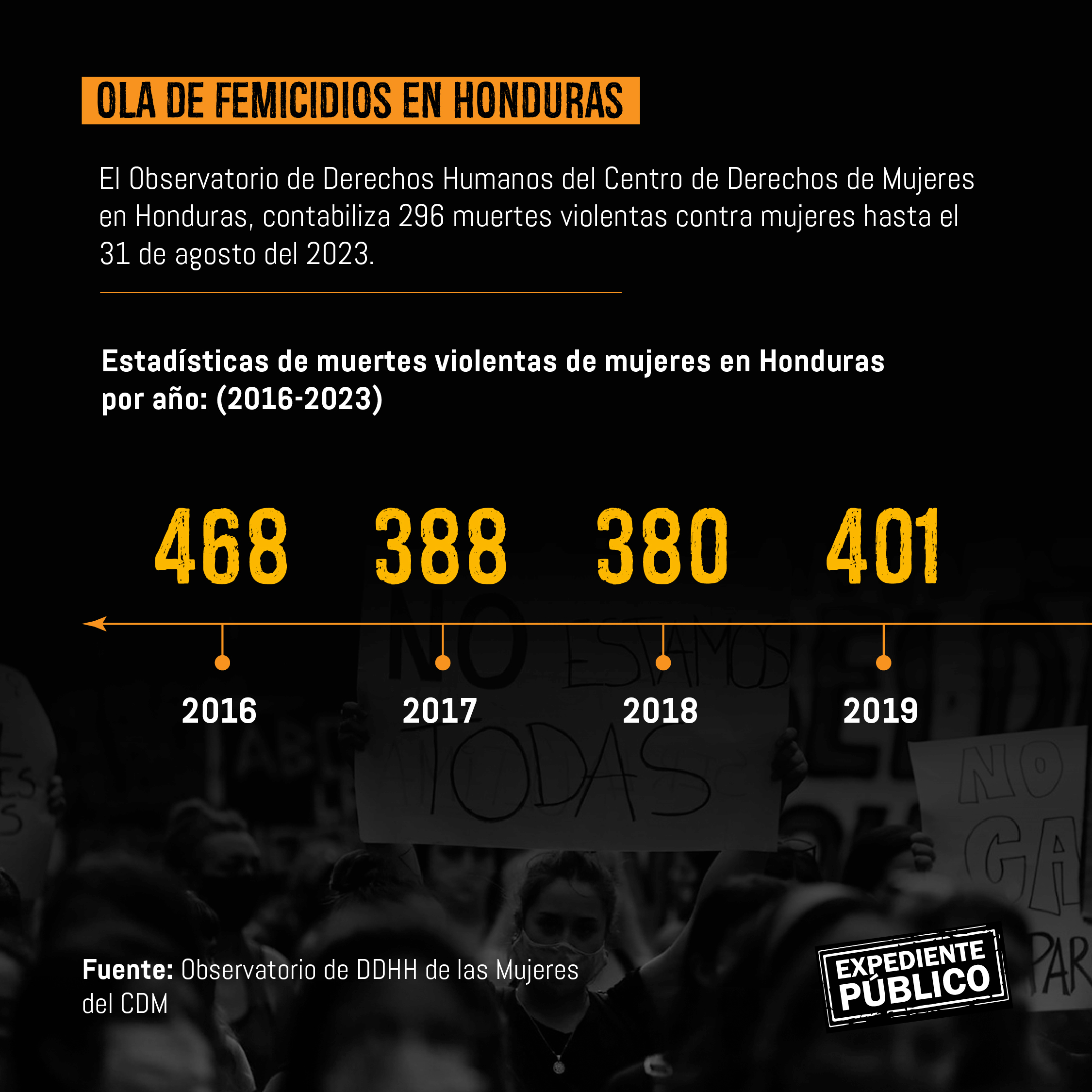 La ola de feminicidios en Honduras es una latente preocupación tanto a nivel nacional como internacional. El Observatorio del Centro de Derechos de las Mujeres ha registrado hasta la fecha del 2023, 296 muertes violentas de mujeres.