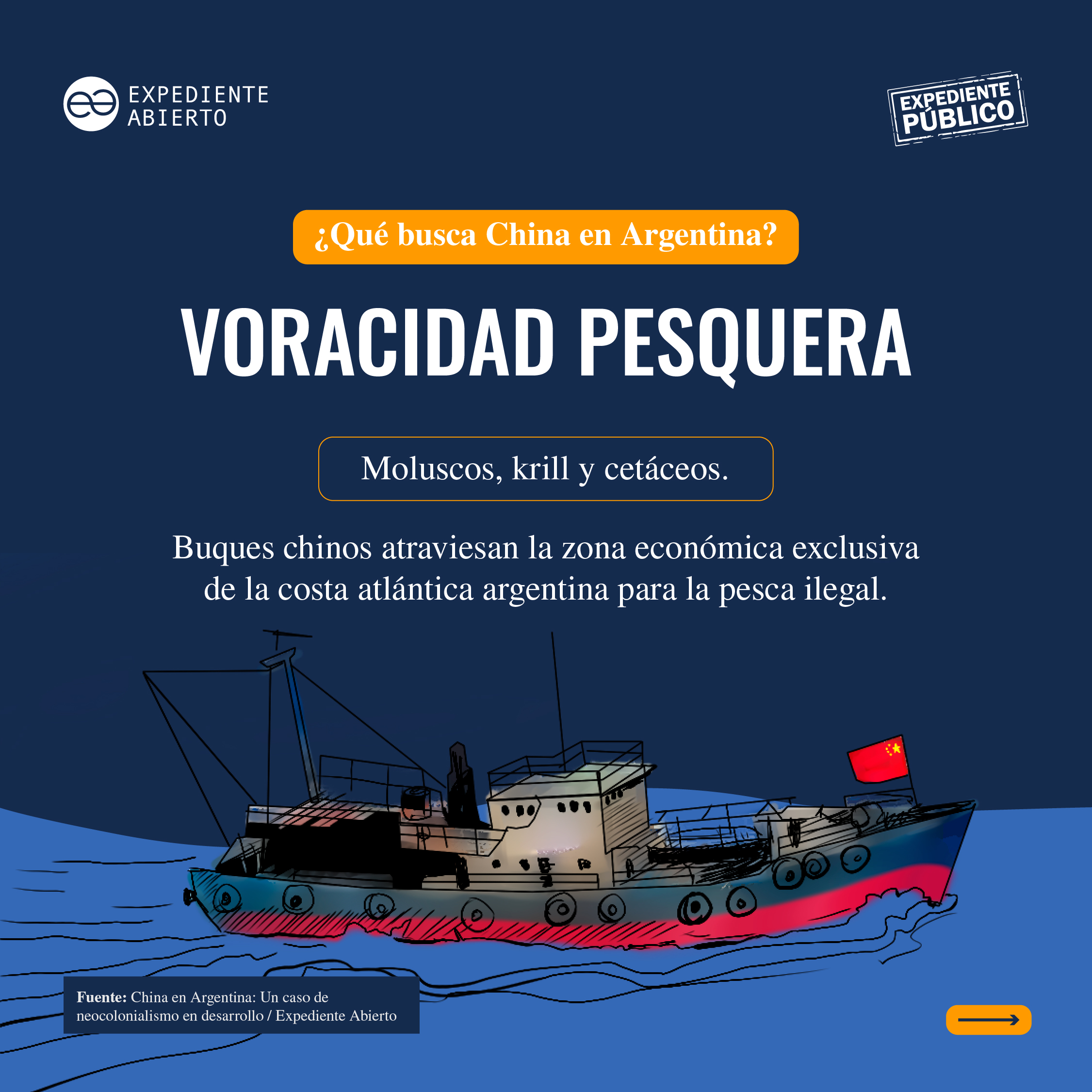 La investigación de Expediente Abierto expone otro fenómeno de la capacidad devoradora de China en la zona económica exclusiva del litoral atlántico argentino, donde los buques chinos llevan a cabo actividades de pesca ilegal, lo que supone una “depredación de especies en extinción como moluscos, krill y cetáceos”.