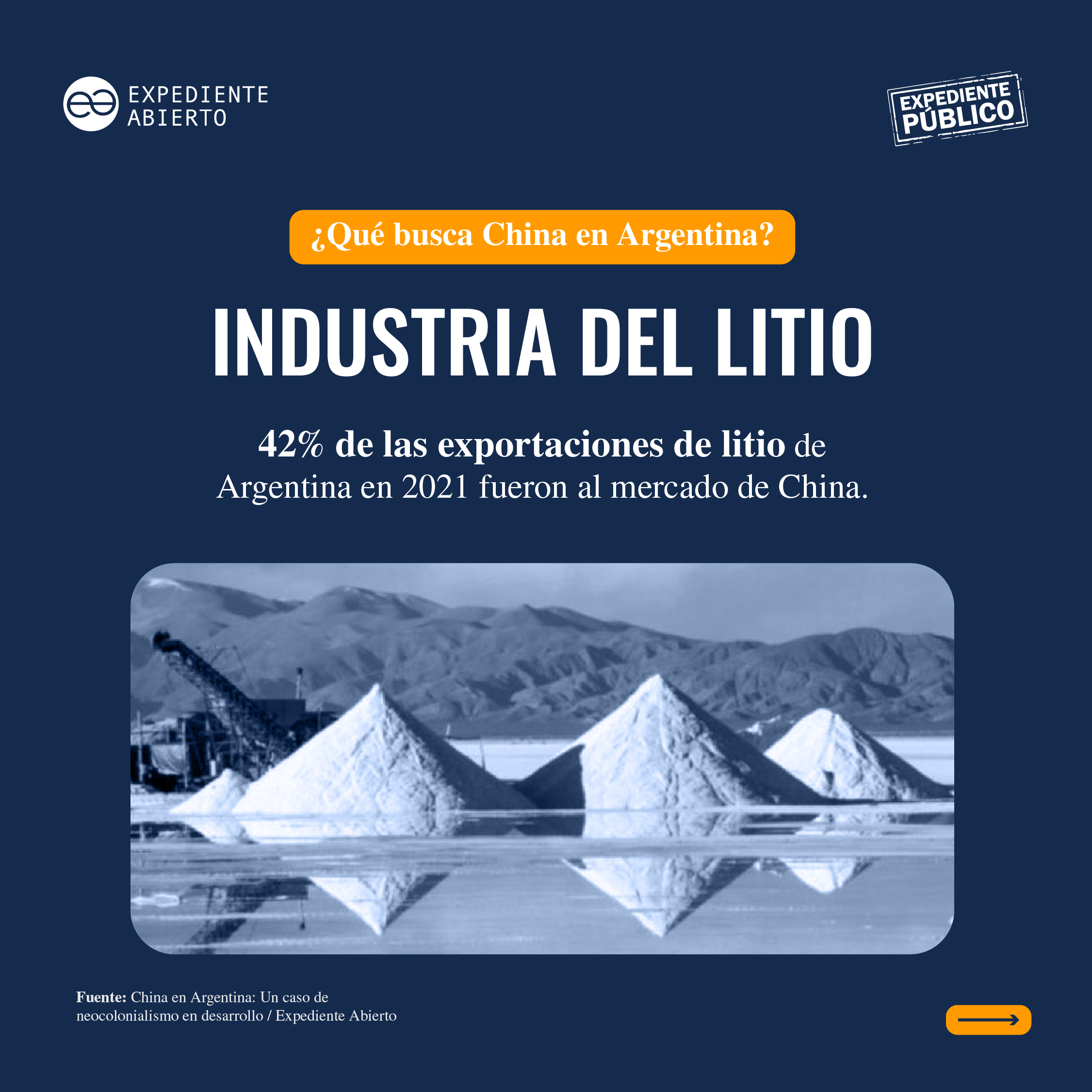 Uno de los intereses de Pekín en Argentina está en lo que los especialistas llaman el nuevo ‘oro blanco’, es decir la producción de litio. El 42% de las exportaciones de litio que salieron de Argentina en 2021 fueron al mercado de China.
