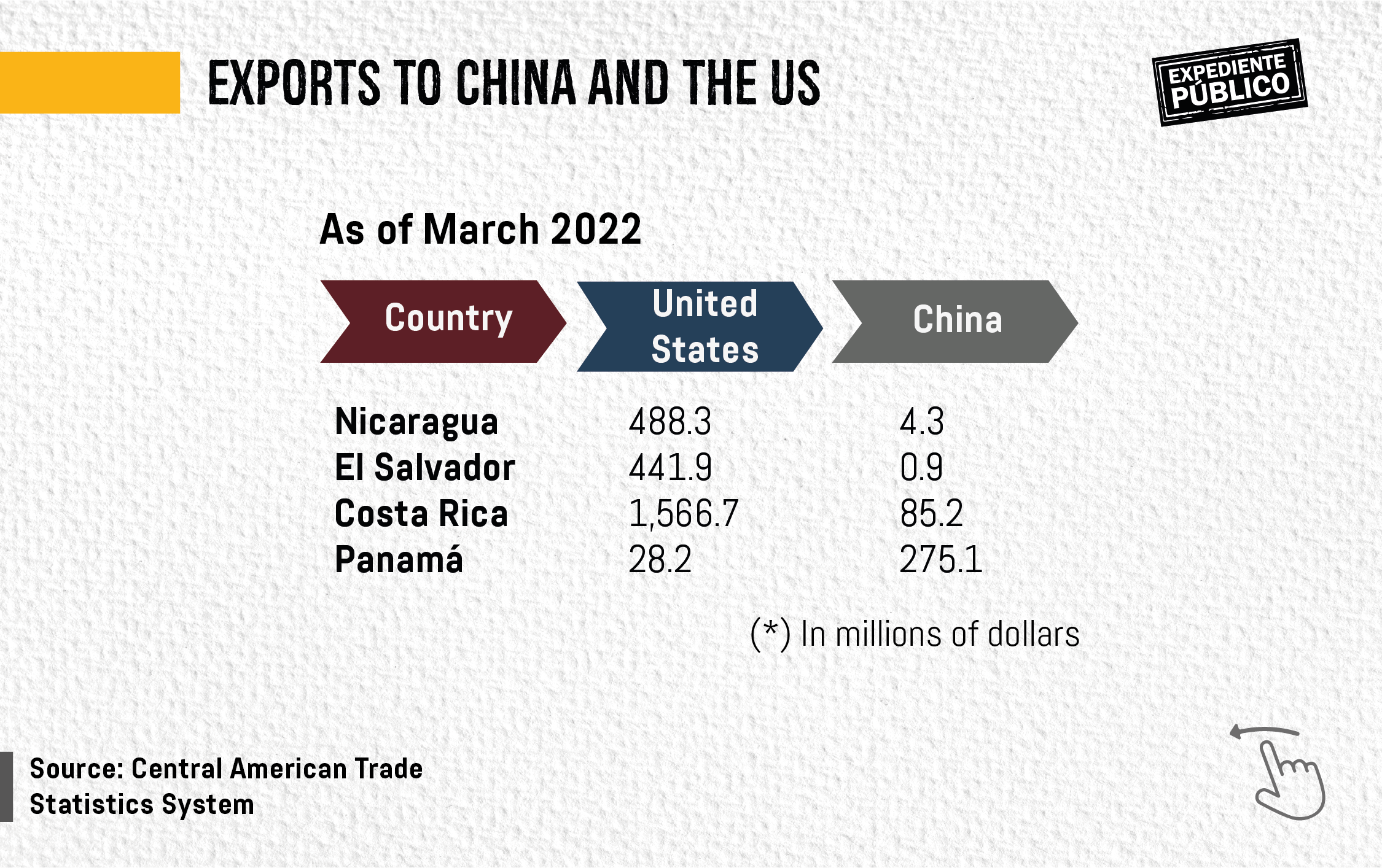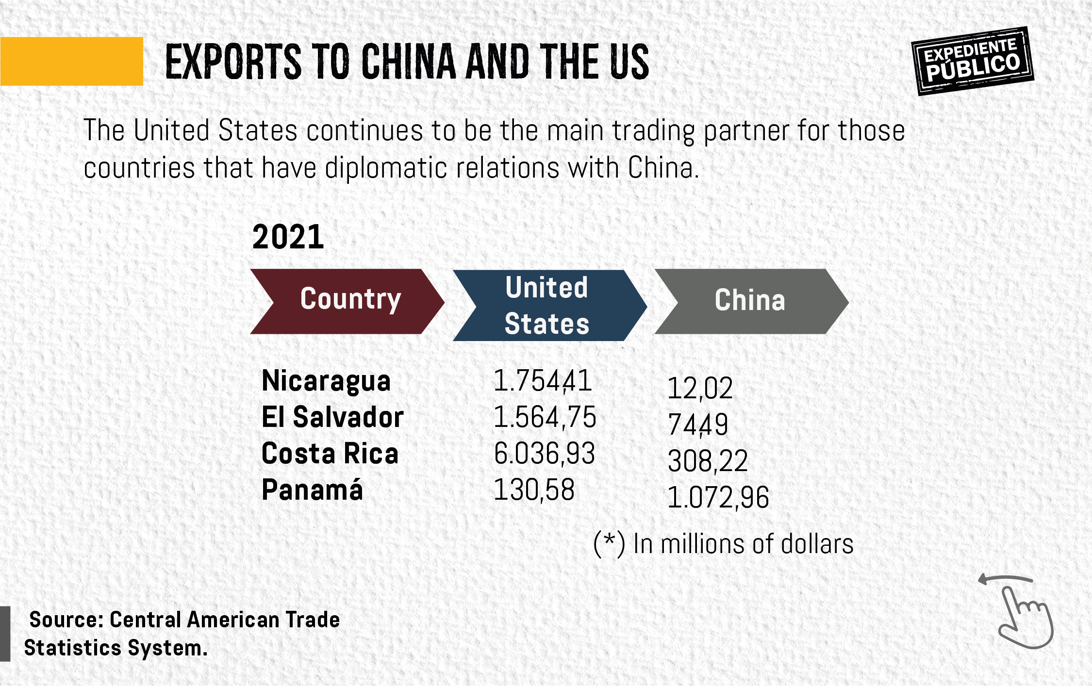 The United States, considered the world’s leading economy, is El Salvador’s main trading partner. Data from the Central American Trade Statistics System (SIECA in Spanish) show that in 2021 the small Central American country sold US$1,564.75 million to the US market, while its exports to China reached just US$74.49 million.