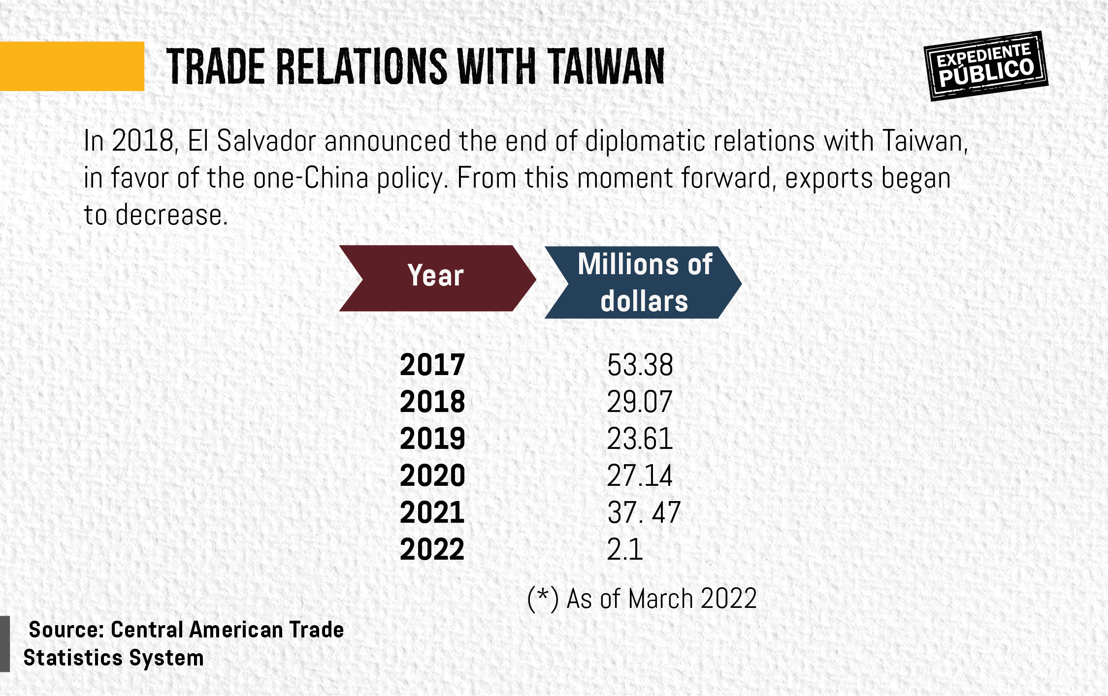 El Salvador was the third Central American country to break diplomatic relations with Taiwan. On August 21, 2018, during the administration of Salvador Sánchez Cerén, the government exported US$53.38 million to the island, while it exported only US$46.85 million to China that same year, according to data from SIECA.