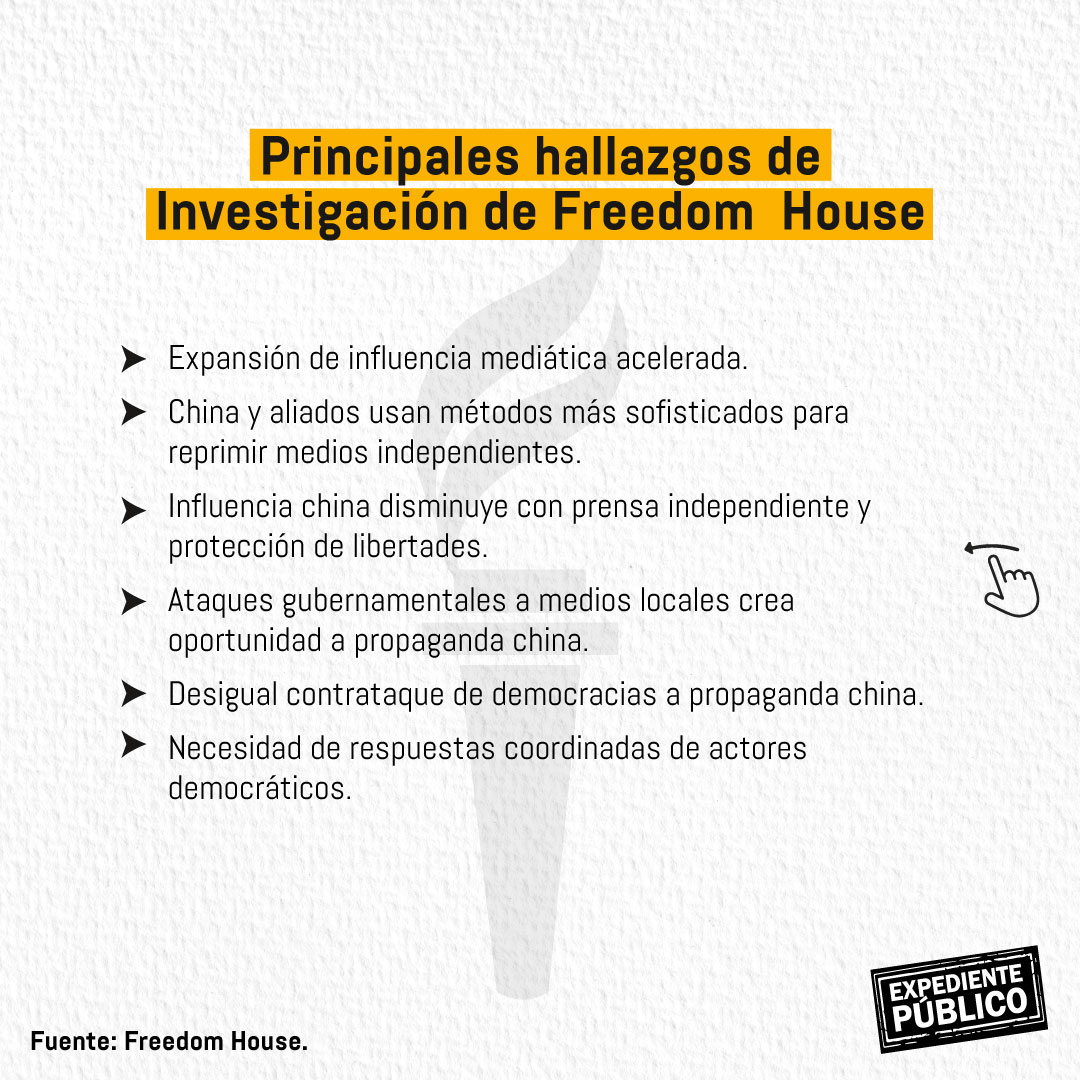 “No miramos a esos países particularmente porque estábamos observando el extremo más democrático del espectro. Lo que me imagino es que algunas de las cosas que ya vio en los entornos democráticos serían aún más fuertes ahí, como esos lazos con las élites y luego las propias élites ejercen su propio control”, explicó Sarah Cook, directora de investigación de China, Hong Kong y Taiwán de Freedom House.