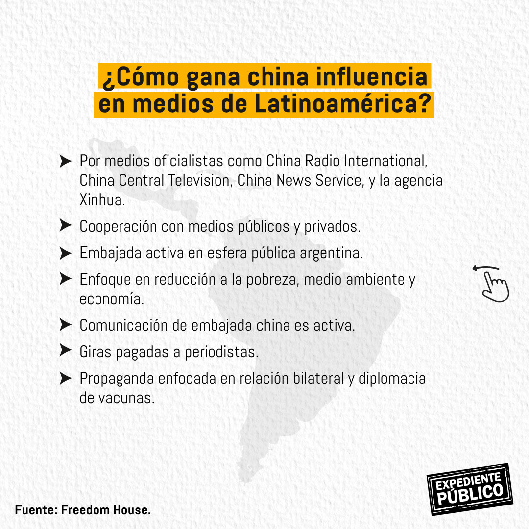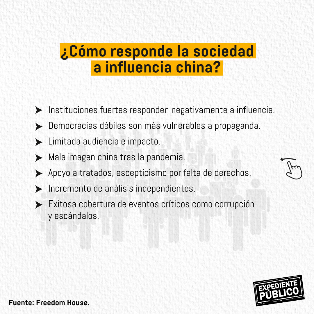 Así cuatro países del continente americano se mostraron vulnerables a la influencia del aparato de medios y propaganda chino: Argentina, México, Panamá y Perú, mientras Colombia, Chile y Brasil se mostraron resistentes.