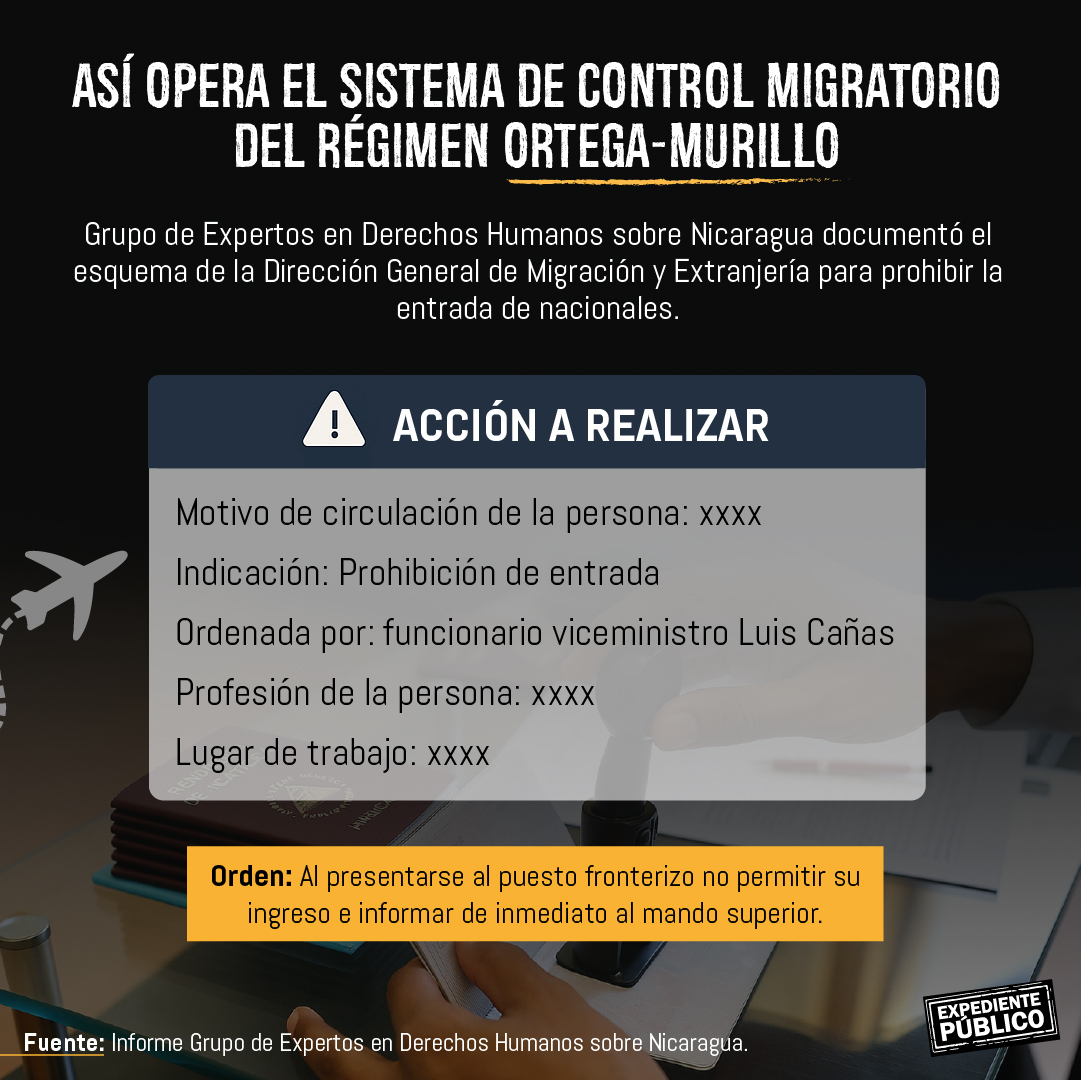 El régimen Ortega-Murillo, en esta serie de restricciones de ingreso, comprobó el GHREN, siguió un patrón sistemático tanto por vía aérea como terrestre, utilizando como método común las listas de pasajeros que solicita con antelación la Dirección General de Migración y Extranjería de Nicaragua a aerolíneas y empresas de transporte internacional terrestre.