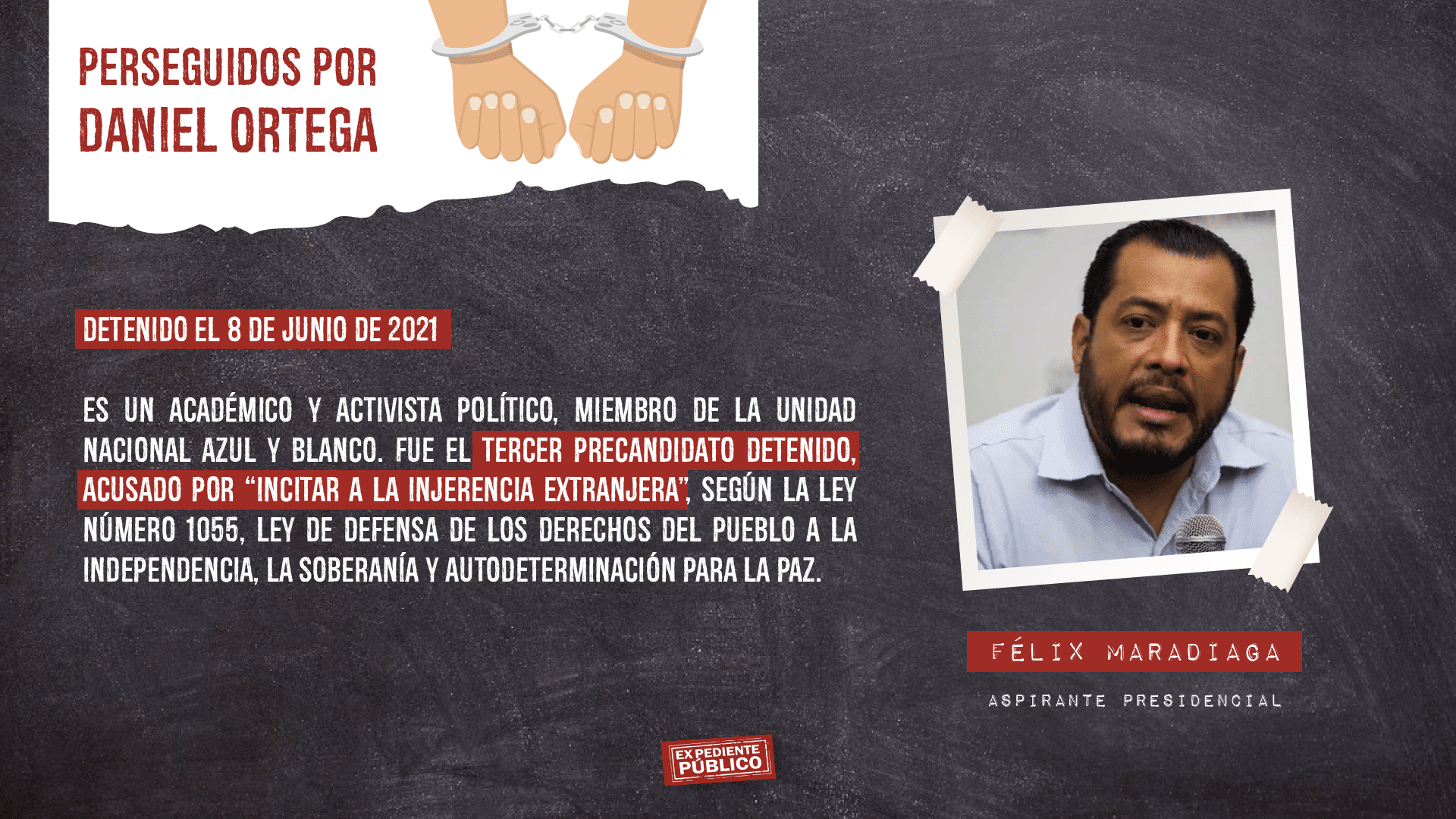 Entre los encarcelados están la periodista Cristiana Chamorro, hija de la expresidenta Violeta Barrios de Chamorro; el académico Arturo Cruz; el periodista Miguel Mora; Medardo Mairena, miembro del Movimiento Campesino; el politólogo Félix Maradiaga y el director ejecutivo de la Alianza Cívica Juan Sebastián Chamorro. Todos son aspirantes presidenciales, y a cinco de ellos la Fiscalía los acusa de promover accesiones de injerencia extranjera al promover sanciones al régimen sandinista por las violaciones a los derechos humanos.
