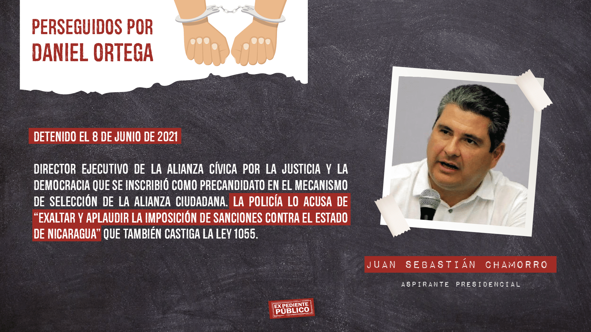 El pasado 8 de junio, la Policía también detuvo al director ejecutivo de la Alianza Cívica, Juan Sebastián Chamorro, el cuarto en aspirar a la presidencia que fue encarcelado. Chamorro también enfrenta un proceso penal por supuestamente violar la Ley número 1055, “Ley de Defensa de los Derechos del pueblo a la Independencia, la Soberanía y Autodeterminación para la Paz”.