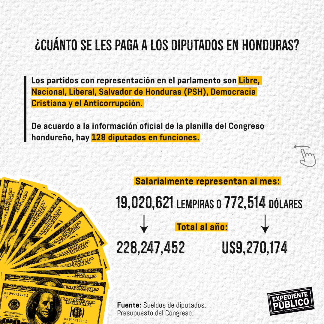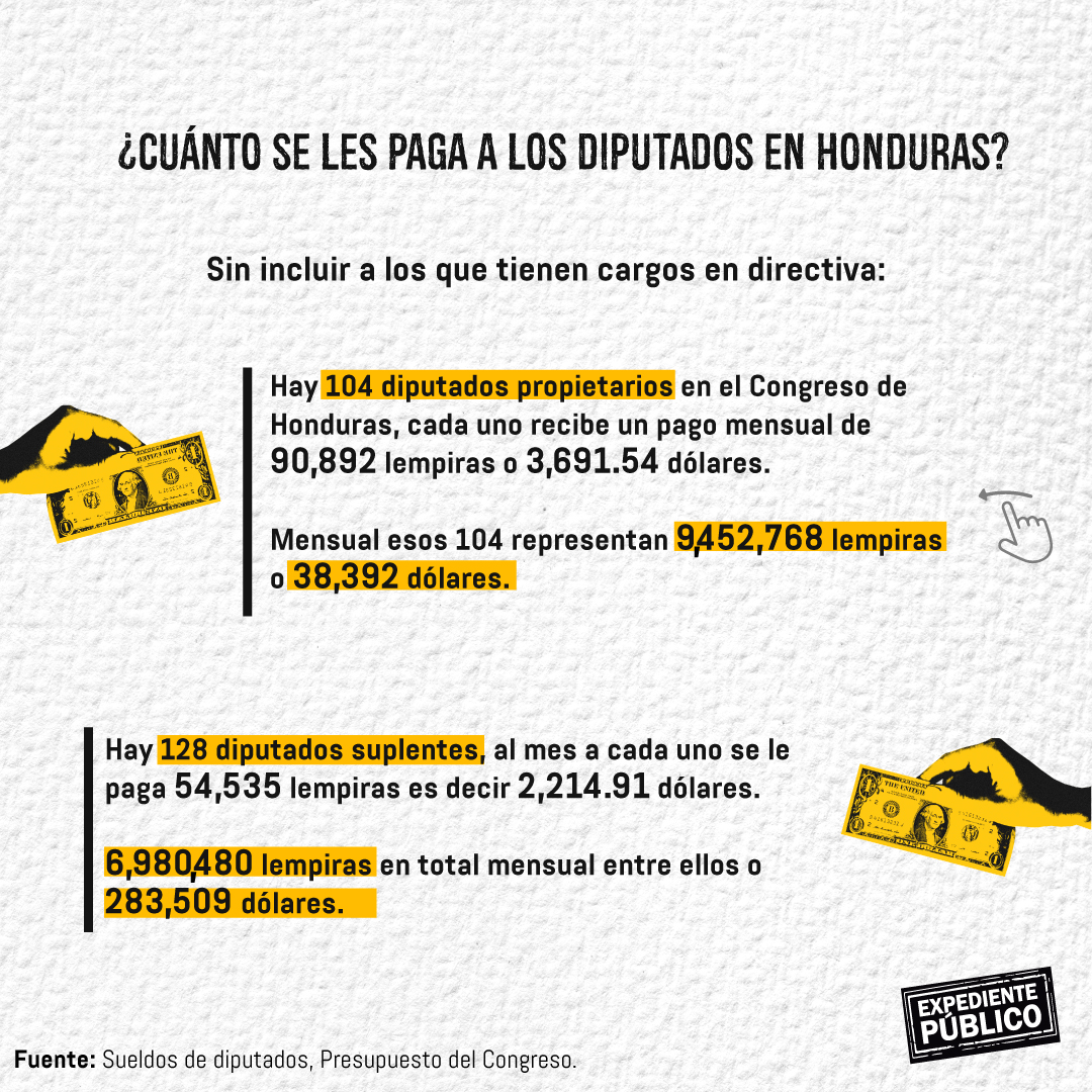 Con base en informes del Portal Único de Transparencia IAP del Congreso Nacional, Expediente Público ha constatado que los diputados propietarios reciben un salario de 90,892 lempiras (unos 3,691 dólares). Es decir que 9,452,768 de lempiras o 38,392 dólares se destinan a las planillas salariales de los 104 diputados propietarios cada mes.