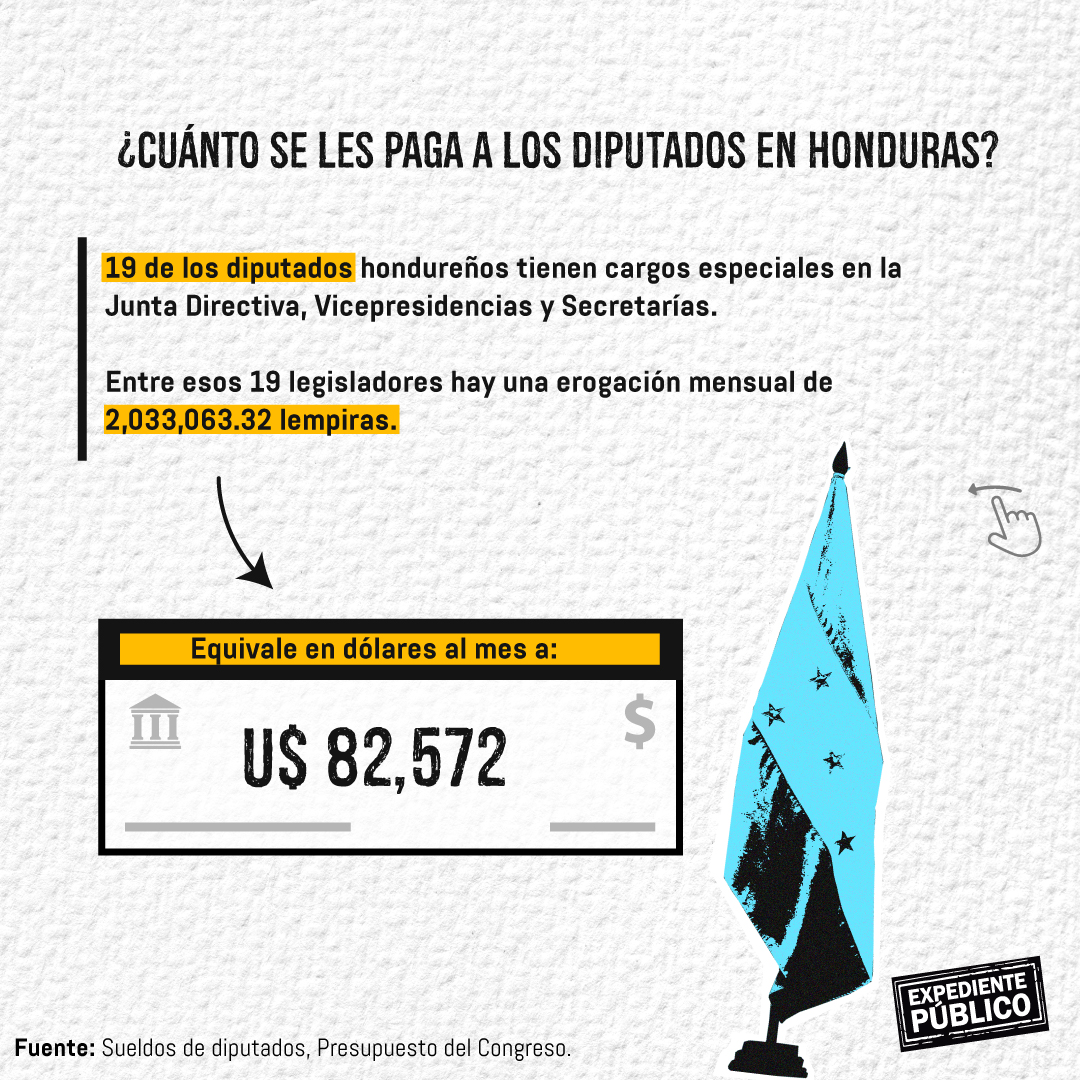 La planilla la complementan otros 19 legisladores hondureños que tienen cargos especiales en la Junta Directiva como el presidente, siete vicepresidentes, cinco vicepresidentes alternos, dos secretarios, dos secretarios alternos y dos prosecretarios. Entre ellos se concentra una erogación mensual de 2,033,063.32 lempiras equivalente a U$82,572 dólares al mes.