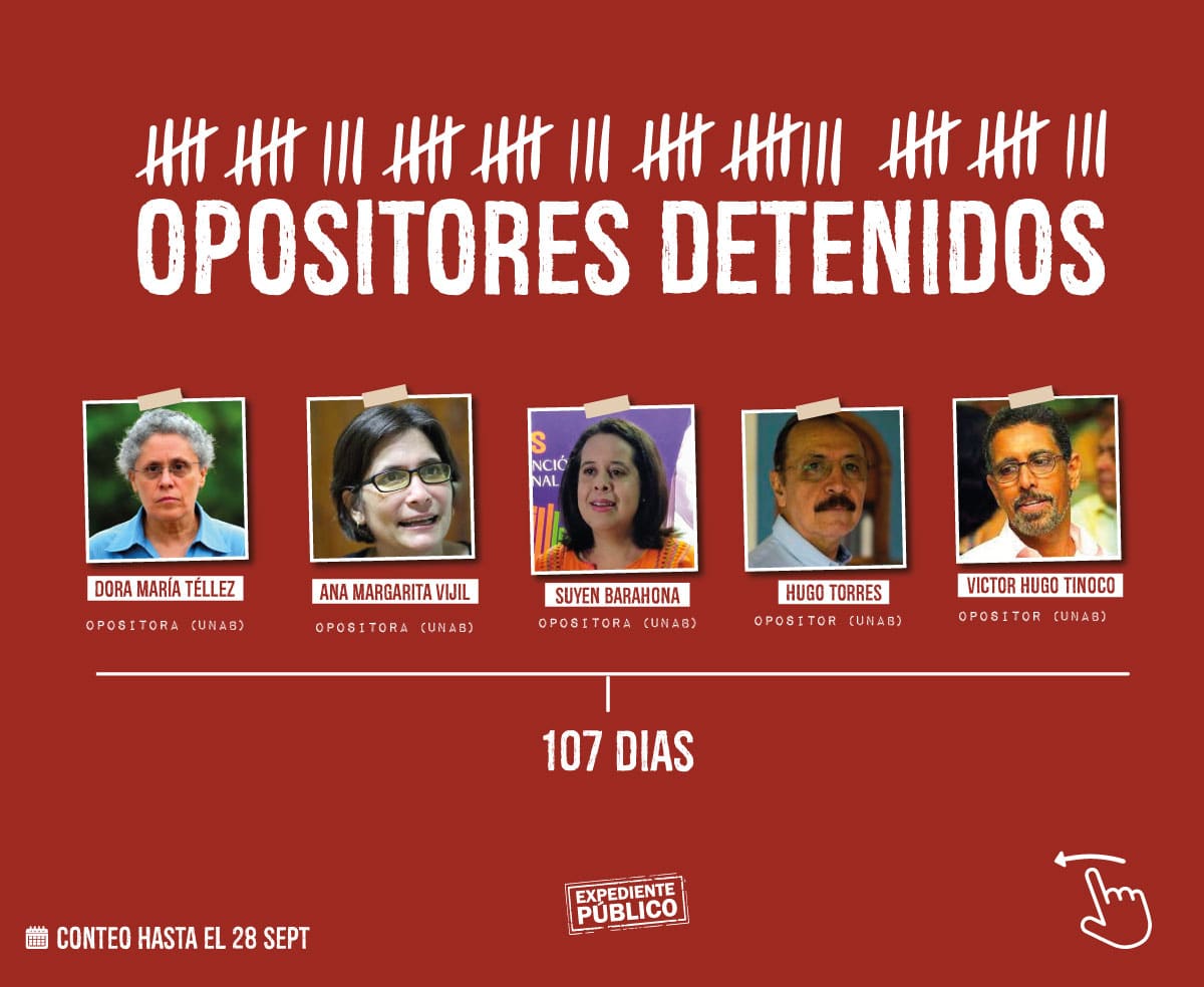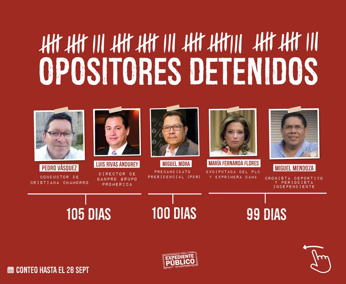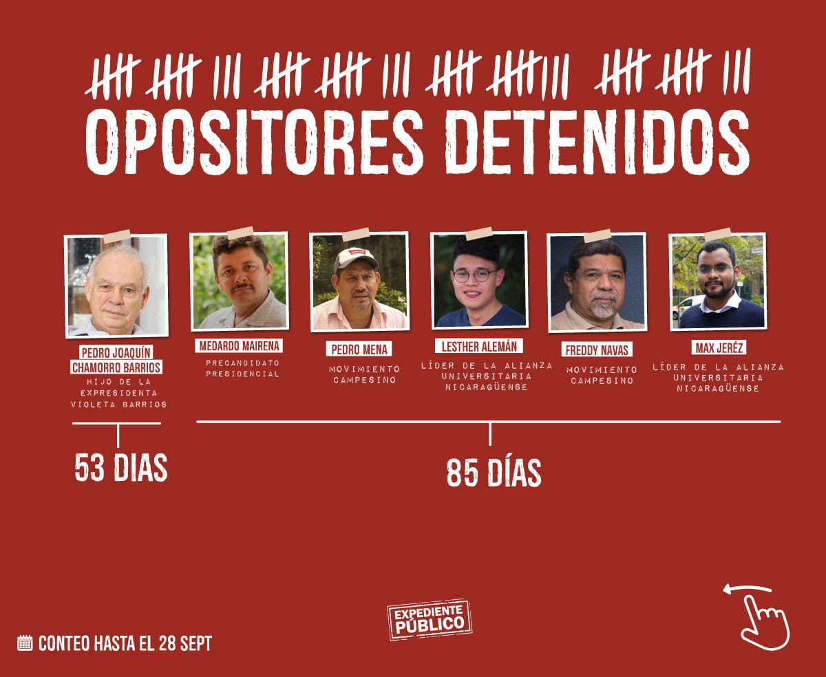 Desde el 28 de mayo la redada de detenciones arbitrarias alcanzó a 37 nicaragüenses, entre ellos periodistas, defensores de derechos humanos, precandidatos presidenciales, líderes opositores de diferentes movimientos sociales y estudiantiles, quienes pasaron a formar parte de los 155 presos políticos que, según el Mecanismo para el reconocimiento de presos y presas políticas, mantiene en los centros penitenciarios de tortura el régimen desde el año 2018 a la fecha.