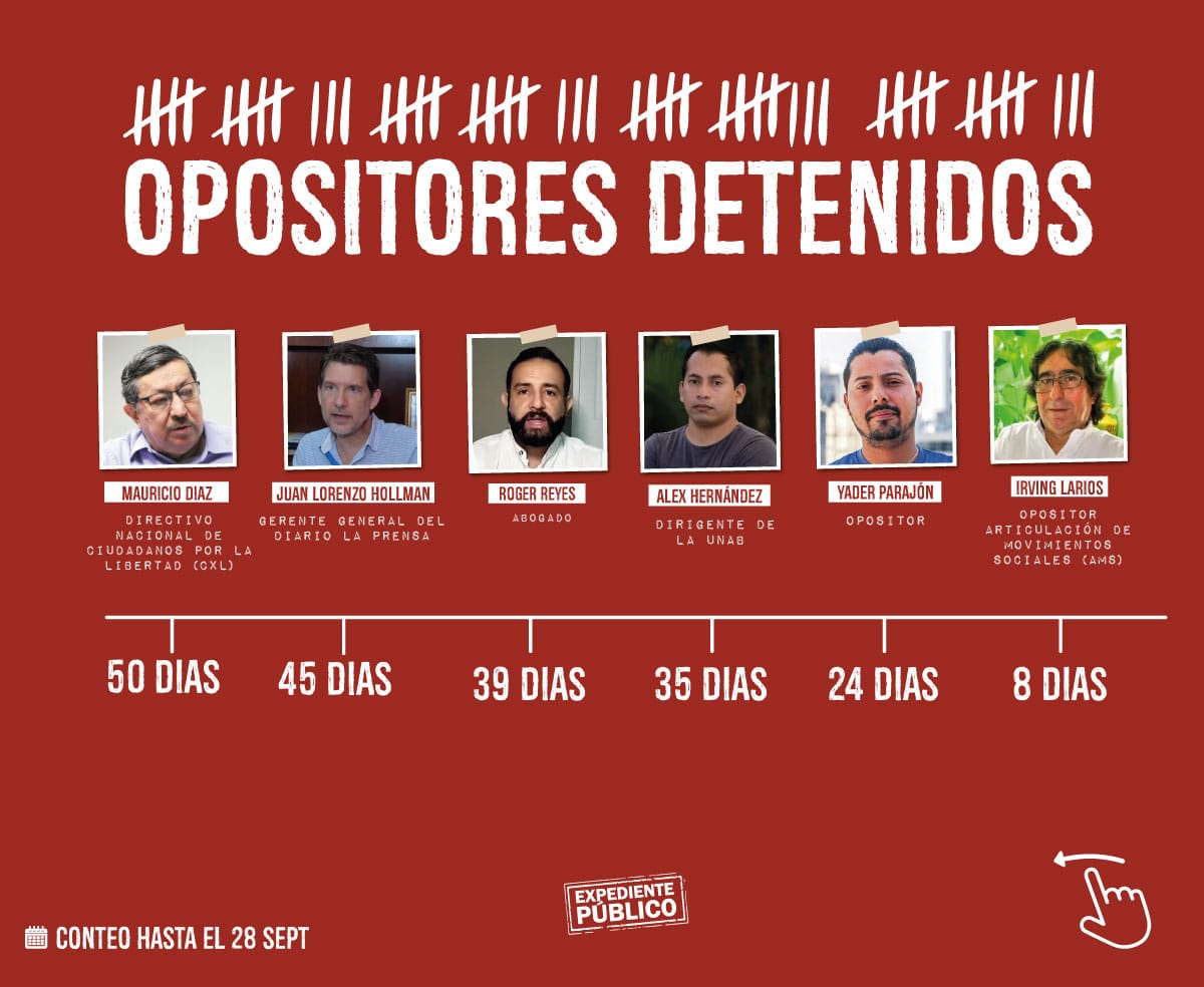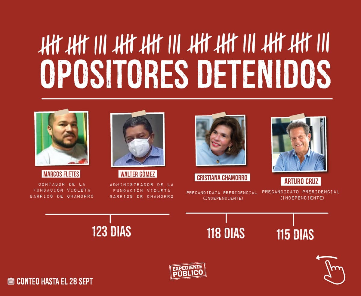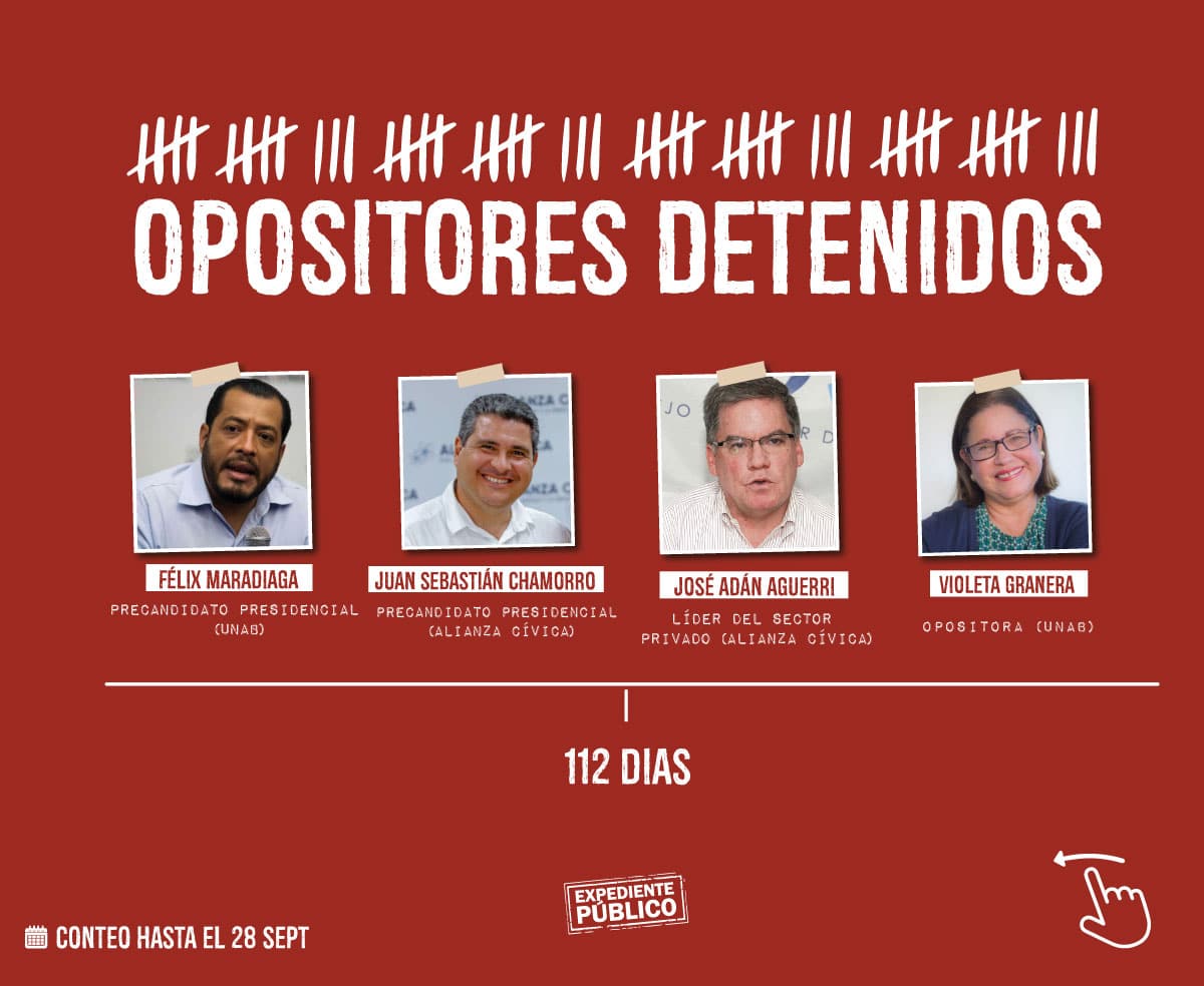 Desde el 28 de mayo la redada de detenciones arbitrarias alcanzó a 37 nicaragüenses, entre ellos periodistas, defensores de derechos humanos, precandidatos presidenciales, líderes opositores de diferentes movimientos sociales y estudiantiles, quienes pasaron a formar parte de los 155 presos políticos que, según el Mecanismo para el reconocimiento de presos y presas políticas, mantiene en los centros penitenciarios de tortura el régimen desde el año 2018 a la fecha.