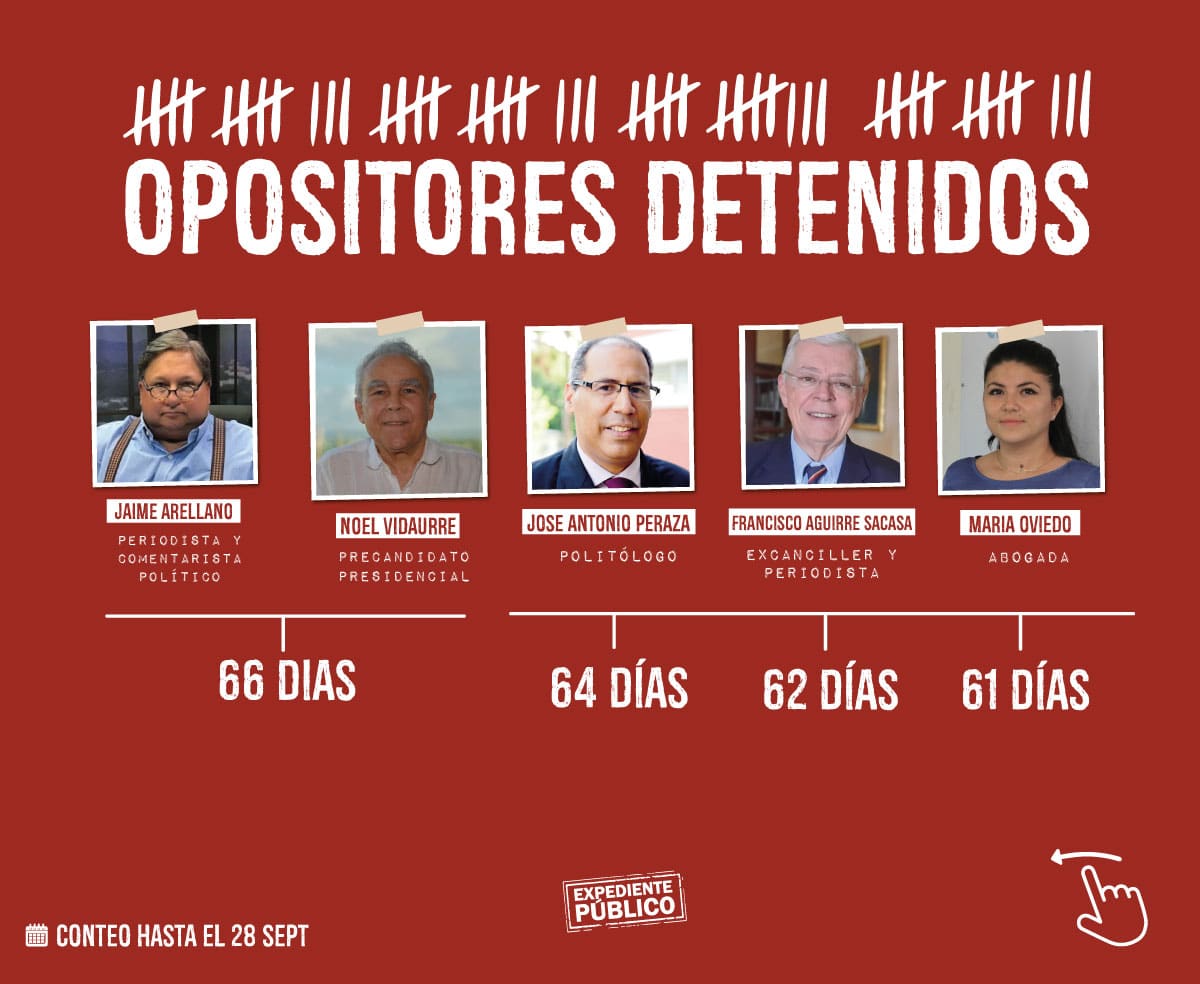 Personalidades como Lesther Alemán, Miguel Mora, Dora María Téllez, miembros de la familia Chamorro, entre otras que actualmente se encuentran detenidas, suponían una amenaza directa para el proceso de desmantelamiento a la democracia que el Estado de Nicaragua ha estado desarrollando: “La criminalización de la disidencia política representa el golpe definitivo del régimen de Ortega-Murillo a las elecciones previstas para el 7 de noviembre de este año”, añadió Berg.