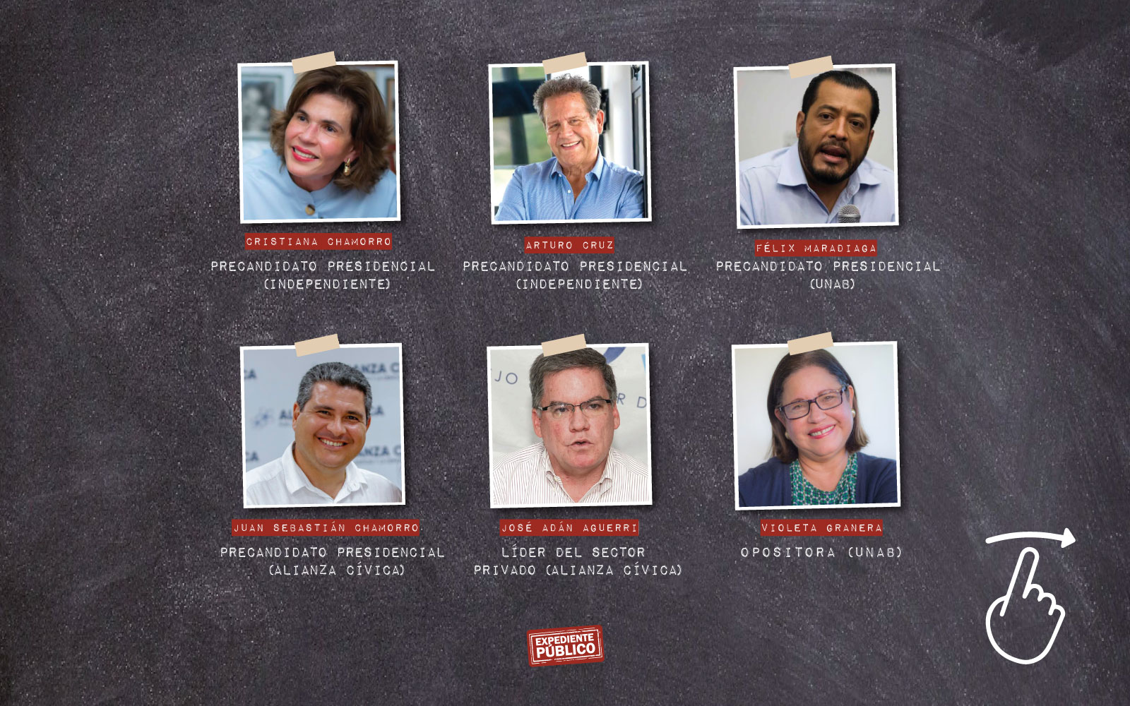 Entre el 28 de mayo y el 9 de junio del 2021, el régimen de Daniel Ortega y Rosario Murillo ha encarcelado y establecido casa por cárcel 21 líderes opositores, periodistas, empresarios y extrabajadores de la Fundación Violeta Barrios de Chamorro. En este grupo de presos políticos están los precandidatos presidenciales Cristiana Chamorro Barrios, Félix Maradiaga, Juan Sebastián Chamorro, Arturo Cruz y Miguel Mora. Pedro Joaquín Chamorro Barrios, hermano mayor de la precandidata Cristiana es el último opositor apresado el 25 de junio pasado.