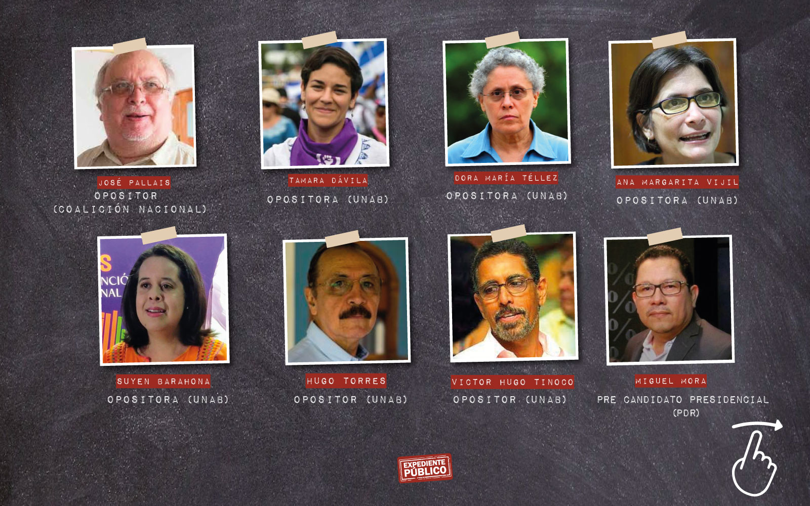 Los familiares de los detenidos así como organizaciones internacionales han denunciado la cacería de líderes opositores por parte de Ortega y Murillo, tiene el objetivo de no tener contrapeso en las elecciones previstas para el 7 de noviembre del 2021, en la que la pareja presidencial buscará reelegirse, en el caso de Ortega para un cuarto mandato consecutivo y el segundo para Murillo, esposa del mandatario nicaragüense.