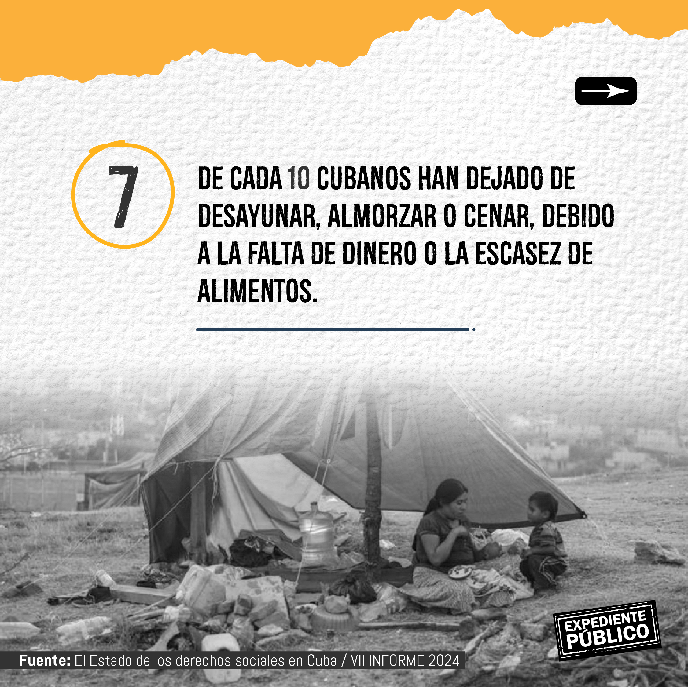 * Siete de cada 10 cubanos han dejado de desayunar, almorzar o comer, debido a la falta de dinero o la escasez de alimentos en Cuba. Esos son parte de los resultados de encuesta realizada por el Observatorio Cubano de Derechos Humanos (OCDH).