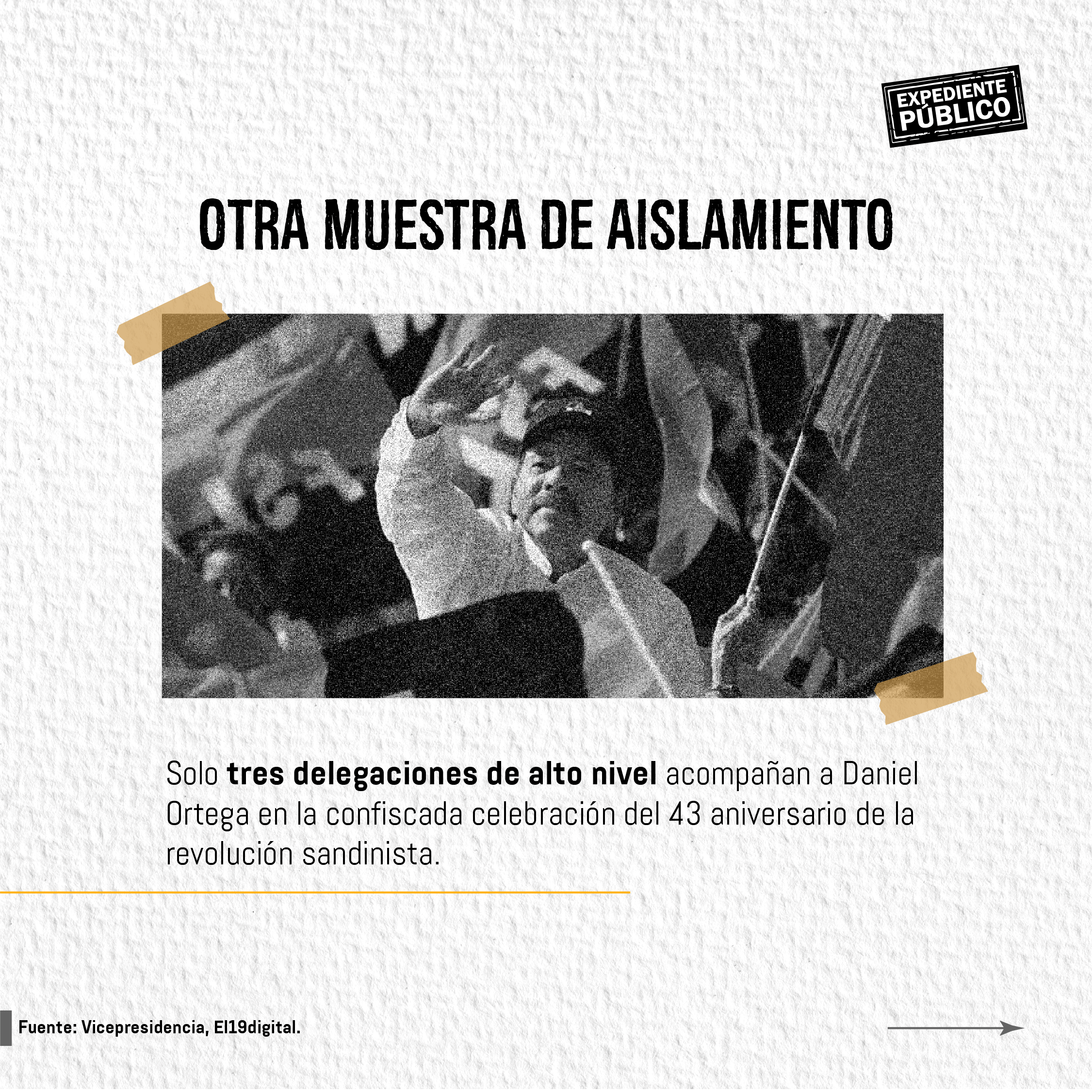 Una muestra del aislamiento que vive el régimen nicaragüense es que solo tres delegaciones de alto nivel lo acompañaron en la confiscada celebración del 43 aniversario de la revolución sandinista, entre ellos, Manuel Marrero, primer ministro de Cuba; Delcy Rodríguez, vicepresidenta de Venezuela y Ralph Gonsalves, primer ministro de San Vicente y las Granadinas, a quien entregaron la orden Augusto C. Sandino.