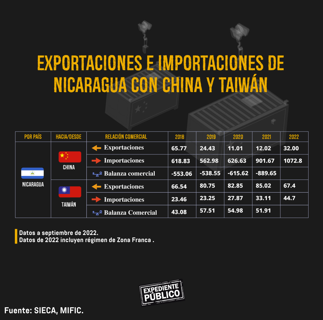 Según estadísticas de la Secretaría de Integración Económica Centroamericana (SIECA) y el Ministerio de Fomento, Industria y Comercio (MIFIC) en 9 meses del 2022 el déficit comercial de Nicaragua con China ronda los 949.2 millones de dólares, el más alto de su historia, Taiwán todavía tiene un balance positivo comercial de 22.7 millones de dólares, a pesar que ya rompieron relaciones hace un año.