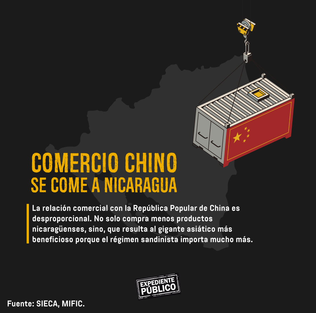 Nicaragua compra más a China comunista de lo que le exporta, un total de 9,733 millones de dólares en once años es la cifra de importaciones desde el país comunista, por su parte, la RPC solo importó 261 millones de dólares de productos nicaragüenses en este mismo periodo.