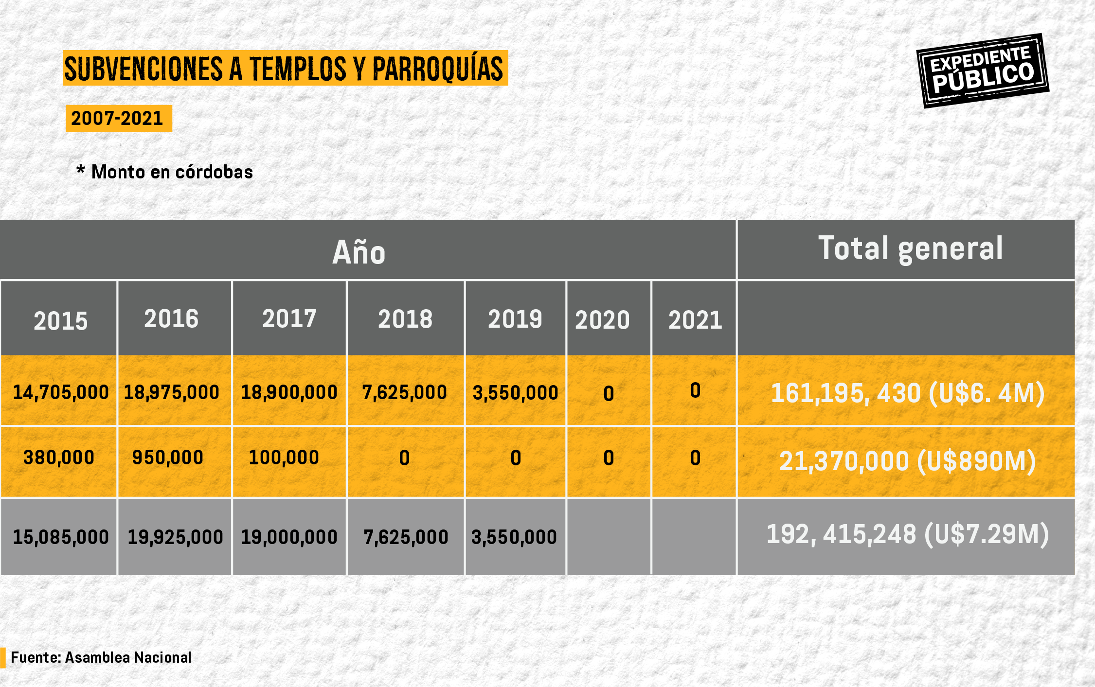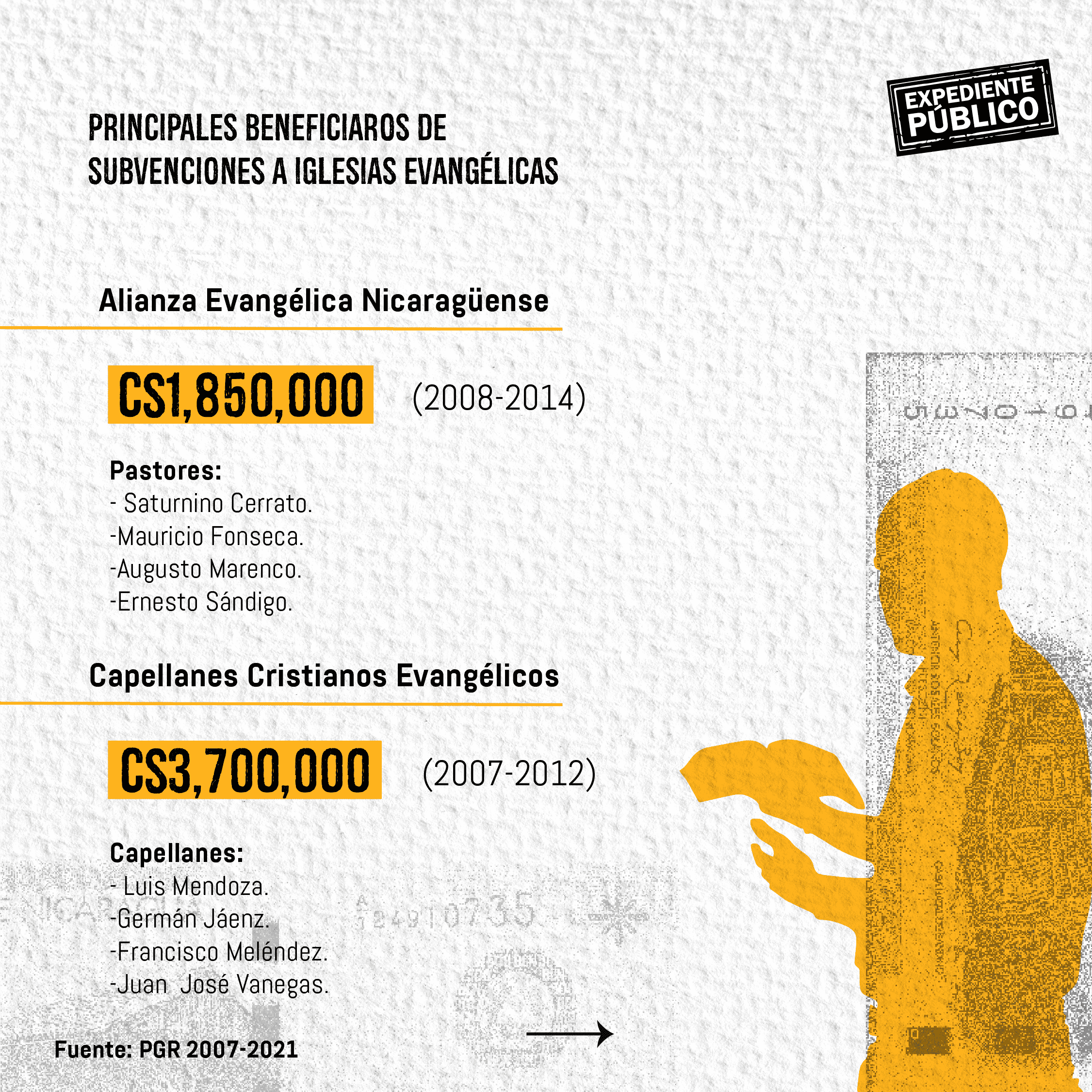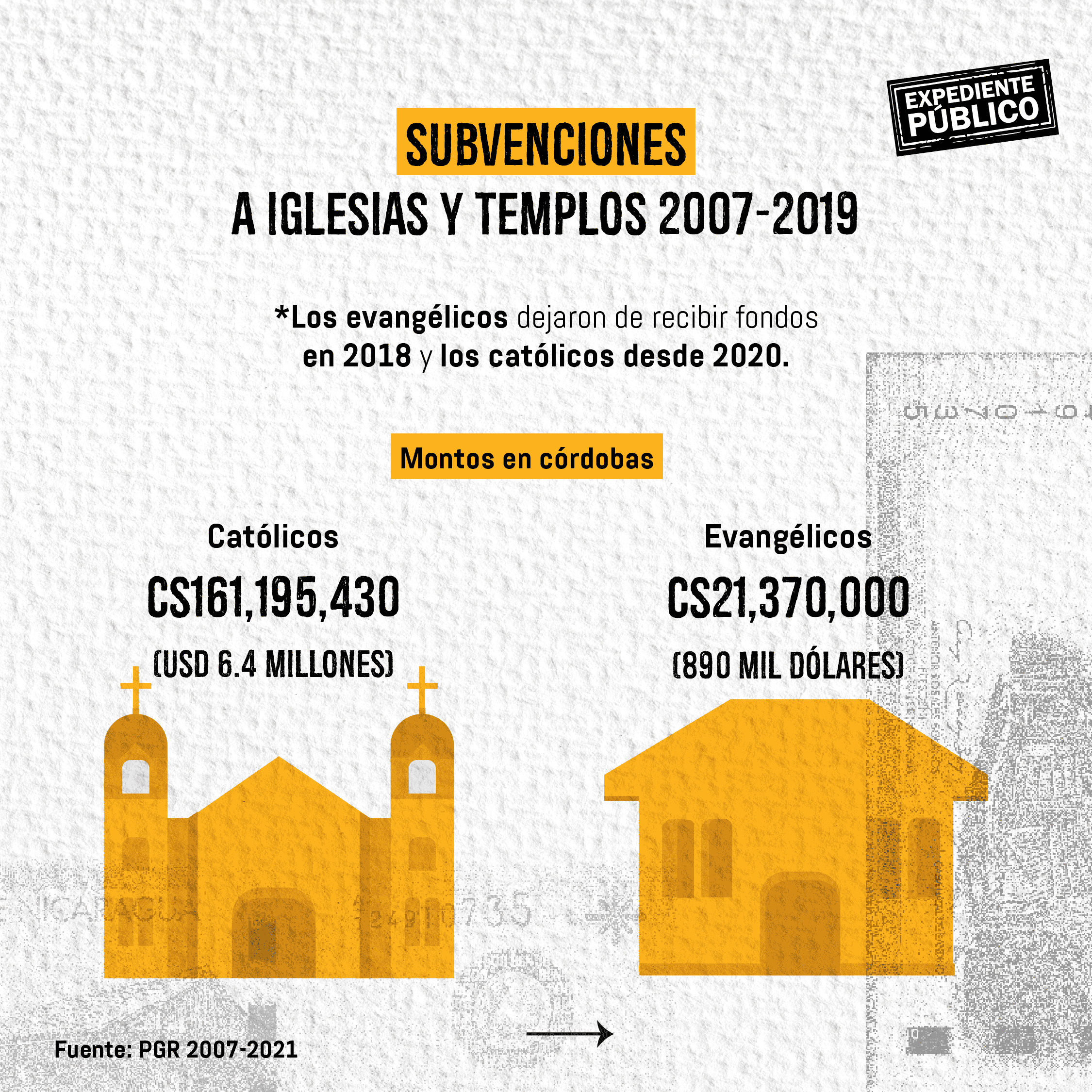 El régimen presupuestó entre 2007 y 2017 un total de C$21,370,000 en subvenciones para las iglesias evangélicas, unos 890 mil dólares al cambio promedio de la época, donde los principales beneficiados fueron al final los gremios de pastores más mediáticos. Sin embargo, desde 2018 eliminó todo tipo de fondos. En comparación, las parroquias católicas recibieron 161,195,430 córdobas de 2007 hasta 2019, alrededor de USD6.4 millones al promedio cambiario.