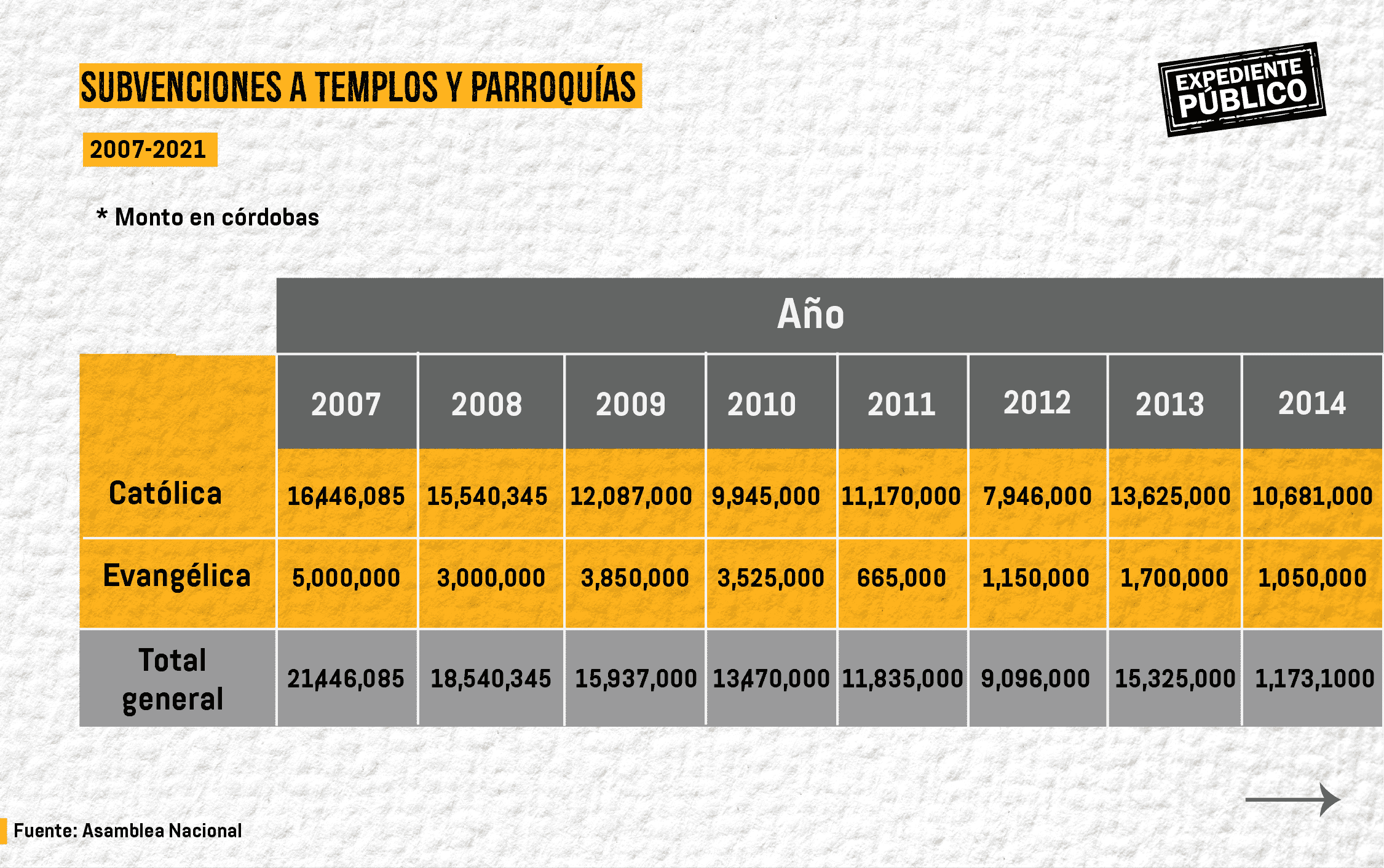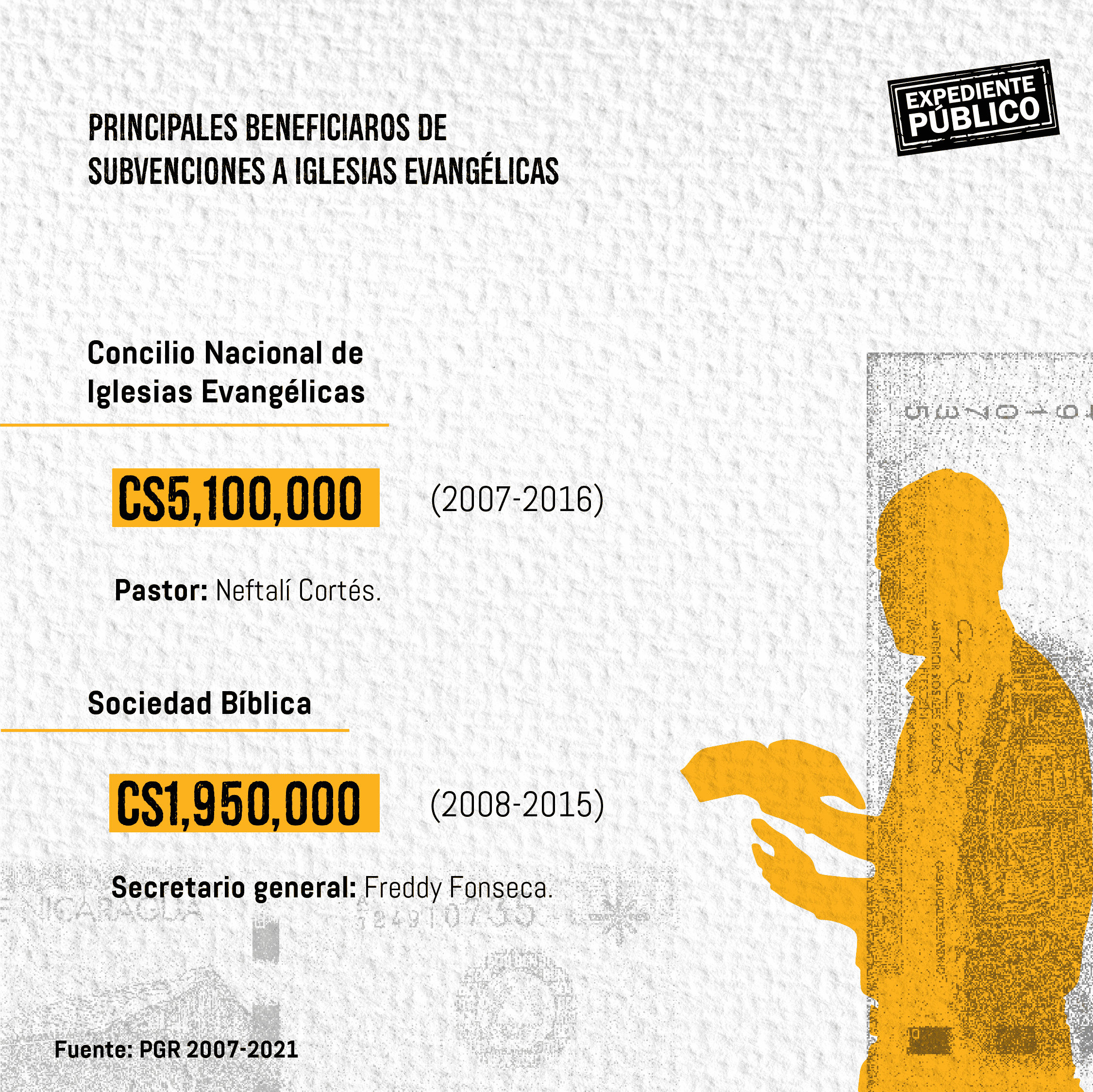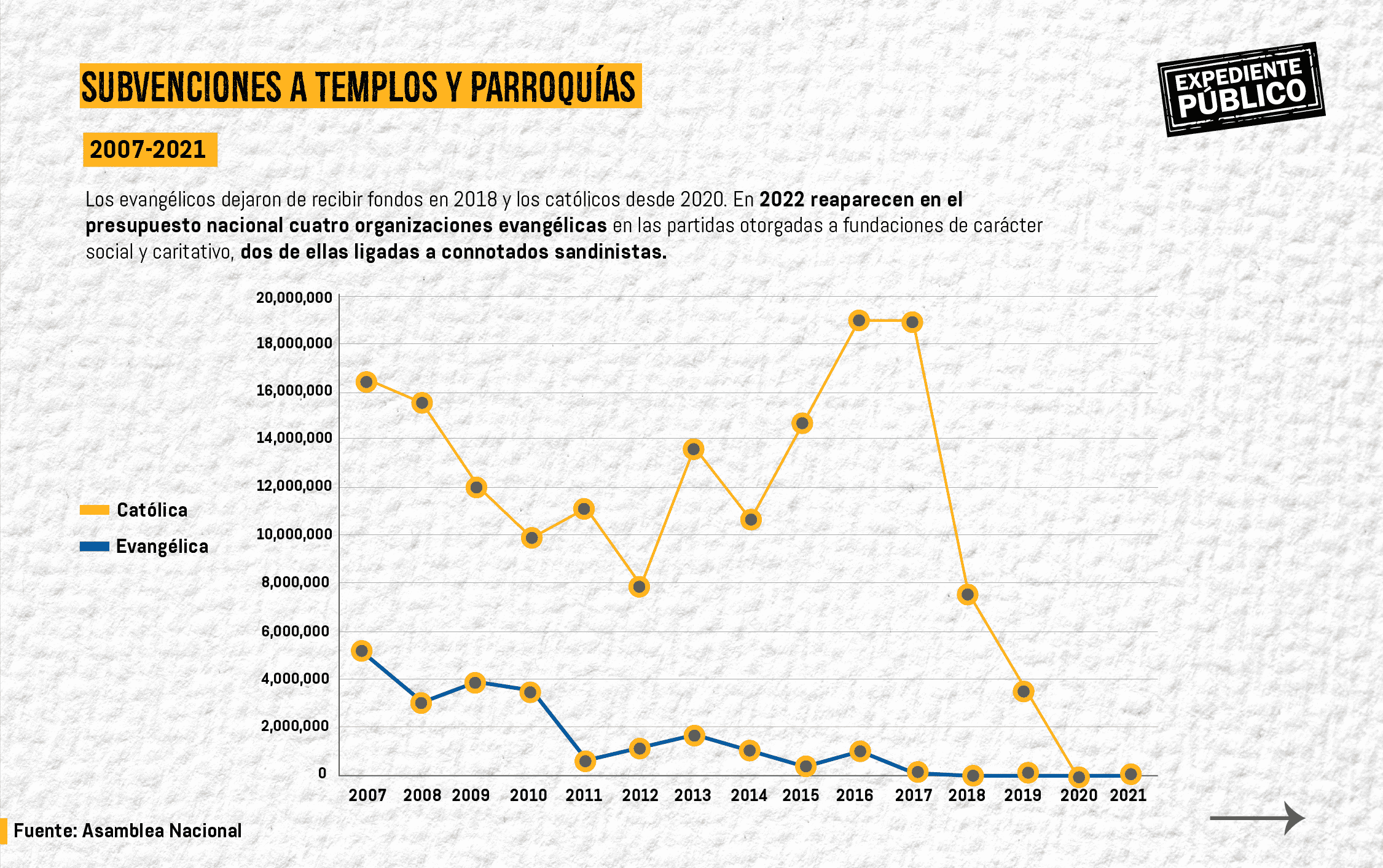El régimen presupuestó entre 2007 y 2017 un total de C$21,370,000 en subvenciones para las iglesias evangélicas, unos 890 mil dólares al cambio promedio de la época, donde los principales beneficiados fueron al final los gremios de pastores más mediáticos. Sin embargo, desde 2018 eliminó todo tipo de fondos. En comparación, las parroquias católicas recibieron 161,195,430 córdobas de 2007 hasta 2019, alrededor de USD6.4 millones al promedio cambiario.