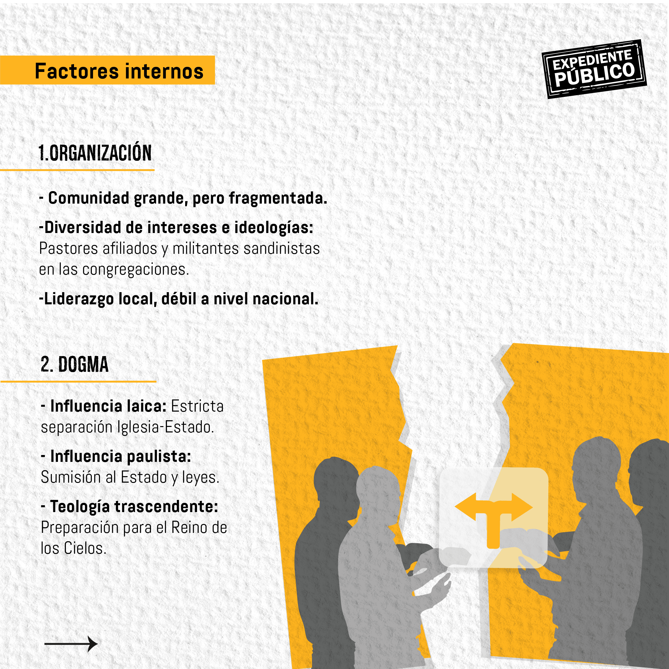 Los intereses de la iglesia evangélica son amplios, desde las propiedades de templos, proyectos sociales, hospitales o clínicas, fundaciones, inmuebles, más de 70 radioemisoras, tres universidades. Solo las Asambleas de Dios, probablemente la denominación más grande entre los evangélicos de Nicaragua, cuentan con 1,378 templos y 1,805 pastores para más de 287 mil miembros, según su portal digital.