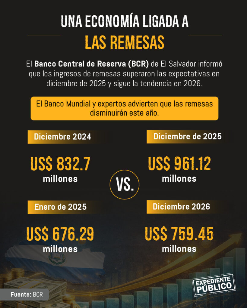 Por su parte, el Banco Central de Reserva (BCR) de El Salvador informó que el ingreso de remesas familiares alcanzó los US$ 759.4 millones en enero de 2026.